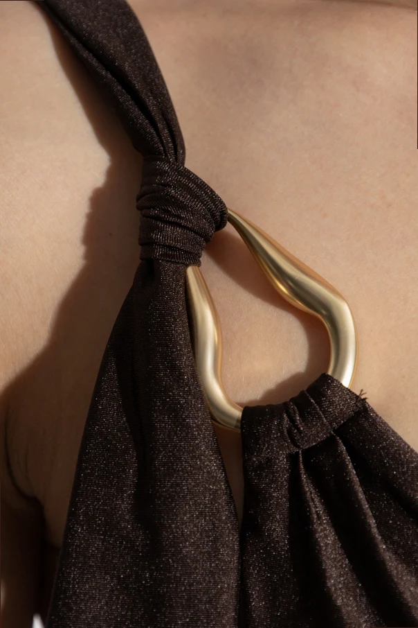 Góra od kostiumu kąpielowego marki Zimmermann to wyraz wyjątkowej elegancji. Asymetryczna forma z jednym ramiączkiem subtelnie modeluje sylwetkę i eksponuje ramię, zapewniając znakomite dopasowanie dzięki kunsztownemu krojowi. Gładka, jednolita powierzchnia w głębokim odcieniu brązu została wykonana z elastycznego, wysokogatunkowego materiału o delikatnym błysku, który wytwornie podkreśla linię ciała.