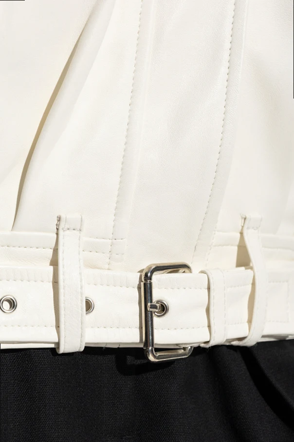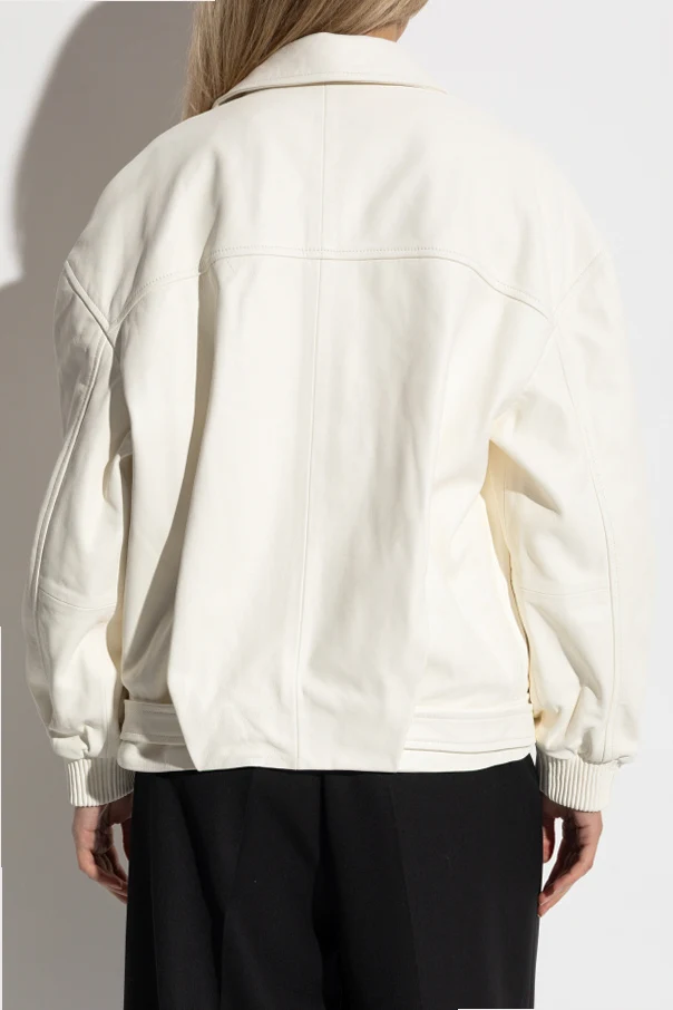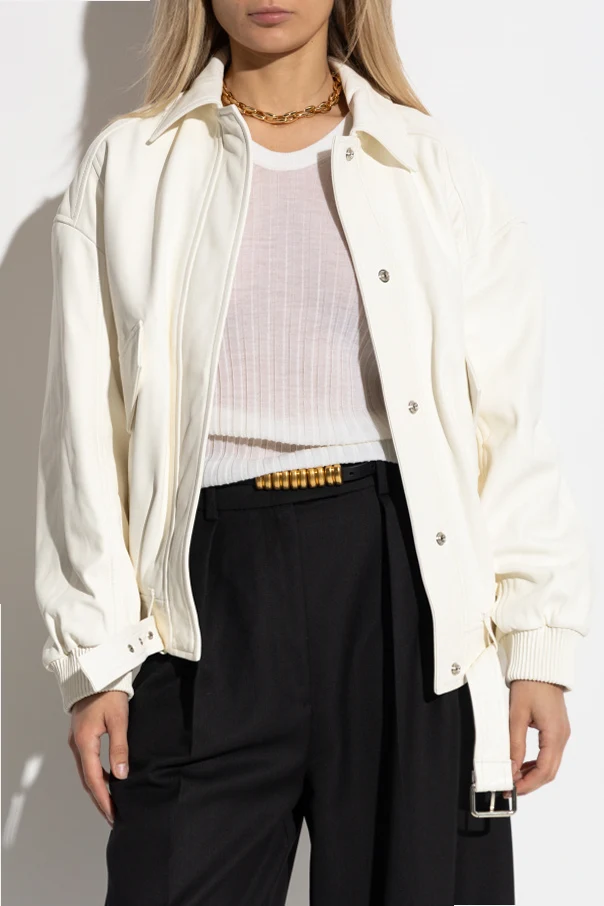Szerokie rękawy zakończone elastycznymi ściągaczami, dwie obszerne, ukośne kieszenie z klapami oraz zapięcie na napy subtelnie ukryte pod plisą to znaki rozpoznawcze kurtki. Całość dopełnia szeroki pasek z tej samej skóry, podkreślający wdzięk sylwetki. Projekt autorstwa Iro zachwyca mistrzowskim połączeniem nieprzemijającej klasy i awangardowego charakteru.