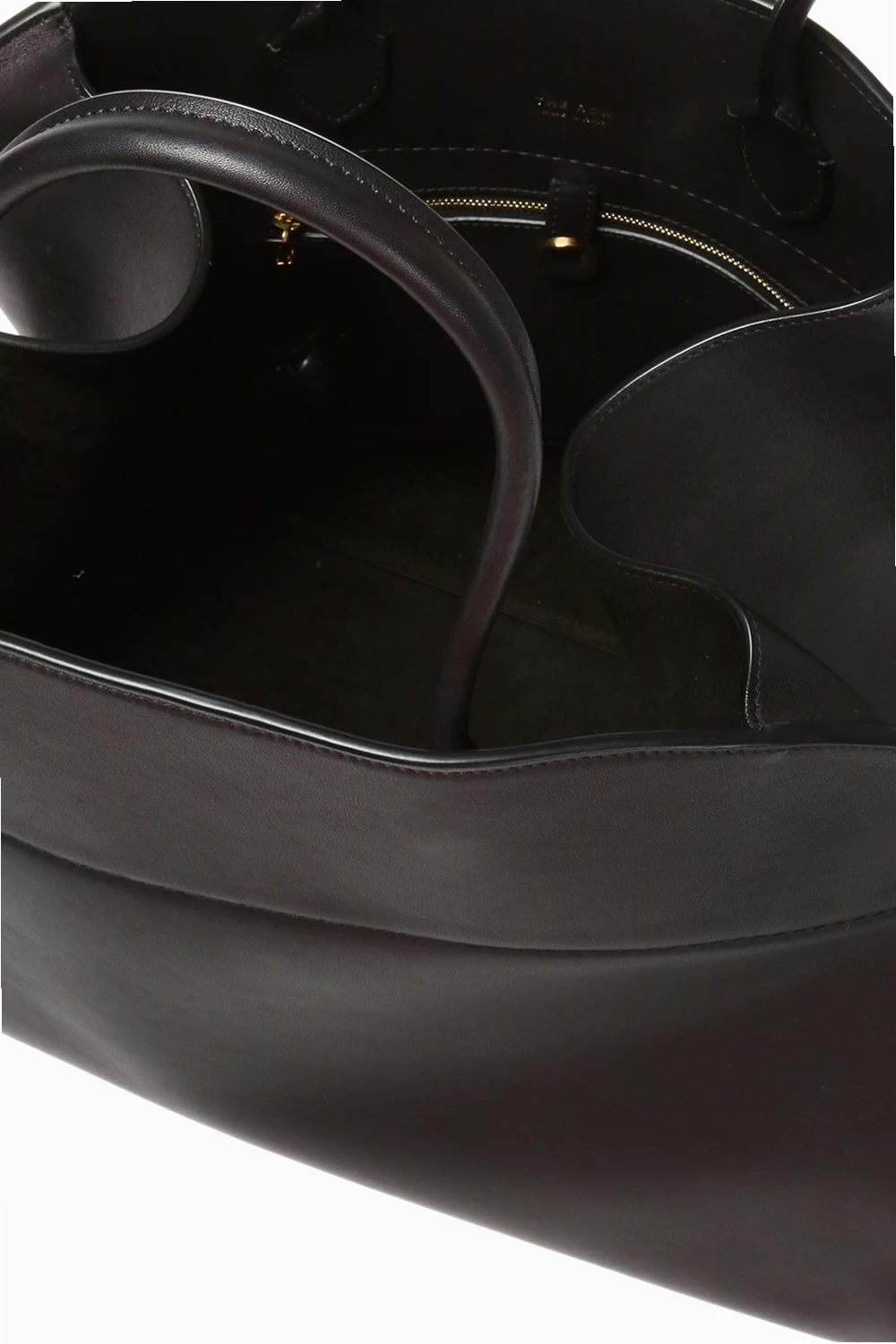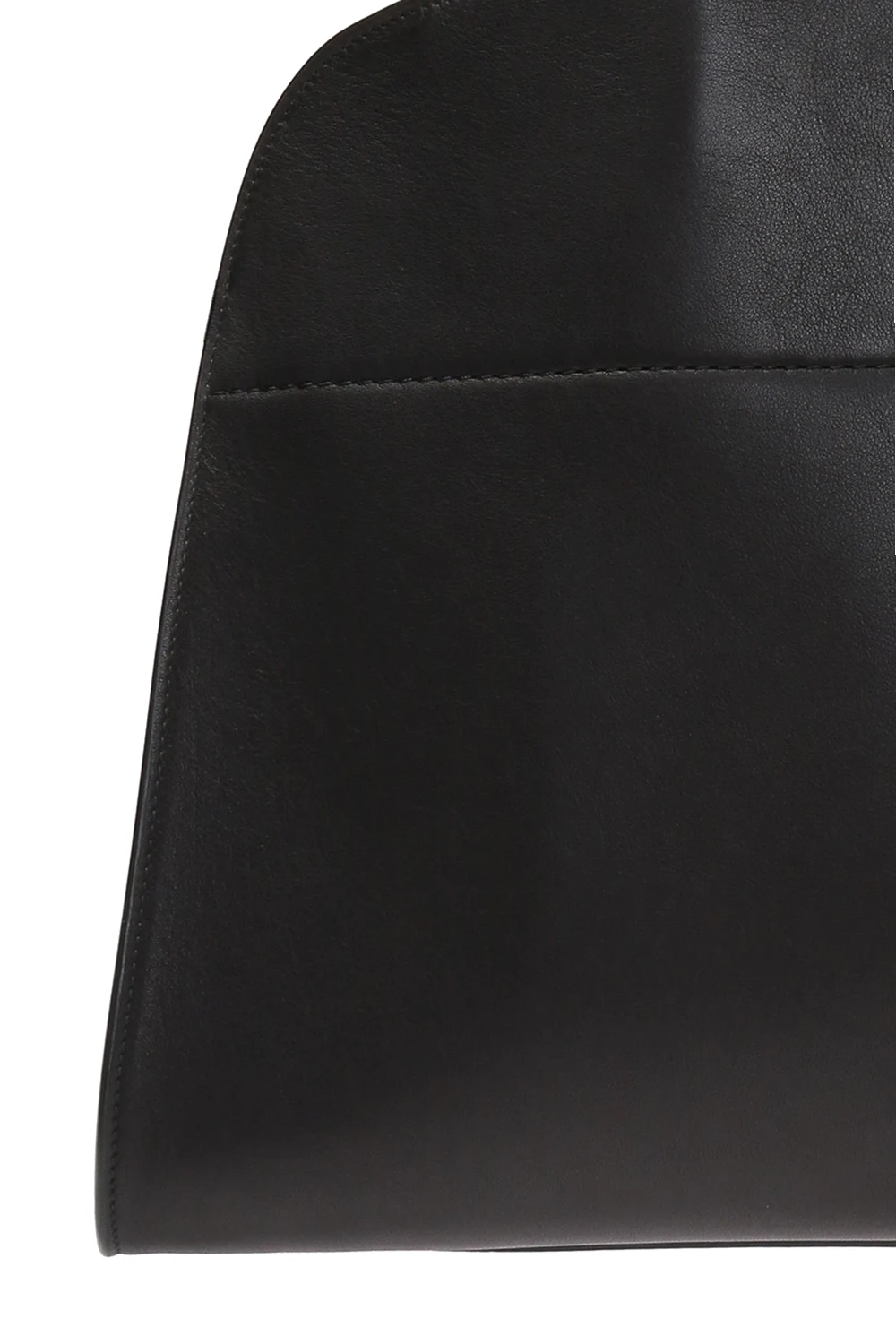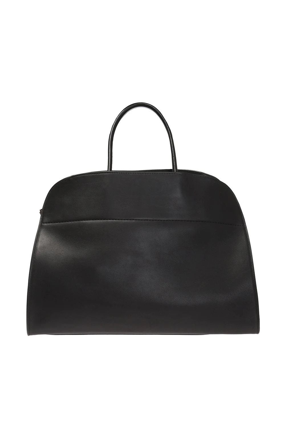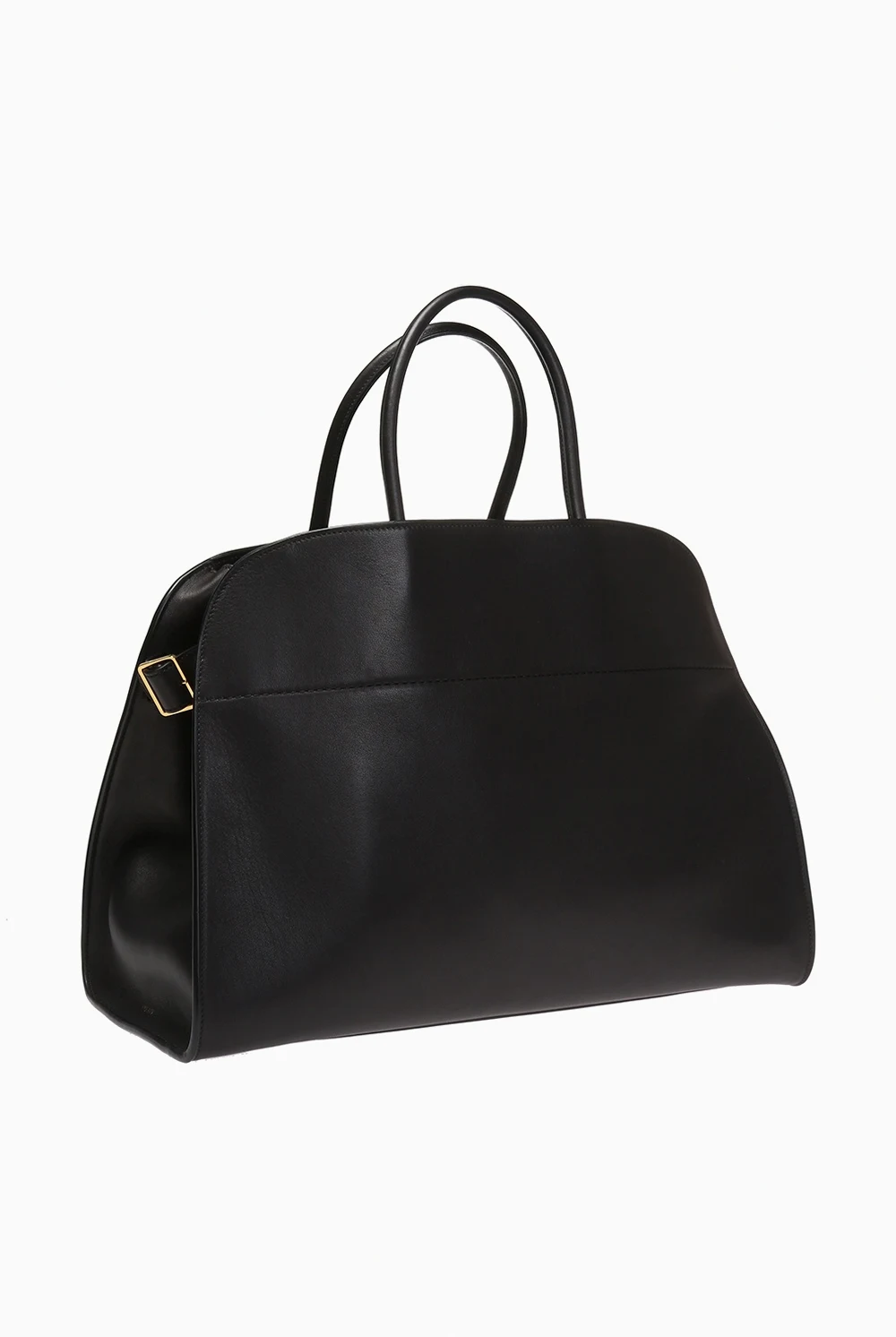 Czarna torba do ręki, model 'Margaux 17' The Row. Wykonana z gładkiej skóry cielęcej. Zamykana na zaczep. Z boku wytłoczone logo oraz skórzane paski z metalowymi klamrami. Dwie półokrągłe rączki. Warstwa wewnętrzna wykonana z cielęcej skóry i zamszu w kolorze czarnym. Wewnątrz komora i trzy kieszenie, jedna zamykana na zamek. Metalowe wykończenie w kolorze złotym.