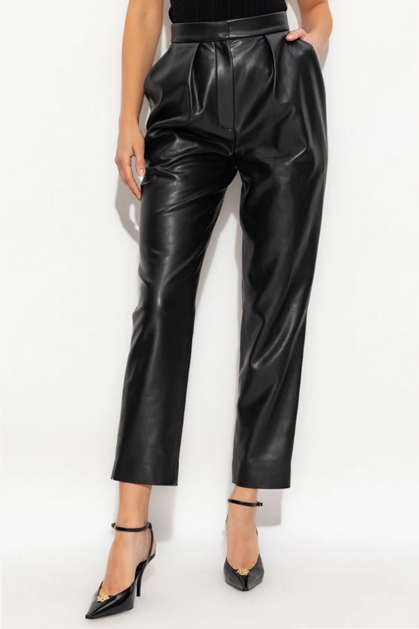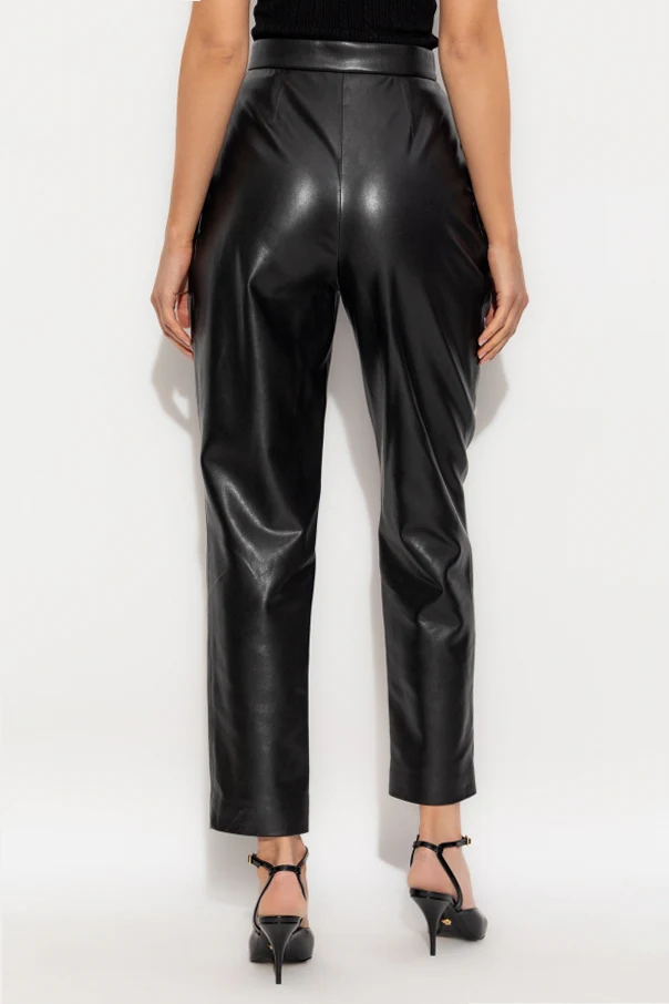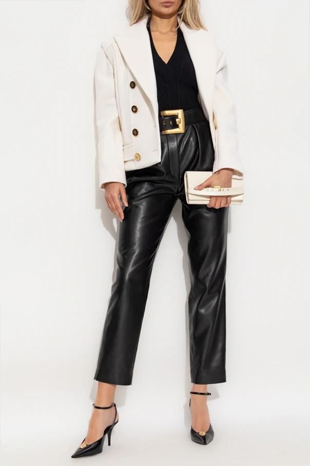 Spodnie ze skóry wegańskiej marki Balmain to połączenie wyrafinowanej elegancji z nowoczesnym podejściem do luksusu. Wykonane z wyszukanej wiskozy o gładkim, lekko połyskującym wykończeniu, zachwycają miękkością i wyjątkowym układaniem się na sylwetce. Klasyczny fason z lekko zwężanymi nogawkami ku dołowi oraz wysoki stan subtelnie podkreślają talię, modelując kobiecą figurę w duchu francuskiej tradycji haute couture.