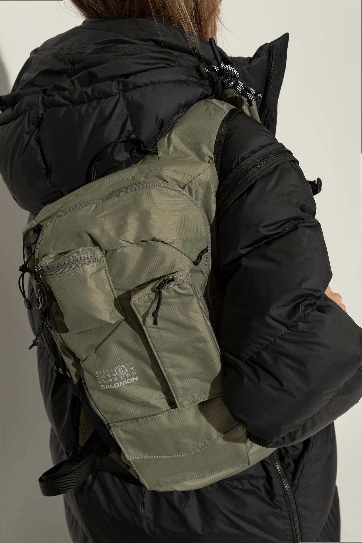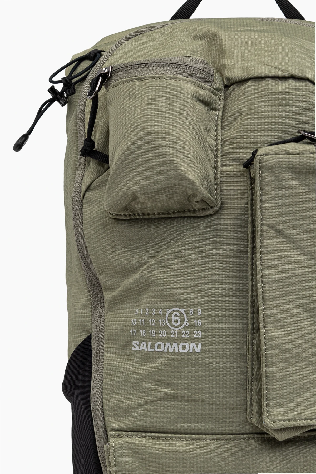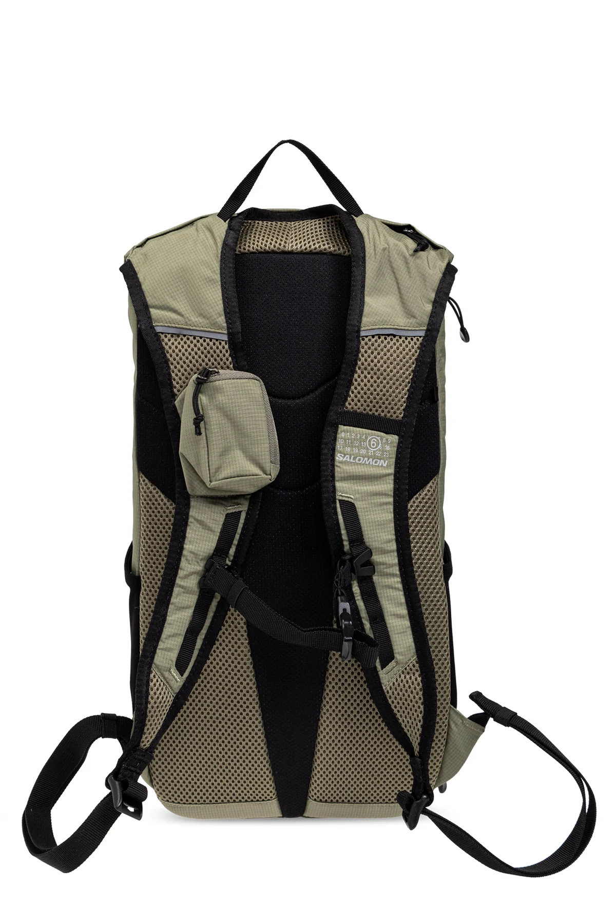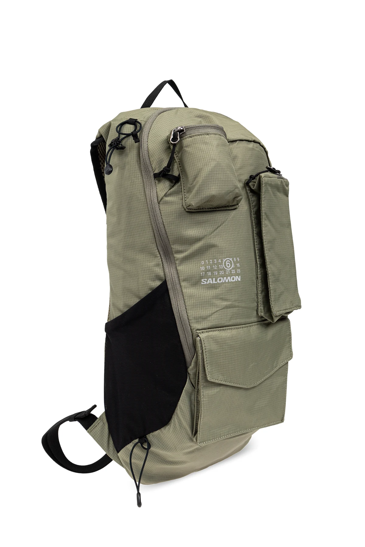 Wykonany z wytrzymałego materiału o drobnej fakturze, przypominającej ripstop, plecak jest odporny na rozdarcia. Logo MM6 Maison Margiela oraz Salomon w białym kolorze kontrastuje z zielenią, a czarne detale dodają mu elegancji. Wnętrze plecaka kryje przestronną komorę główną z przegródkami i miejscem na bukłak, co czyni go idealnym dla miłośników biegania.