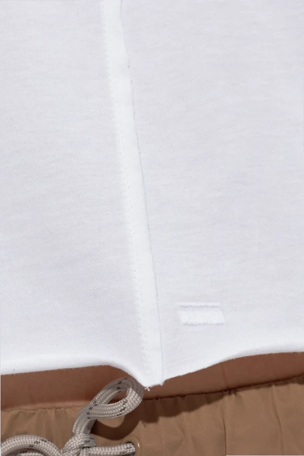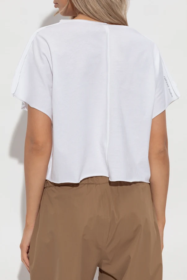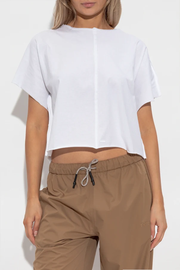 T-shirt z logo autorstwa Rethinkit Studios to wyrafinowany przejaw współczesnej elegancji. Utrzymany w czystej, białej tonacji, zachwyca nietuzinkowym fasonem typu boxy fit, charakteryzującym się swobodnym, lekko oversize’owym krojem oraz krótszą długością. Luźno opadające, szerokie rękawy dopełniają całości, zapewniając wygodę i swobodę ruchów.