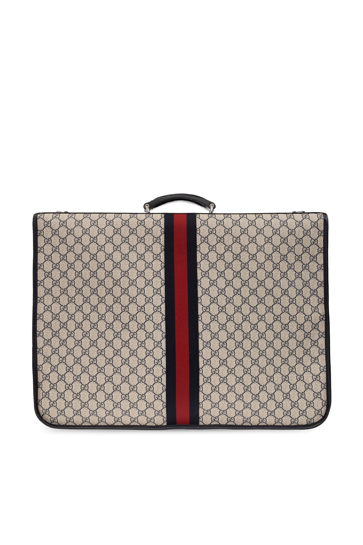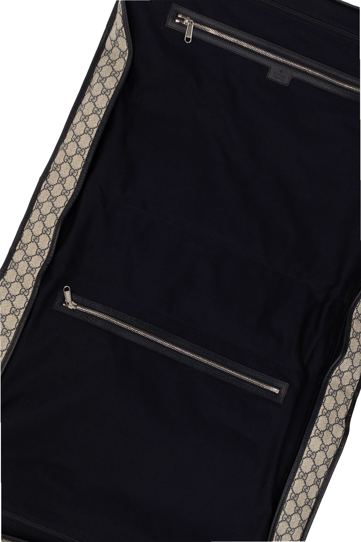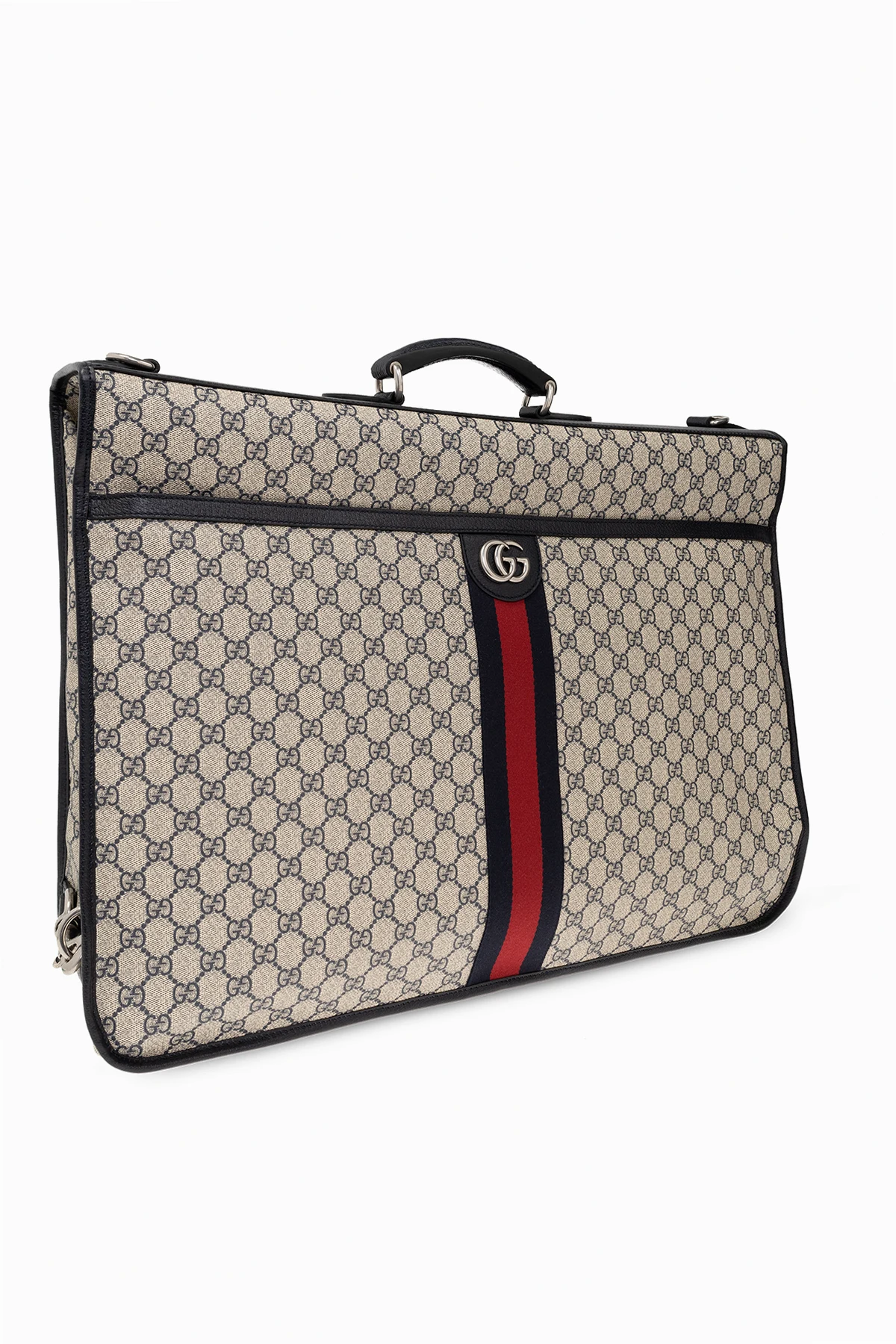 Kremowo-granatowy pokrowiec na ubrania Gucci. Wykonany z płótna ‘GG Supreme’ i wykończony skórą cielęcą. Zamykany na dwa karabińczyki po bokach. Ozdobiony charakterystycznym dla marki pasem z motywem ‘Web’ w kolorze granatowo-czerwono-granatowym. Z przodu aplikacja z logo ‘Double G’ i kieszeń zamykana na zamek. Krótka rączka oraz odpinany pas na ramię z możliwością regulacji długości. Dołączone dwie zawieszki: z identyfikatorem oraz z chowaną kłódką i kluczykami. Wewnątrz komora z wieszakiem zamykana na zamek oraz dwie kieszenie z zamknięciem na zamek. Metalowe wykończenie w kolorze srebrnym.