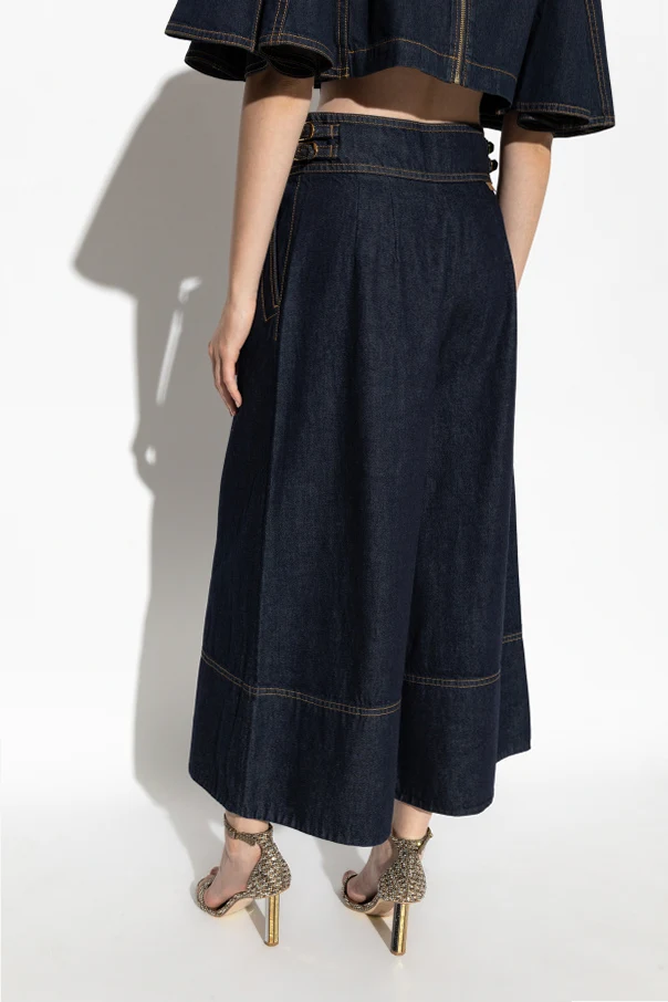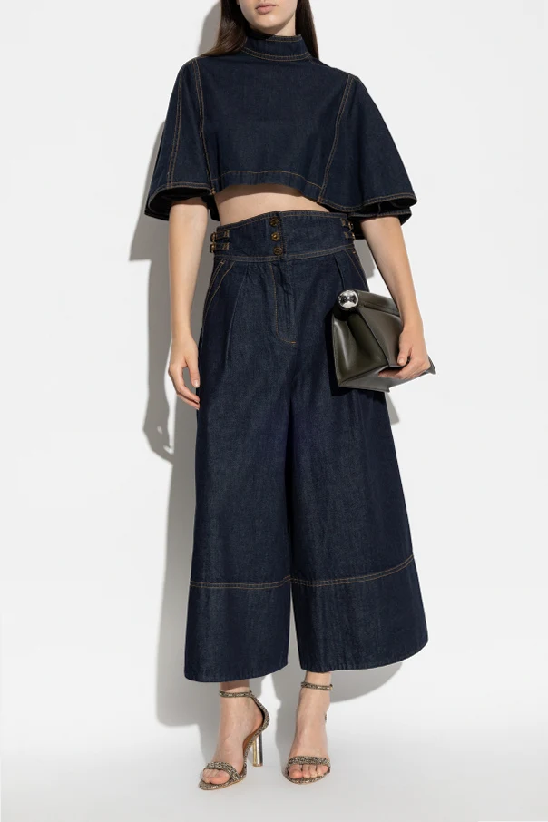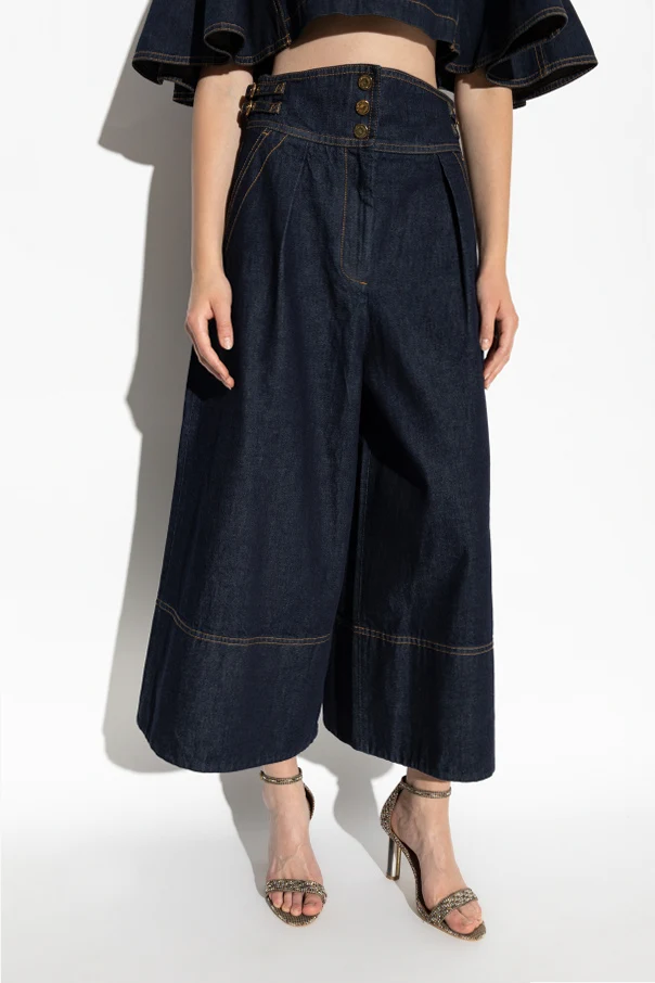 Jeansy z szerokimi nogawkami autorstwa marki Zimmermann stanowią kunsztowny manifest nowoczesnej elegancji. Zdecydowanie proste, szerokie nogawki typu bootcut dodają sylwetce niezapomnianego charakteru, delikatnie rozszerzając się ku dołowi i opadając tuż za kostkę. Wysoki stan z szerokim pasem pięknie podkreśla talię, a dwie subtelne sprzączki po bokach wprowadzają ekskluzywny, wyrafinowany akcent.