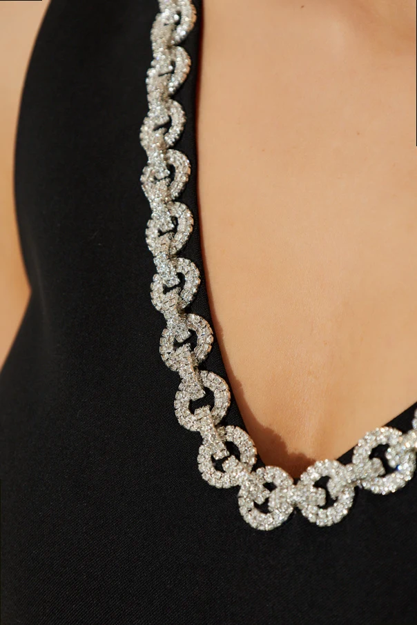 Najbardziej wyrazistym elementem tej kreacji jest bogata aplikacja kryształów, tworzących efektowny łańcuch przy dekolcie. Okrągłe, misternie połączone oczka olśniewają przy każdym ruchu, podkreślając luksusowy charakter sukienki.