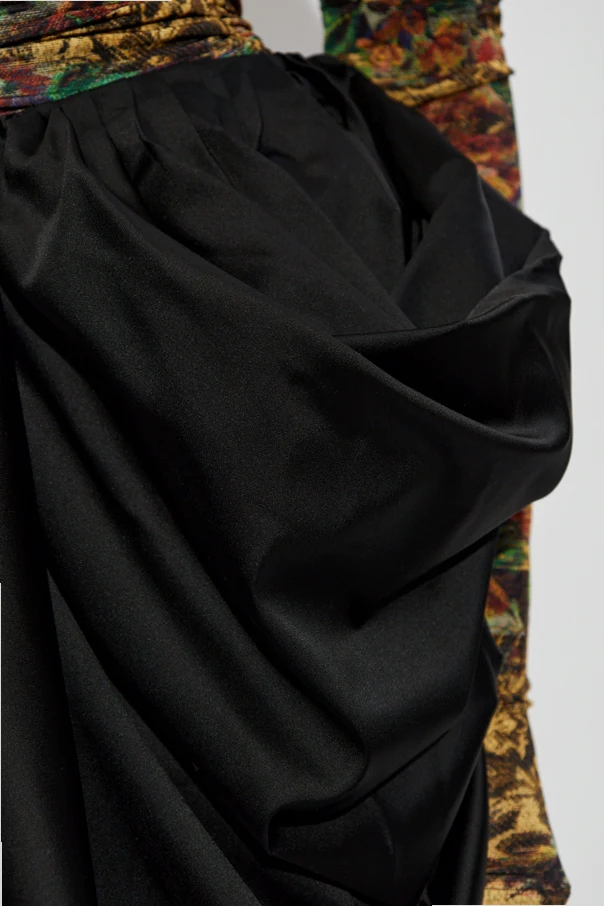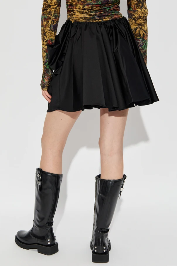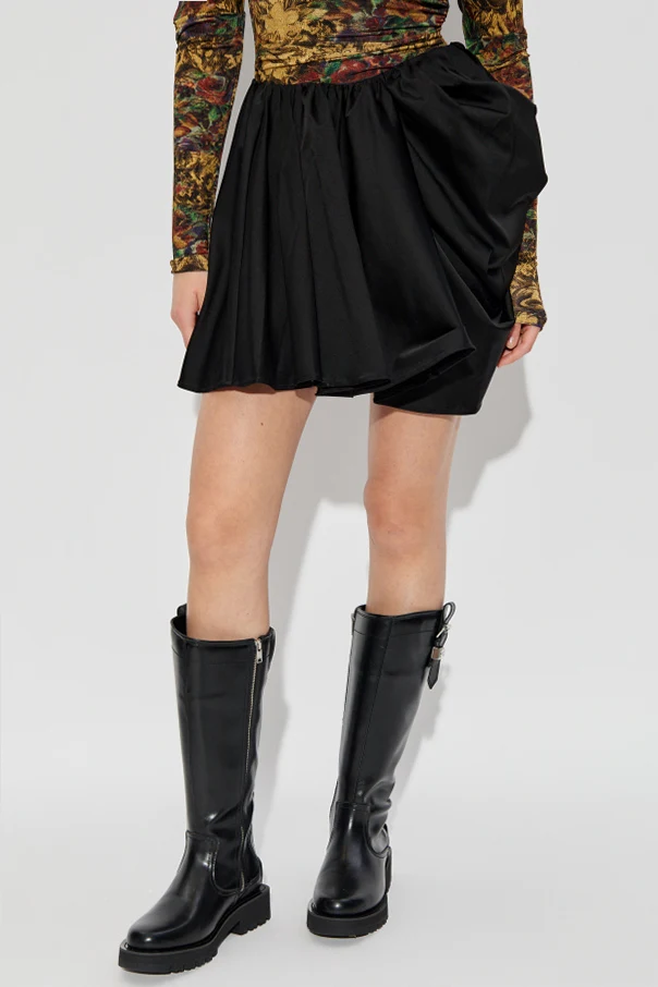 Drapowana spódnica marki Ganni to kwintesencja wyrafinowanej elegancji, która zachwyca niezwykle kobiecym charakterem. Jej czarny kolor doskonale współgra z rzeźbiarską formą – mocno rozkloszowany, krótki fason nadaje sylwetce lekkości i zmysłowego dynamizmu.