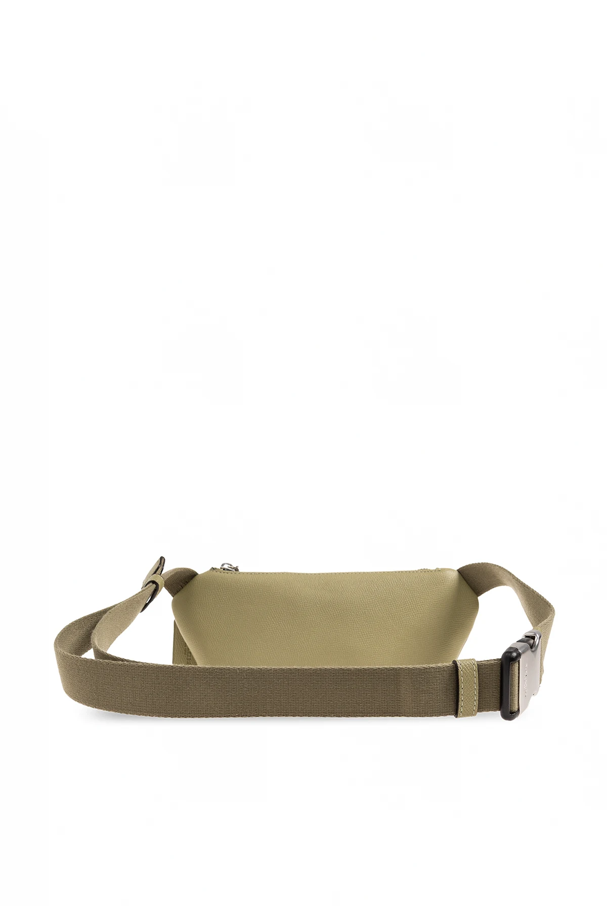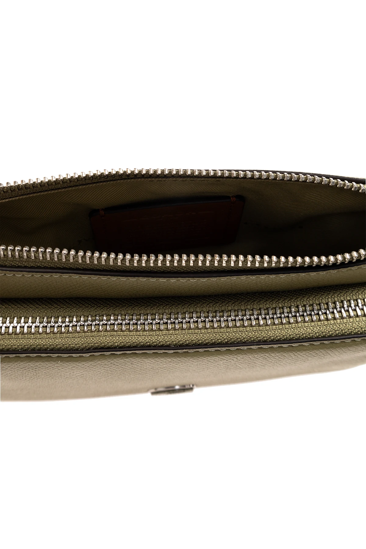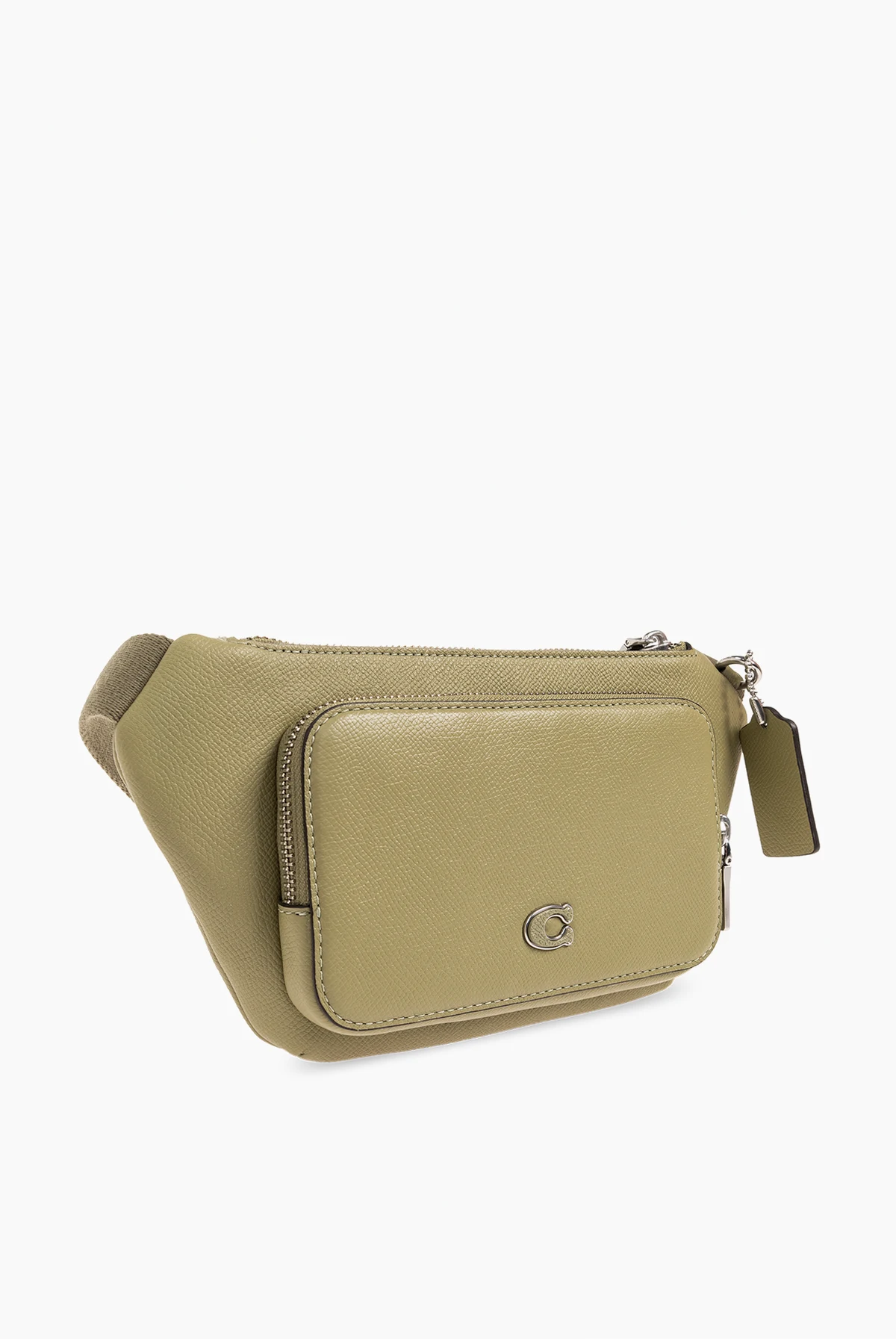 Zielona torba na pas Coach. Wykonana ze skóry o specjalnej fakturze. Zamykana na zamek. Z przodu aplikacja z metalowym logo oraz kieszeń zamykana na zamek. Pasek biodrowy z możliwością regulacji długości. Wewnątrz komora. Metalowe wykończenie w kolorze srebrnym.