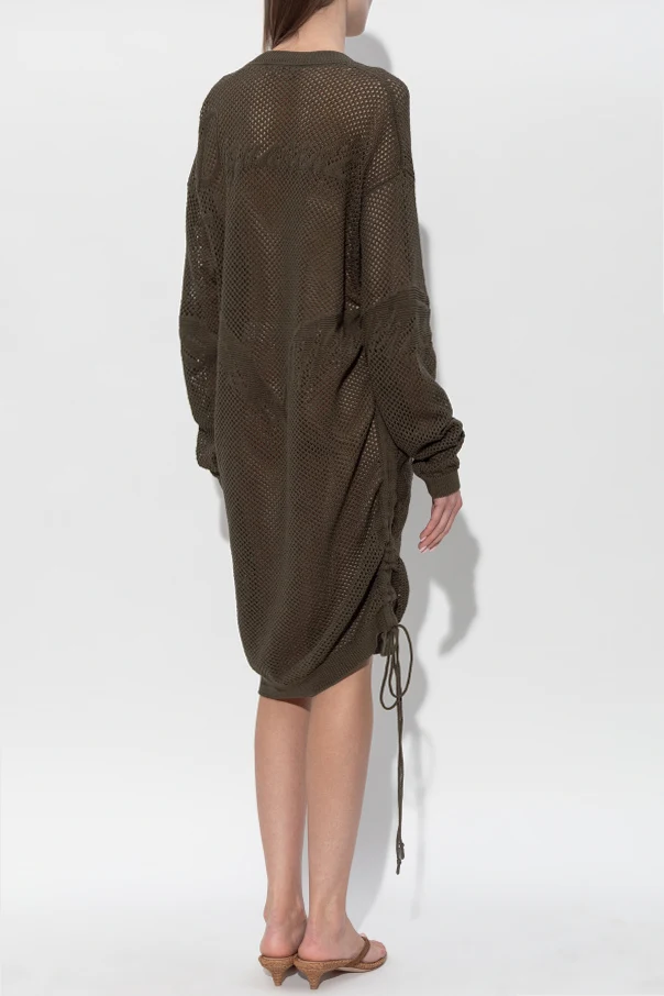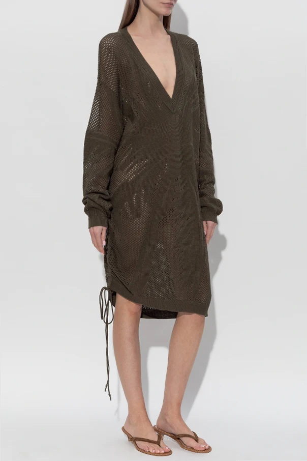 Kreacja została wykonana z delikatnej dzianiny bawełnianej o wyraźnym, ażurowym splocie, który gwarantuje niezwykłą przewiewność oraz subtelną lekkość. Swobodny fason z wydłużonymi rękawami, długością do kolan oraz nienachalnie zaznaczoną linią ramion podkreśla nonszalancki charakter projektowanego modelu. Uwagę przyciąga głęboki dekolt „V”, nadający całości znamion wyrafinowanego stylu.