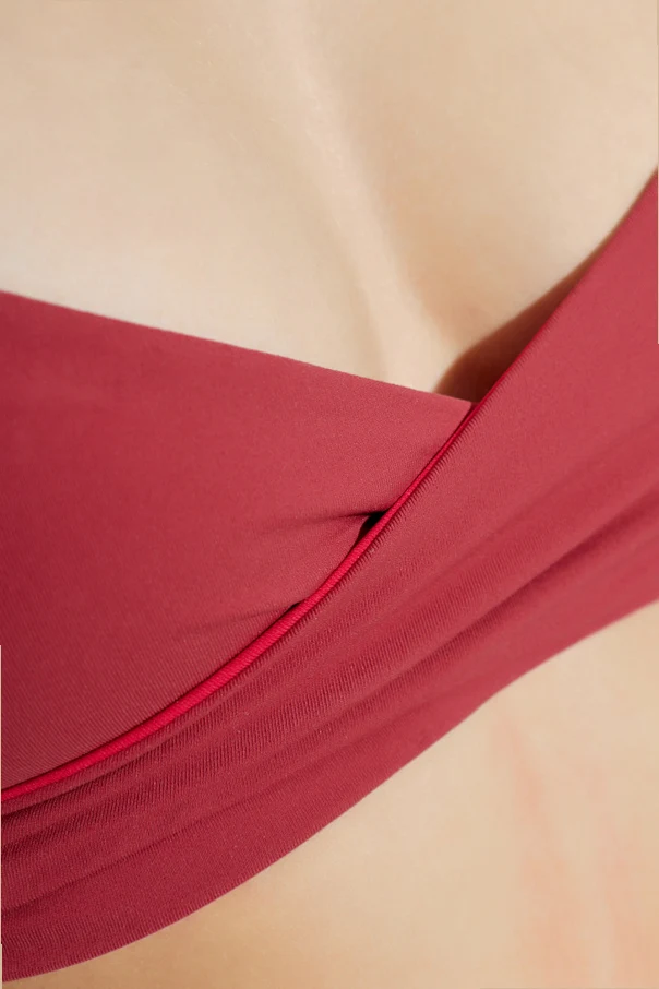 Dwustronna góra od kostiumu kąpielowego Amira sygnowana przez renomowaną markę Bond-Eye to kwintesencja australijskiego luksusu i minimalizmu. Ten wyjątkowy model, utrzymany w intensywnej barwie czerwonej, zachwyca kunsztowną prostotą formy oraz przemyślaną konstrukcją. Subtelne krzyżowanie materiału na przodzie, delikatne marszczenie i nachodzące na siebie panele pięknie podkreślają linię biustu, natomiast cienkie, regulowane ramiączka pozwalają idealnie dopasować stanik do sylwetki.