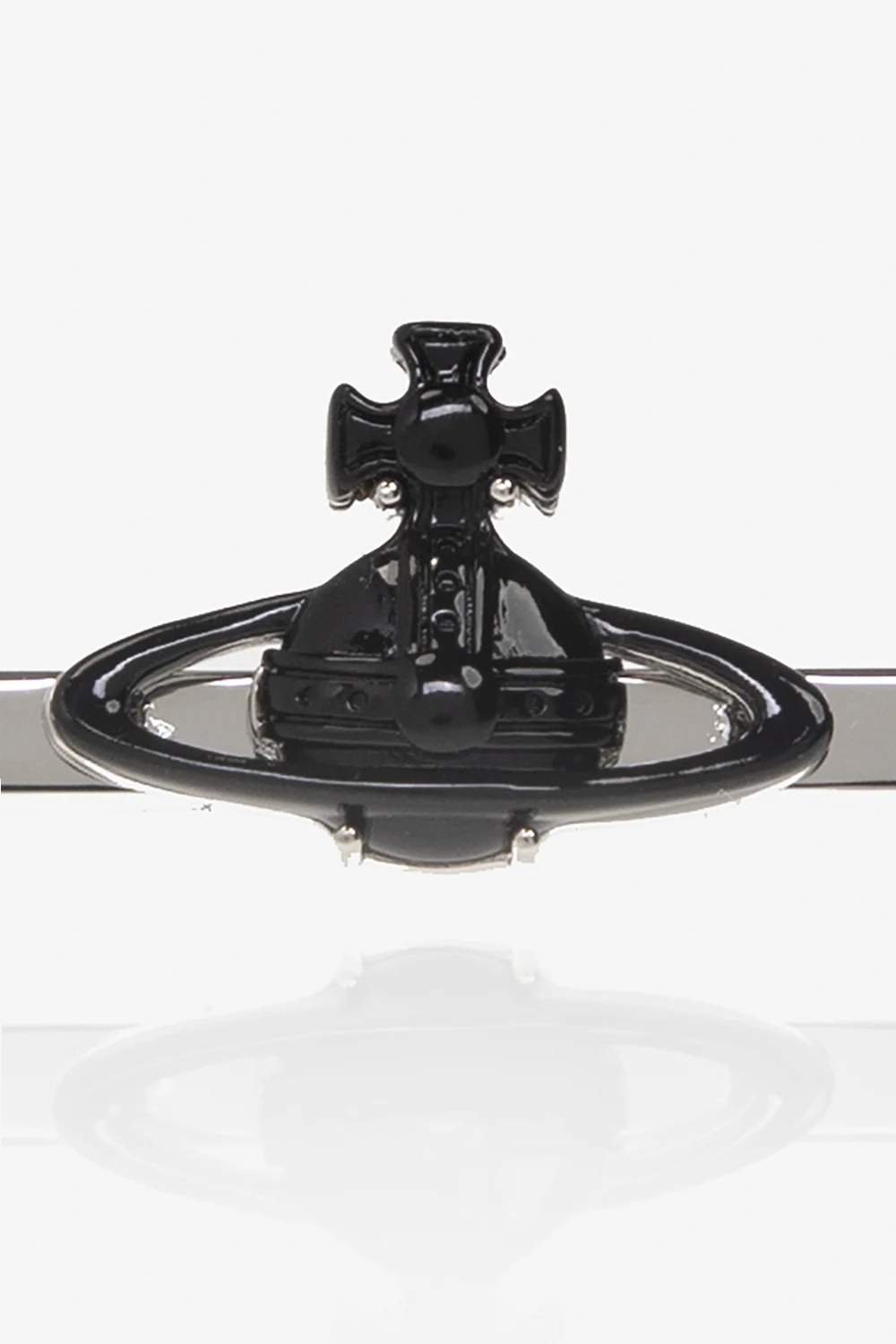 Spinka do krawata w kolorze srebrnym Vivienne Westwood. Wykonana z mosiądzu. Ozdobiona aplikacją w kształcie logo wykończoną czarną emalią.