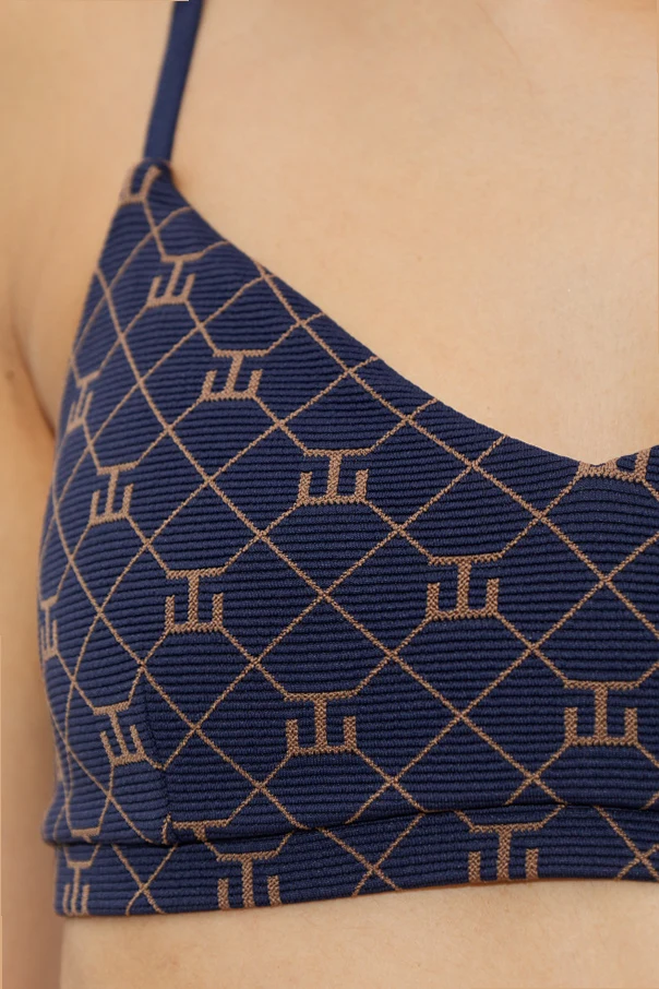 Granatowy odcień materiału zdobi geometryczny, jasnobrązowy wzór, tworzący efektowaną siatkę na całej powierzchni dzianiny. Elastyczna, sportowa prążkowana dzianina nie tylko podkreśla sylwetkę, lecz także zapewnia niezrównany komfort podczas ruchu, dostosowując się do ciała z wyjątkową precyzją.