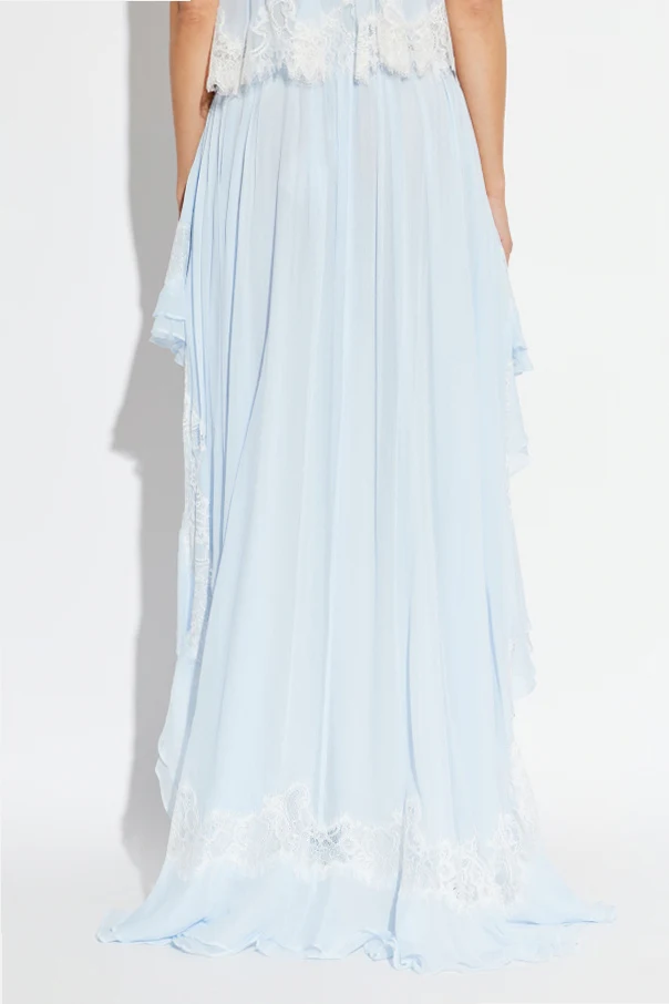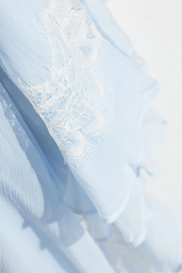 Spódnica utrzymana jest w jednolitym, niebieskim odcieniu, bez widocznych nadruków. Subtelności dodaje miękka, ażurowa koronka w odcieniu białym lub ekri, finezyjnie wszyta przy dolnych krawędziach i w części górnej. Szlachetny, półprzezroczysty jedwab z delikatną fakturą warstwy zewnętrznej pięknie układa się w ruchu, zaś komfortowe wnętrze stanowi miękki poliester.