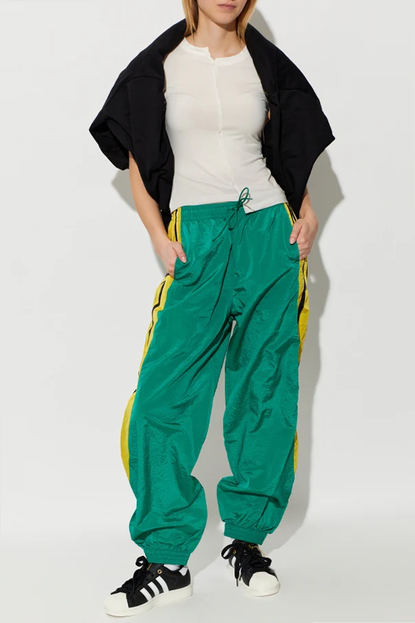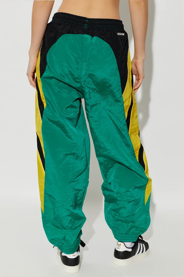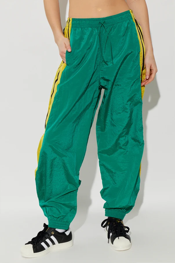 Wzrok przyciągają charakterystyczne detale – szerokie, żółte oraz czarne pasy z rozpoznawalnymi trzema paskami na żółtym tle, umieszczone po bokach nogawek. Z tyłu kontrastuje czarny panel, nadając całości unikatowego charakteru.
