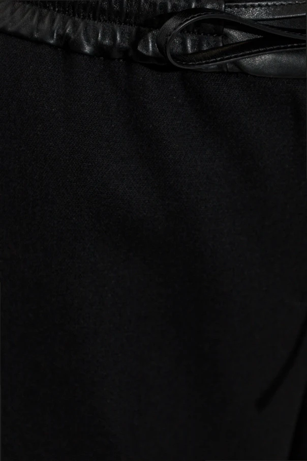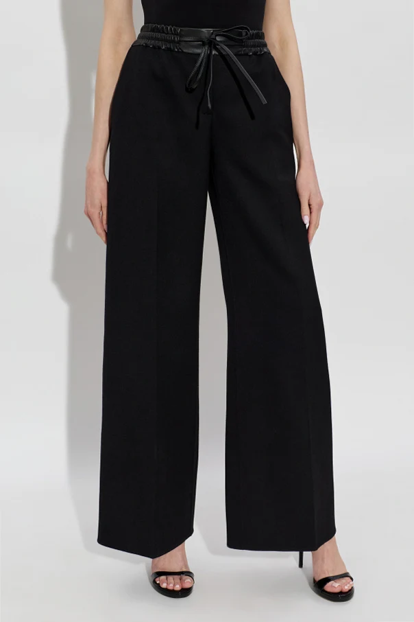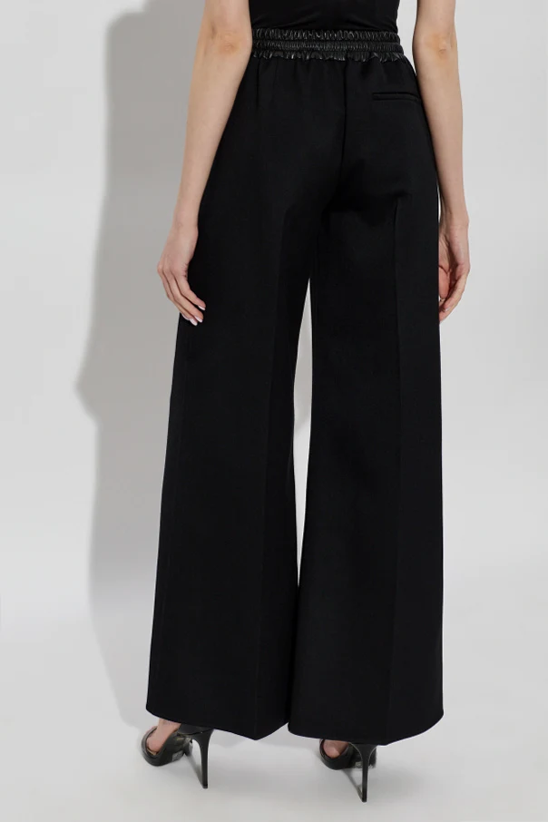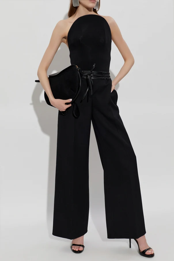 Wełniane spodnie ze skórzanym pasem od domu mody Alaïa to kwintesencja wyrafinowanej elegancji. Model w kolorze czarnym zachwyca szerokimi, prostymi nogawkami typu palazzo oraz wysoką, subtelnie zaakcentowaną talią. Pas wykonany z gładkiej skóry jagnięcej, wiązany w kokardę, nadaje całości unikatowego i luksusowego charakteru, jednocześnie pięknie eksponując kobiecą sylwetkę.