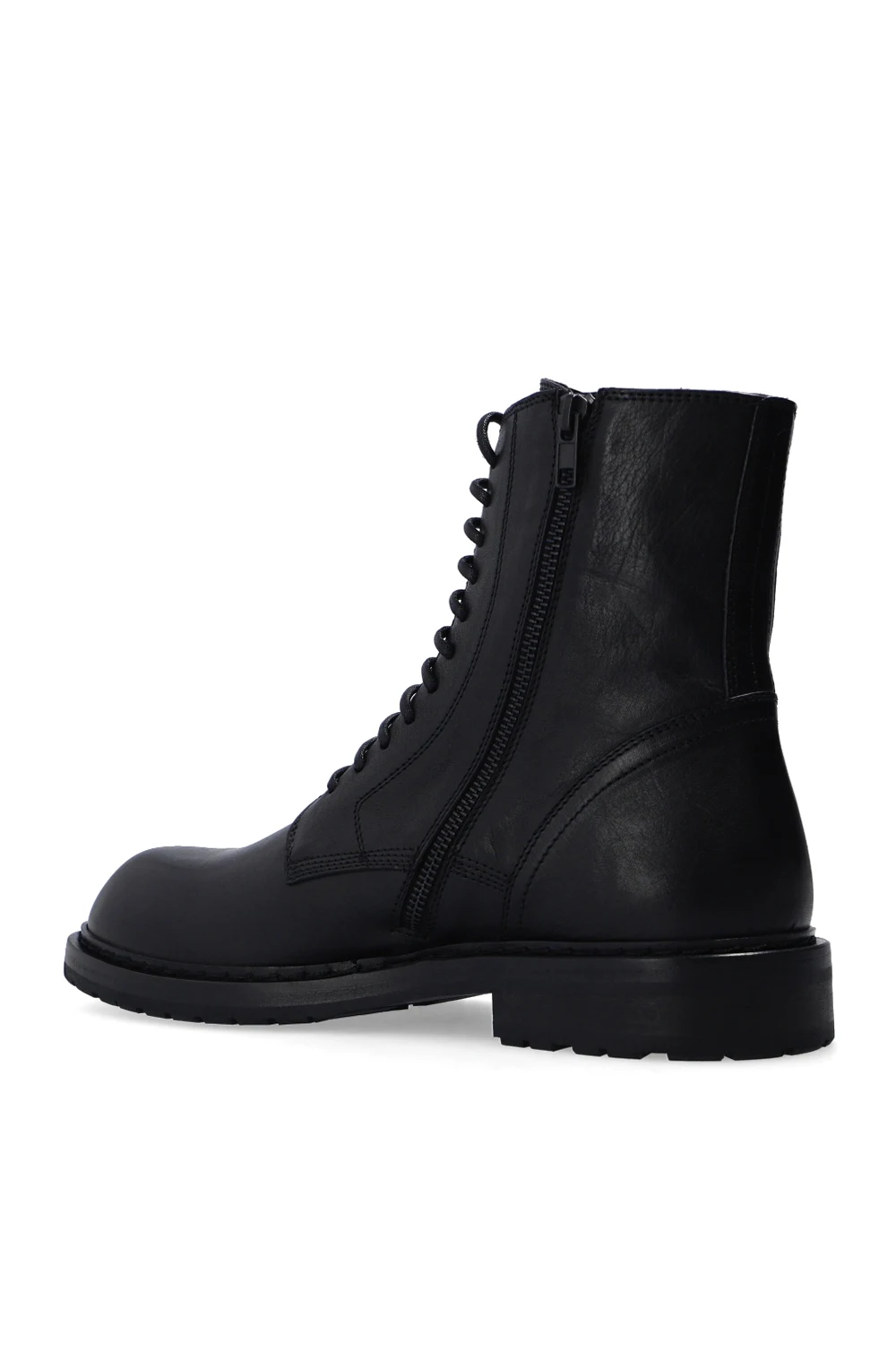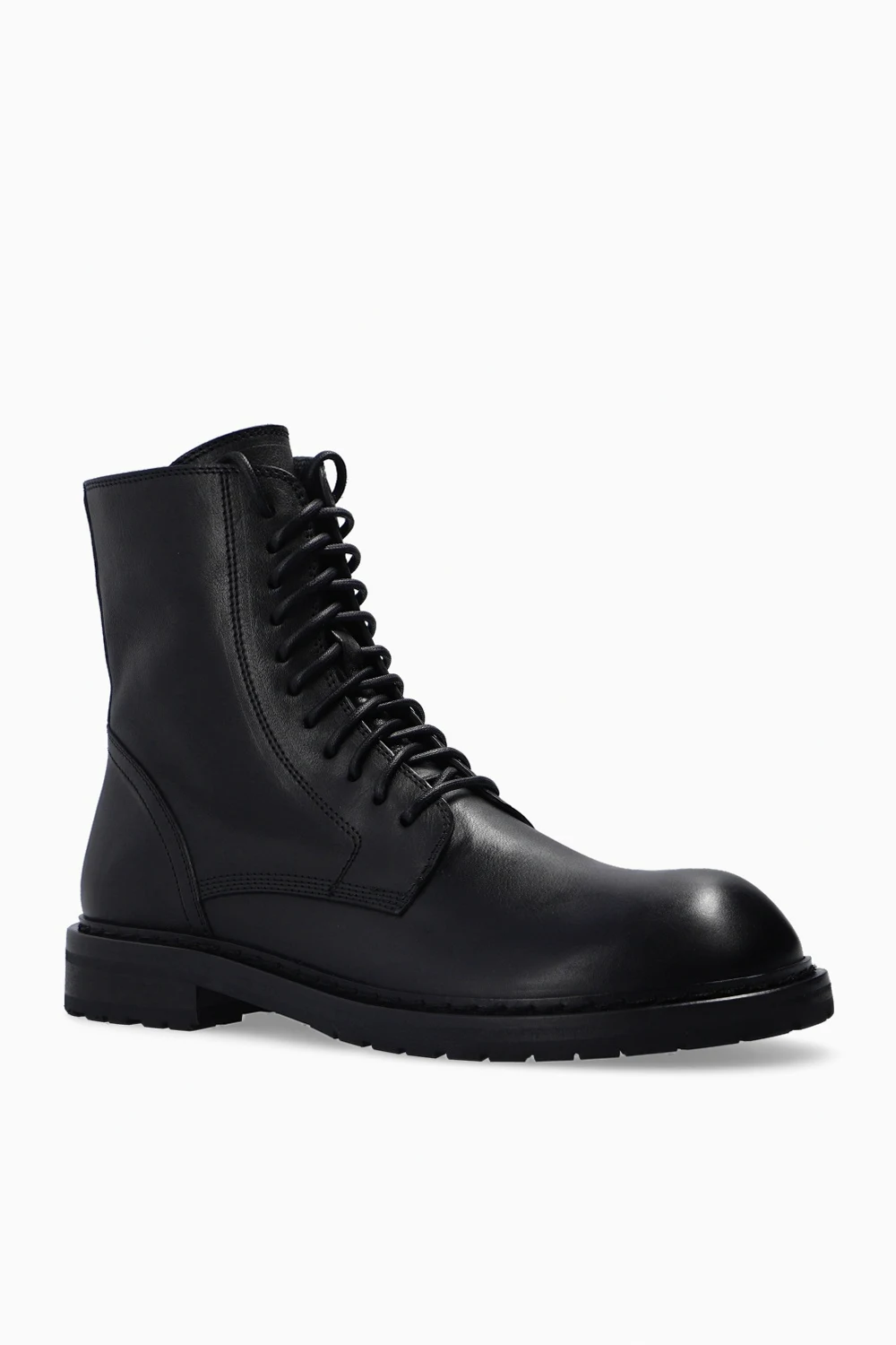 Czarne, sznurowane botki, model ‘Santiago’ Ann Demeulemeester. Wykonane ze skóry. Z boku zapinane na zamek. Czarna, gumowa podeszwa.