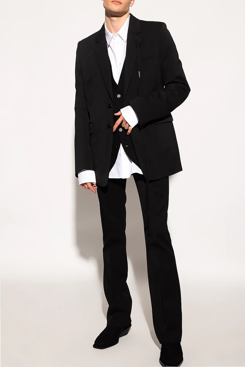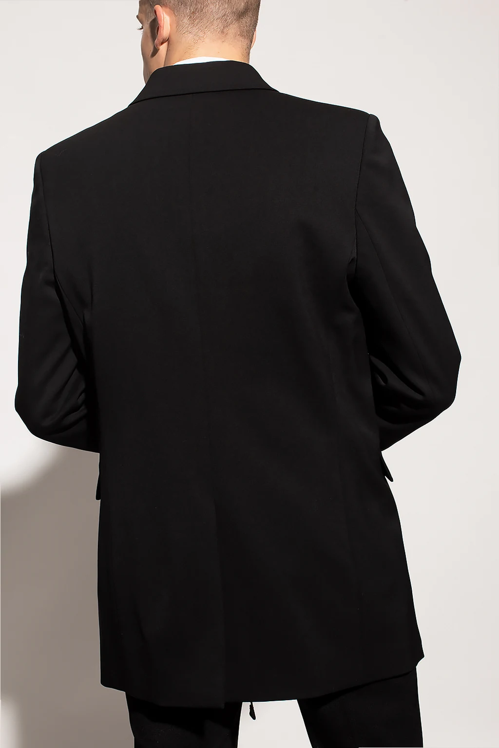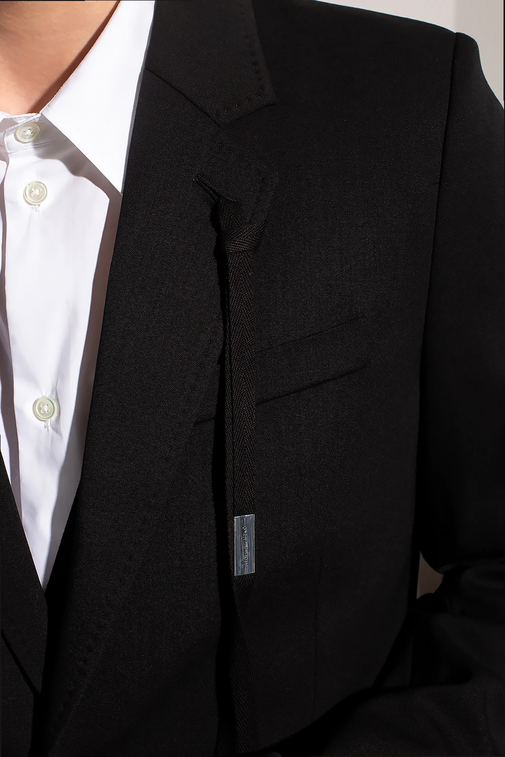 Czarna marynarka z otwartymi klapami, model ‘Alexander’ Ann Demeulemeester. Zapinana na guziki. Z przodu trzy kieszenie: dwie z patką. Dekoracyjne troki z aplikacją w kolorze srebrnym z wytłoczonym logo. Długie rękawy. Z tyłu pojedyncze rozcięcie.