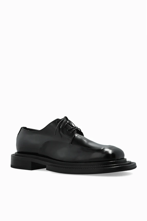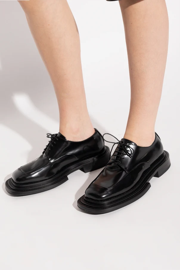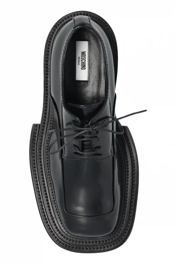 Buty typu „derby” autorstwa Moschino to połączenie zdecydowanej formy i nowoczesnej elegancji. Obuwie wyróżnia się masywnym, wyrazistym kształtem z szerokim, kwadratowym noskiem oraz mocno zarysowaną, pogrubioną podeszwą, która podkreśla unikatowy charakter projektu.