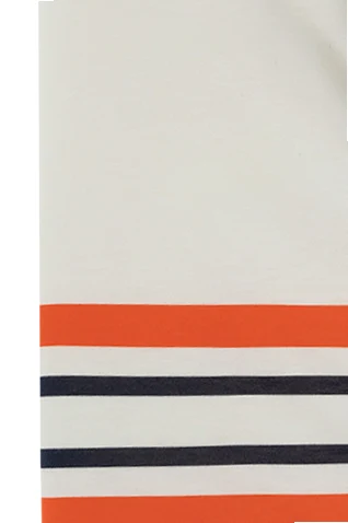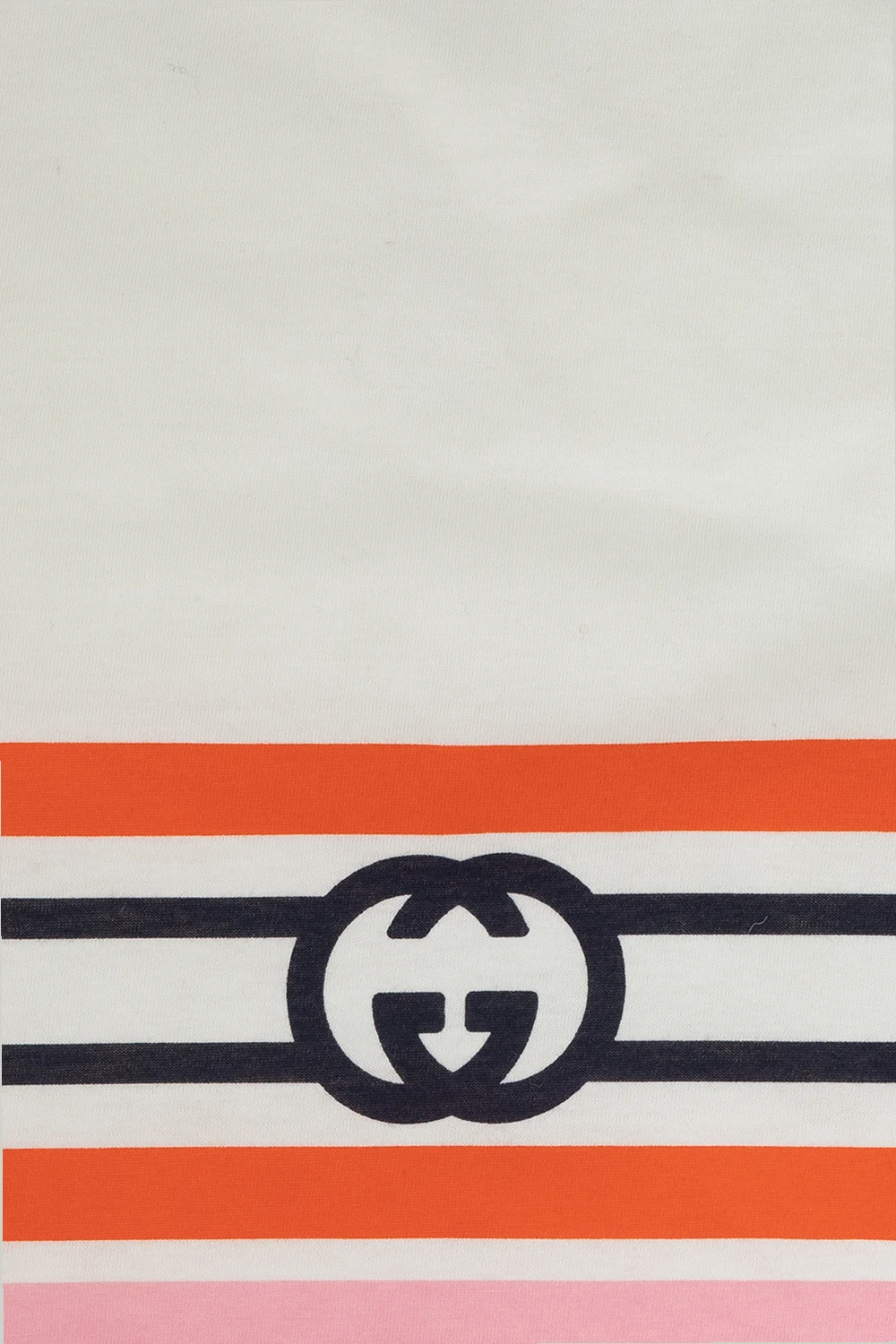 Biało-różowy koc Gucci Kids. Wykonany z bawełny. Ozdobiony wzorem w paski i logo w kolorze pomarańczowo-granatowym. Brzegi wykończone lamówką w kolorze granatowym.