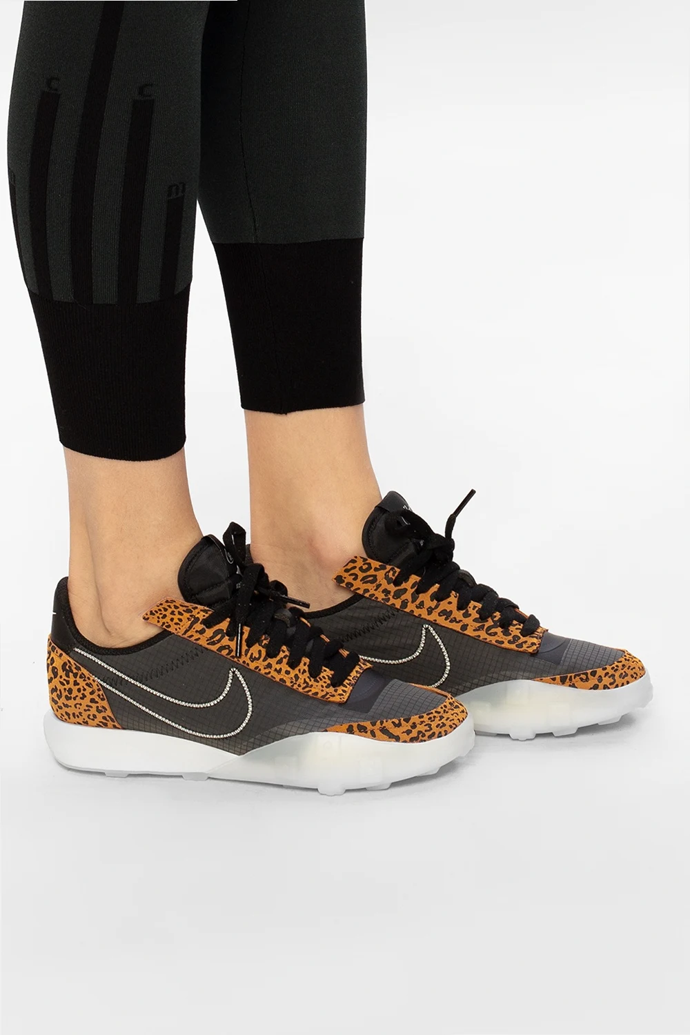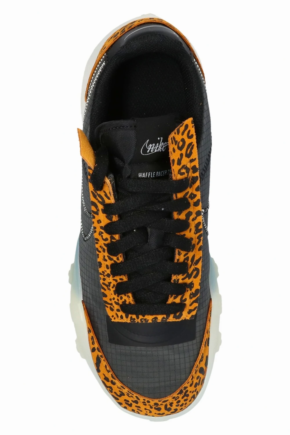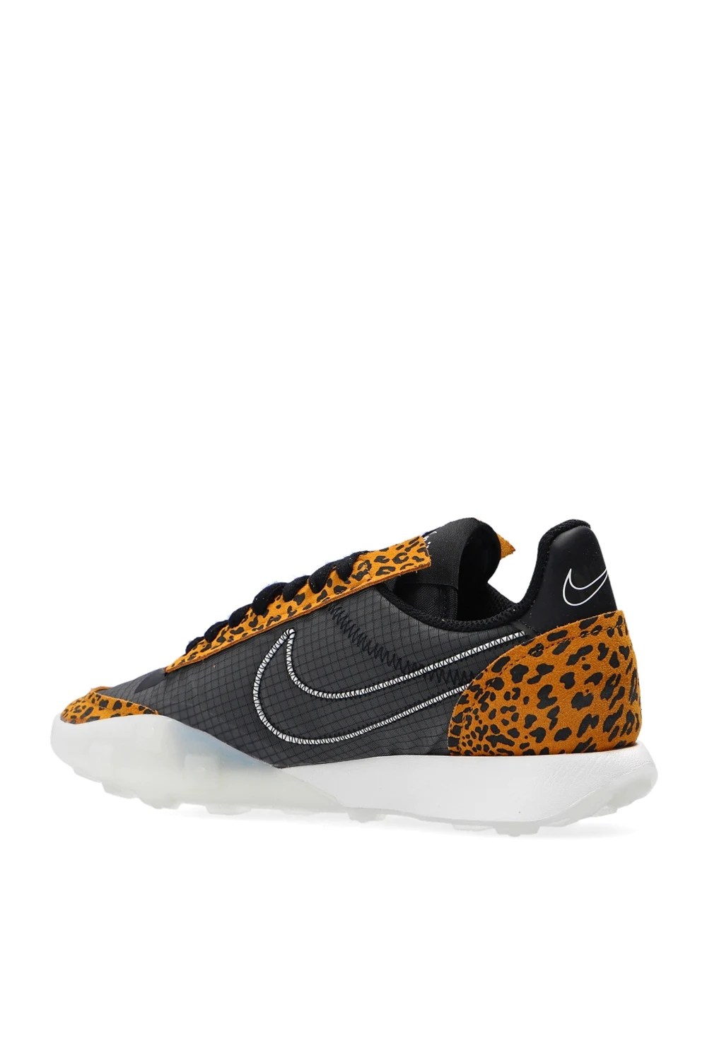 Ciemnoszaro-brązowe, sznurowane buty sportowe, model ‘Waffle Racer 2X’ Nike. Wykonane z innowacyjnego, trwałego materiału. Wstawki w kolorze jasnobrązowo-czarnym z nadrukowanym wzorem w cętki. Biało-czarna aplikacja z logo. Biało-kremowa, gumowa podeszwa z waflowym bieżnikiem i wypukłą liczbą ‘3793750’ - numerem patentowym. Model łączy klasyczne detale butów do biegania z cholewką inspirowaną mokasynami i kultową podeszwą. Inspirowany oryginalnym modelem ‘Waffle Trainer’ stworzonym przez współzałożyciela Nike, Billa Bowermana.