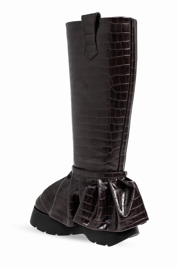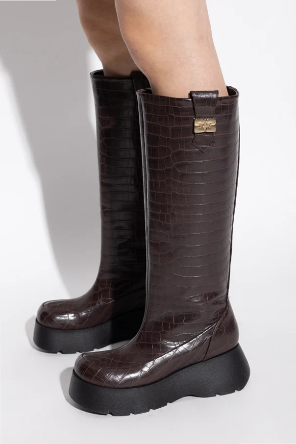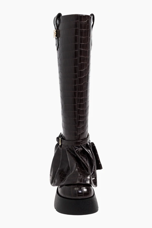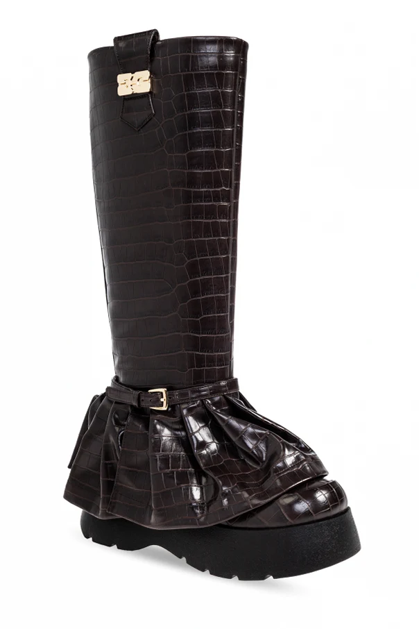 Buty na platformie autorstwa Ganni to arcydzieło współczesnego kunsztu obuwniczego, skierowane do osób ceniących wyrazistą estetykę i niekwestionowaną elegancję. Wysokie, za kolano, o prostej cholewce – ujmują szlachetną prostotą formy, przełamaną efektownym marszczonym panelem u dołu, wykończonym szeroką falbaną i złotą klamrą.