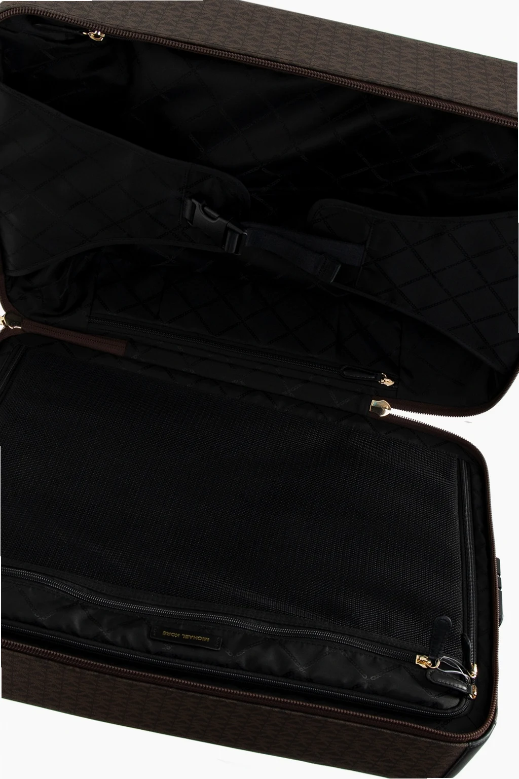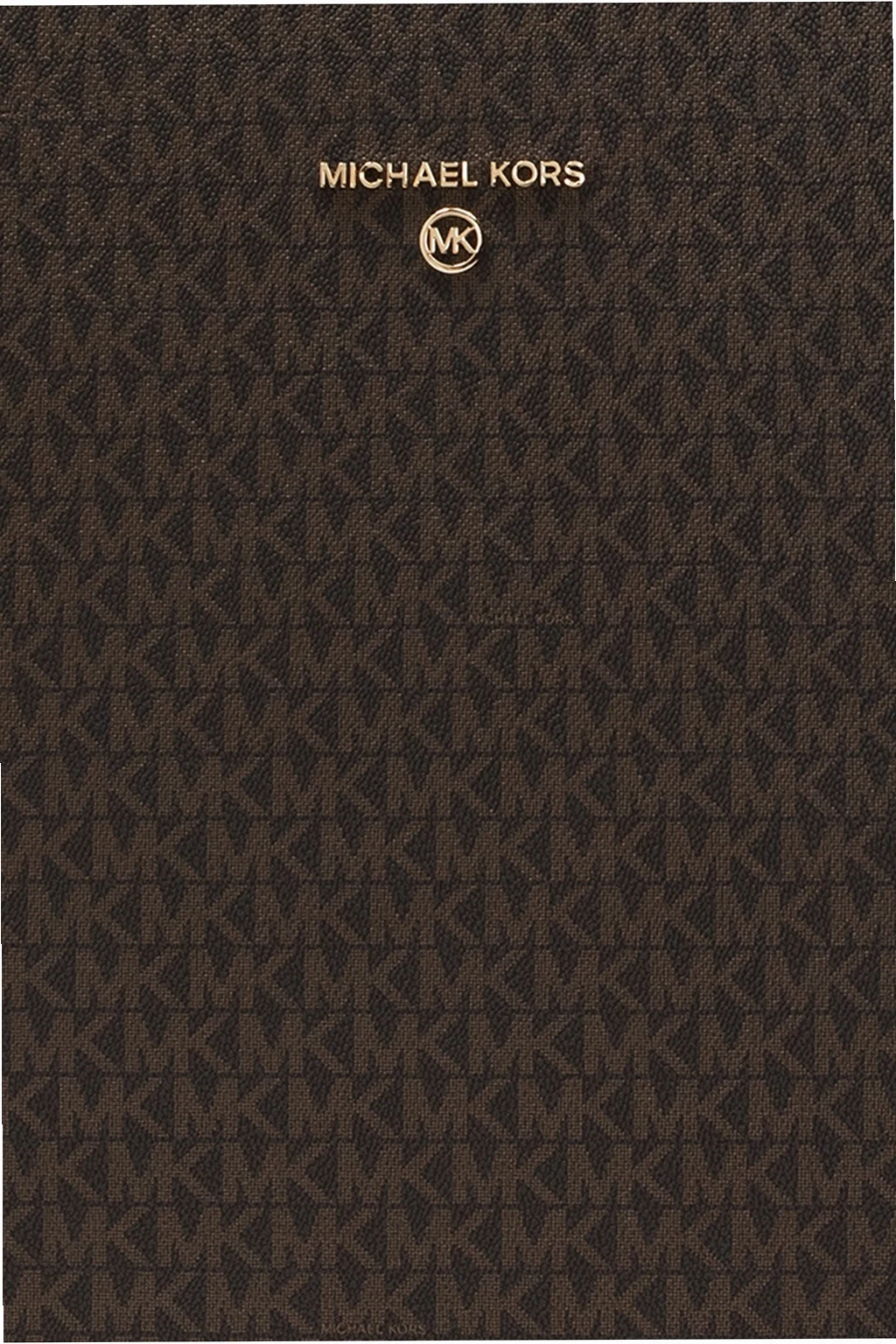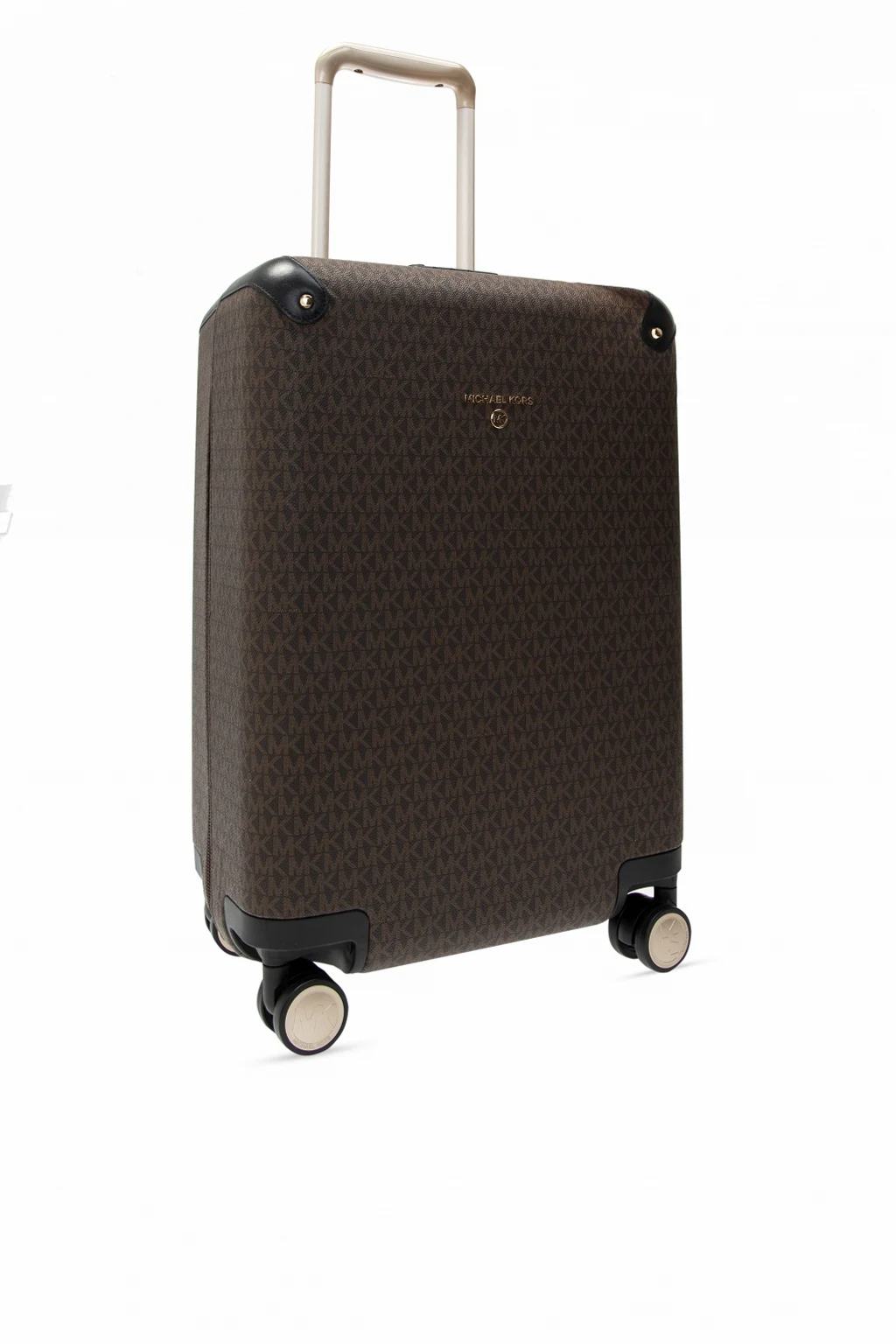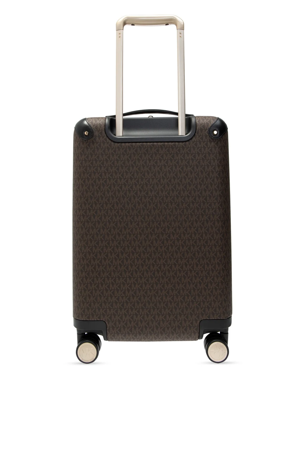 Brązowo-czarna walizka Michael Michael Kors. Wykonana z płótna, wykończona skórą. Zamykana na dwubiegunowy zamek oraz szyfr. Ozdobiona metalową aplikacją i nadrukowanym wzorem z logo. Półokrągła rączka i rączka teleskopowa. Wewnątrz komora oraz cztery kieszenie zamykane na zamki. Cztery obrotowe kółka. Metalowe wykończenie w kolorze złotym.