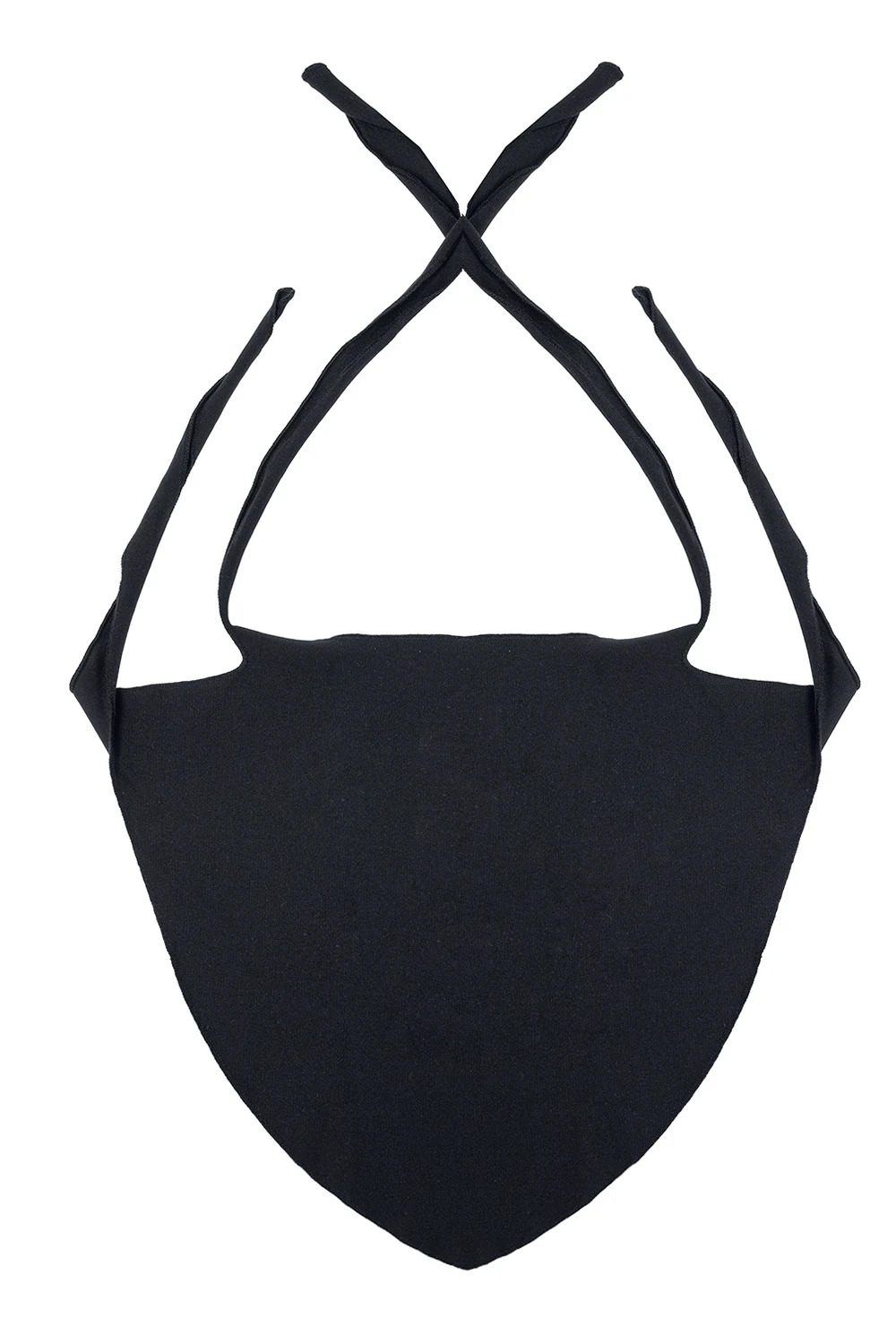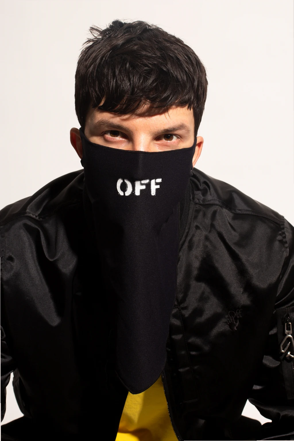 Czarna, wiązana maska Off-White. Ozdobiona nadrukowanym wzorem z logo w kolorze białym.