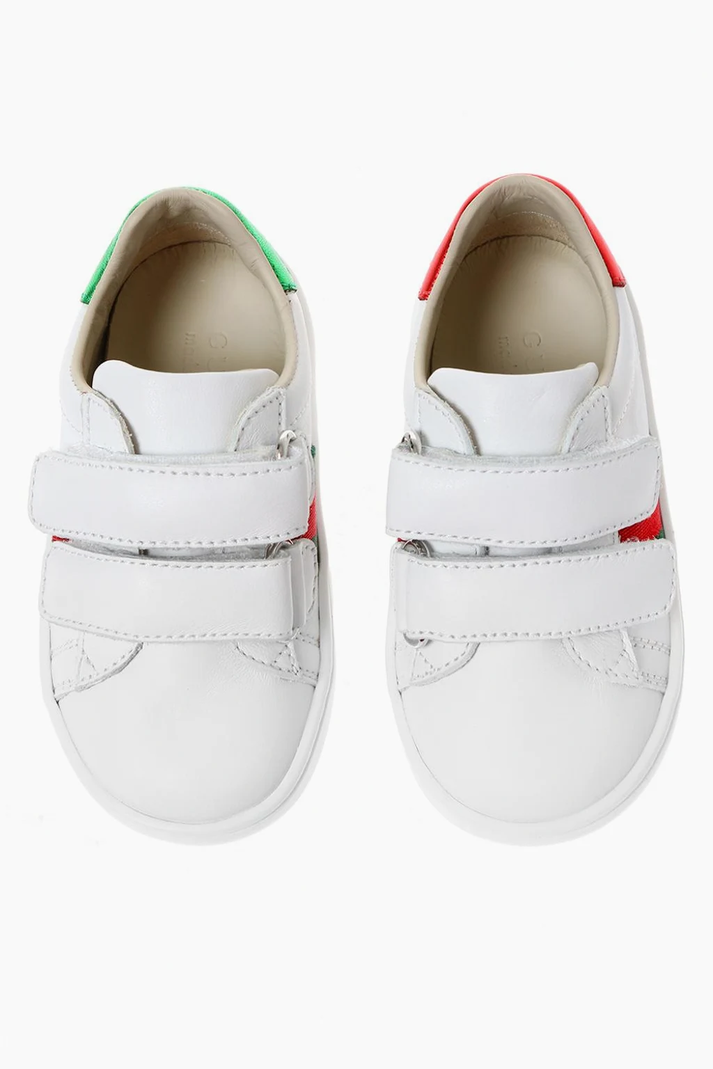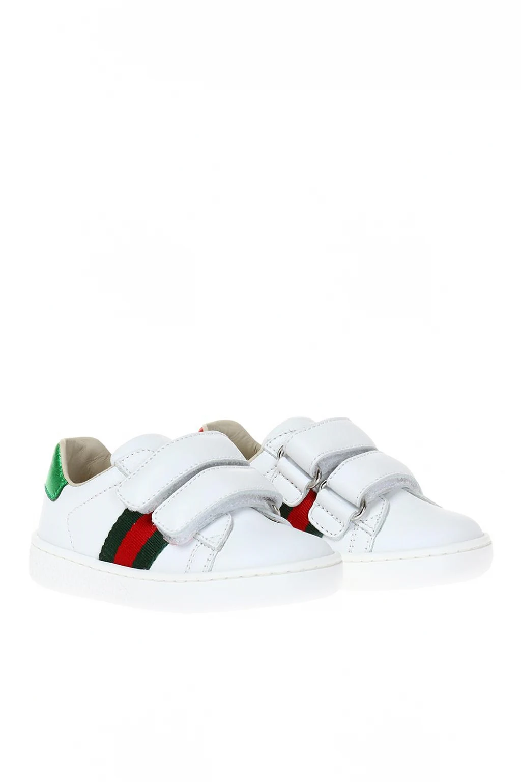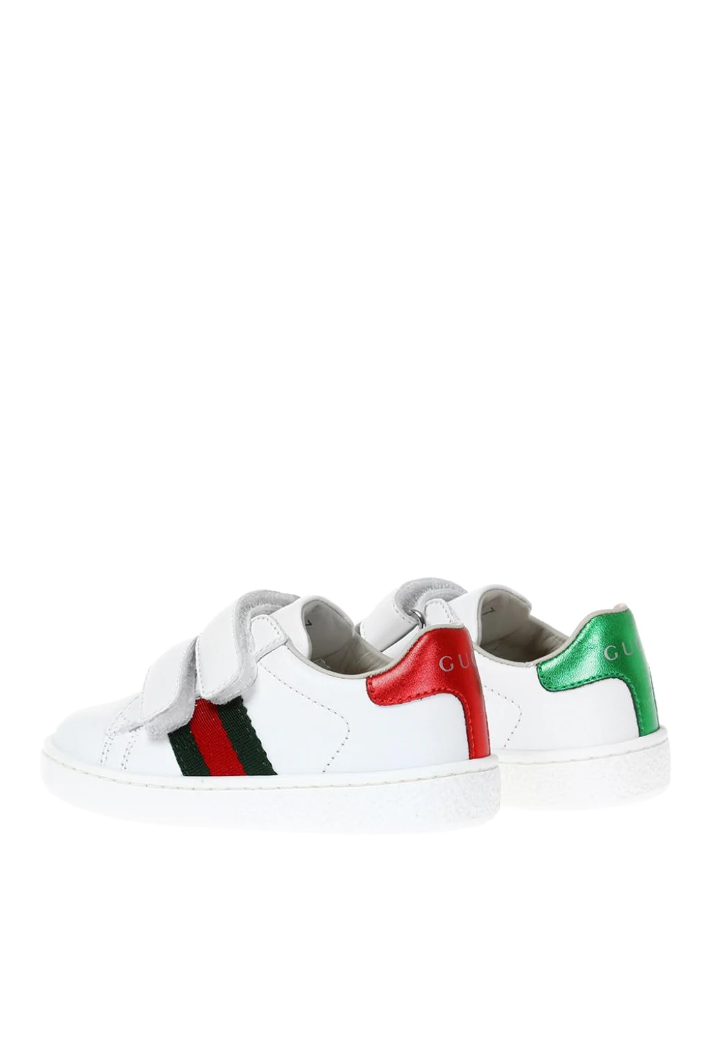 Białe buty sportowe Gucci. Wykonane ze skóry. Zapinane na podwójny rzep. Po bokach charakterystyczny dla marki zielono-czerwono-zielonym pasek 'Web'. Z tyłu nadruk z logo w kolorze białym. Biała, gumowa podeszwa.