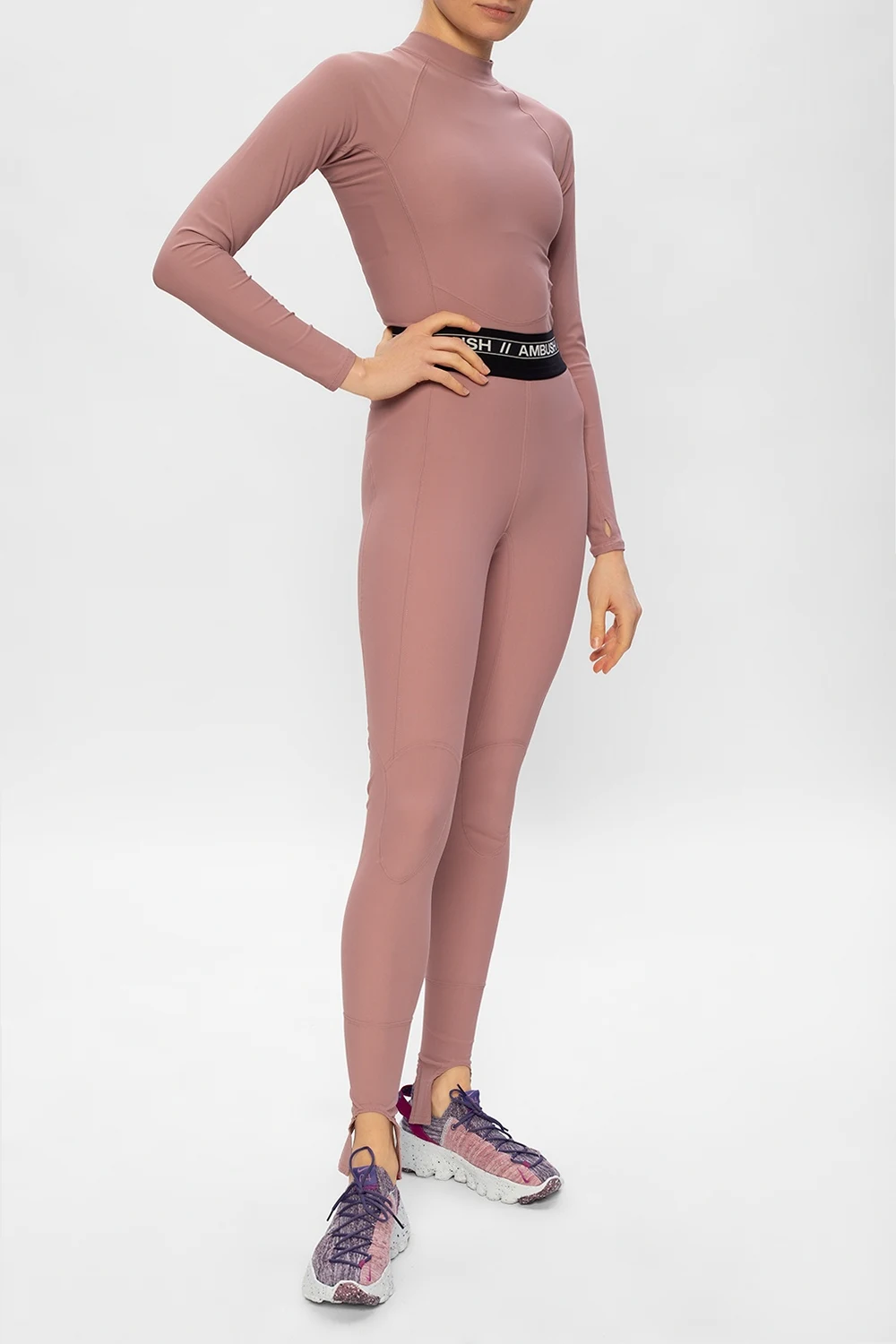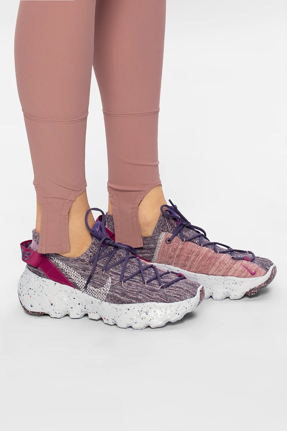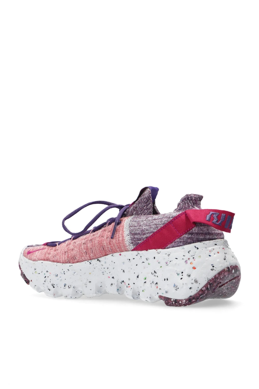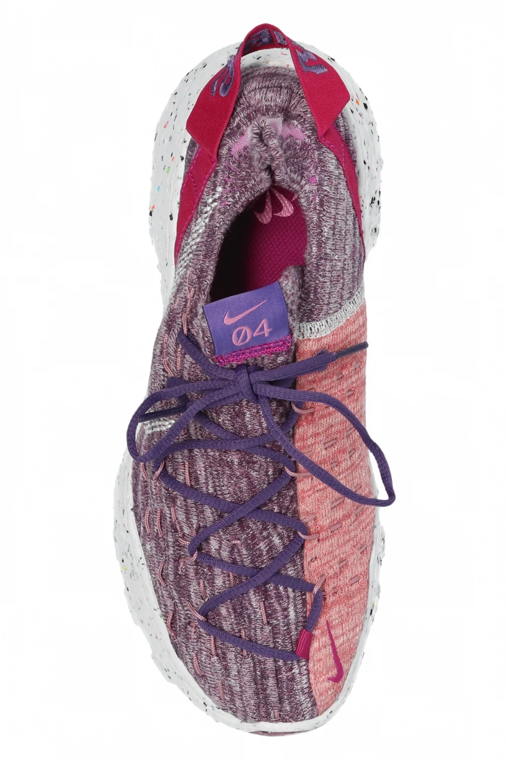 Fioletowo-różowe, sznurowane buty sportowe ze skarpetą, model ‘Space Hippie 04’ Nike. Wykonane z przędzy Space Waste składa się w 75% z materiału z recyklingu, pozyskanego z przetworzonych plastikowych butelek, t-shirtów oraz skrawków materiału, który pozostał z produkcji innych produktów. Wyszyte logo w kolorze białym. Fioletowe przeszycia. Z tyłu pasek z wyszytym logo. Miękka podeszwa środkowa z pianki Crater. Biało-fioletowa, gumowa podeszwa o specjalnej fakturze powstałej z połączenia kolorowych pianek Nike Grind. Model, który pozostawia po sobie najmniejszy ślad węglowy w historii marki. Logo w kształcie wiatraka informuje o tym, że buty są wykonane przynajmniej w 50% z materiałów z recyklingu.