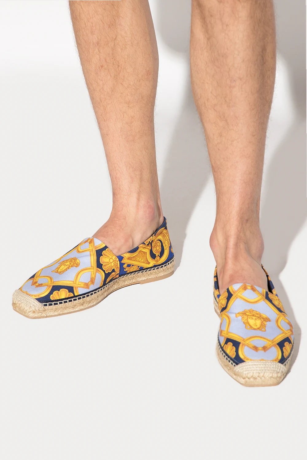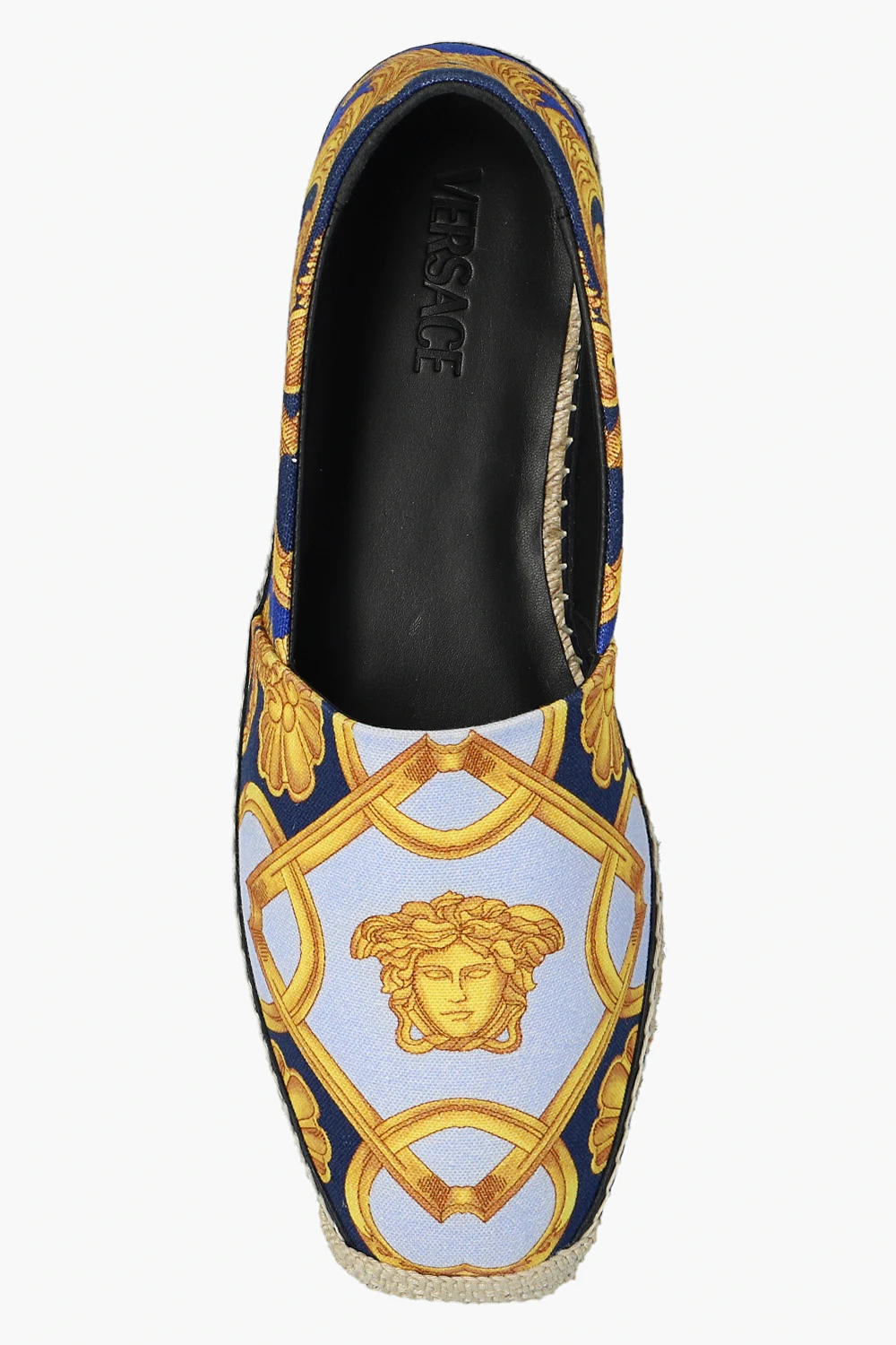Kolorowe espadryle Versace. Wykonane z płótna ozdobionego charakterystycznym dla marki wzorem barokowym. Wykończone skórą. Dekoracyjnie pleciona podeszwa z juty wykończona beżową gumą.