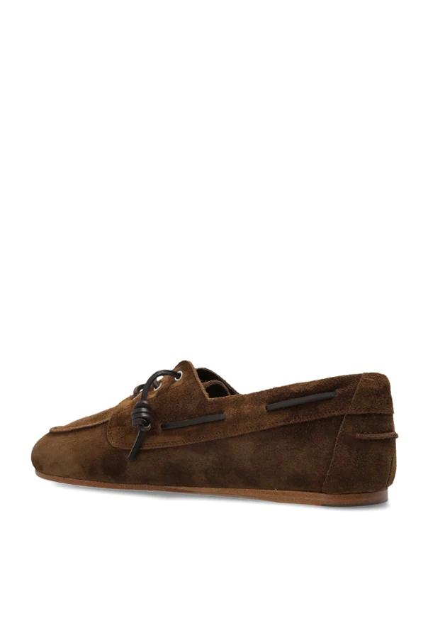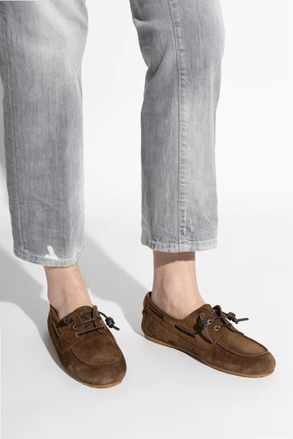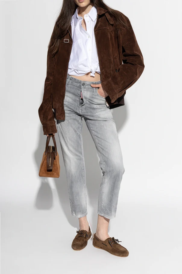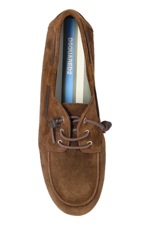 Cholewka z miękkiego, wysokogatunkowego zamszu w odcieniu brązowym dopełniona została dekoracyjnymi, skórzanymi sznurowadłami przewlekanymi przez boczne otwory i zwieńczonymi estetycznym wiązaniem. Wnętrze buta zdobi pasek w tonacji niebieskiej i beżowej z nazwą projektanta DSQUARED2 , akcentując ekskluzywny charakter modelu.