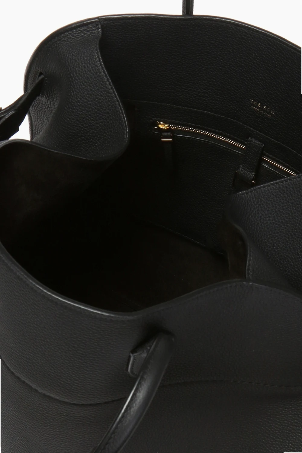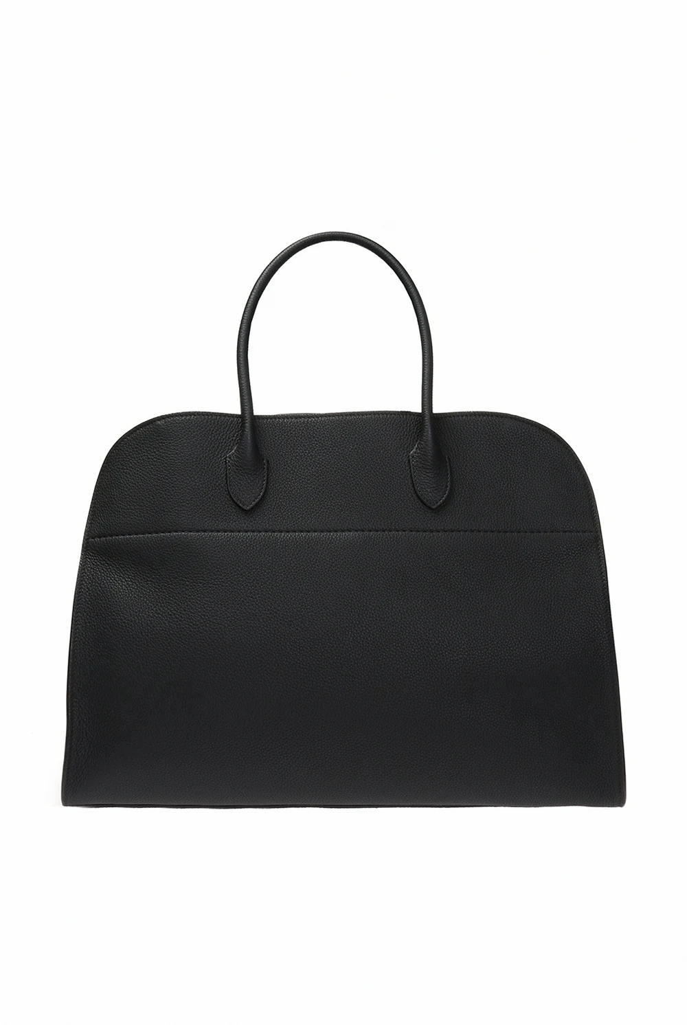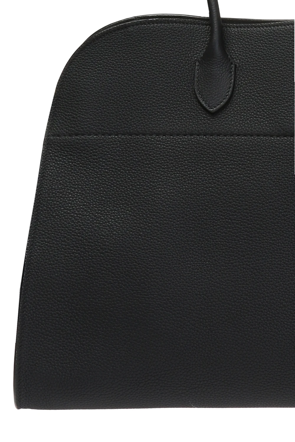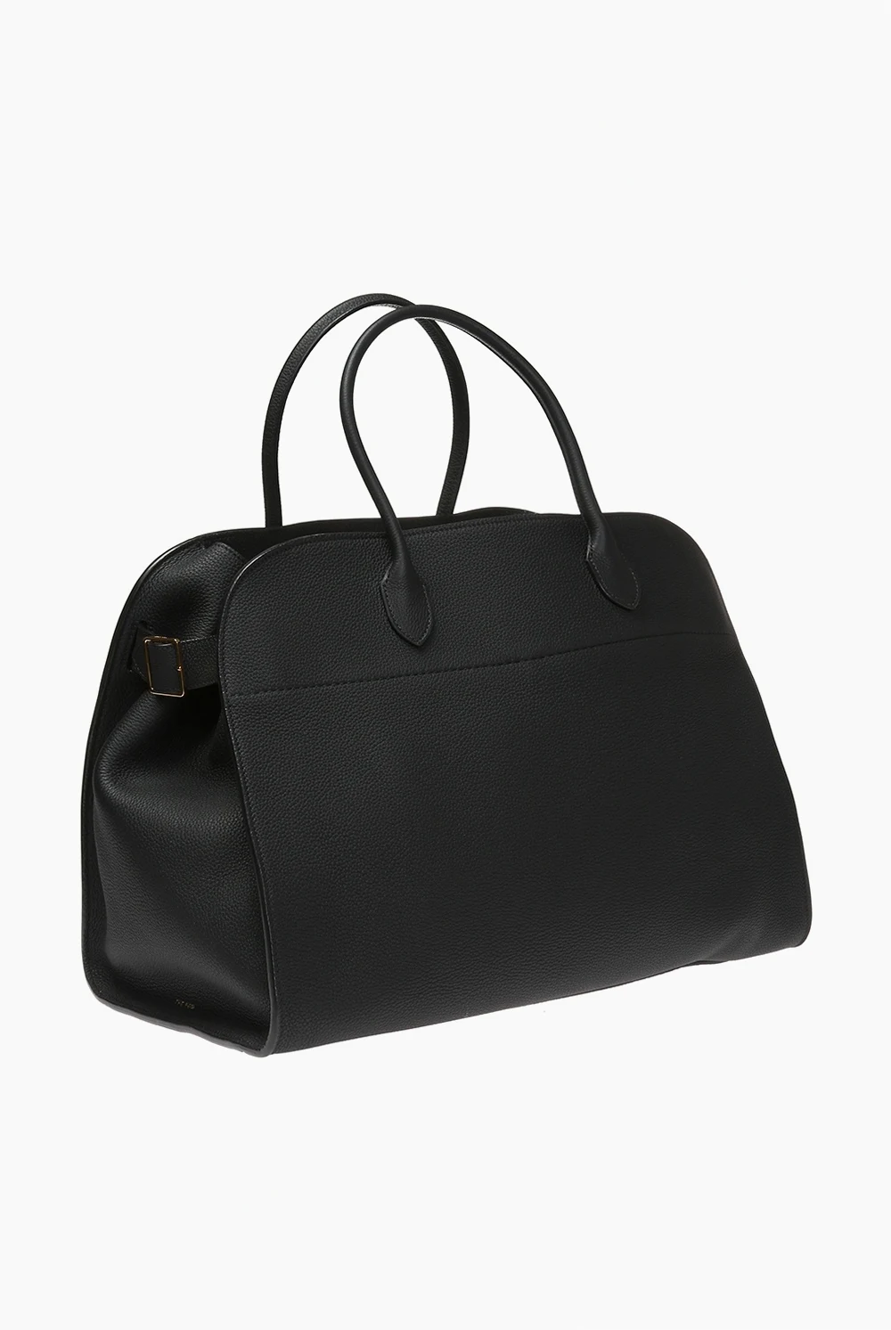Czarna torba do ręki, model 'Margaux 17' The Row. Wykonana z cielęcej skóry o specjalnej fakturze. Zamykana na zaczep. Z boku wytłoczone logo oraz skórzane paski z metalowymi klamrami. Dwie półokrągłe rączki. Warstwa wewnętrzna wykonana z cielęcej skóry i zamszu w kolorze czarnym. Wewnątrz komora i trzy kieszenie, jedna zamykana na zamek. Metalowe wykończenie w kolorze złotym.