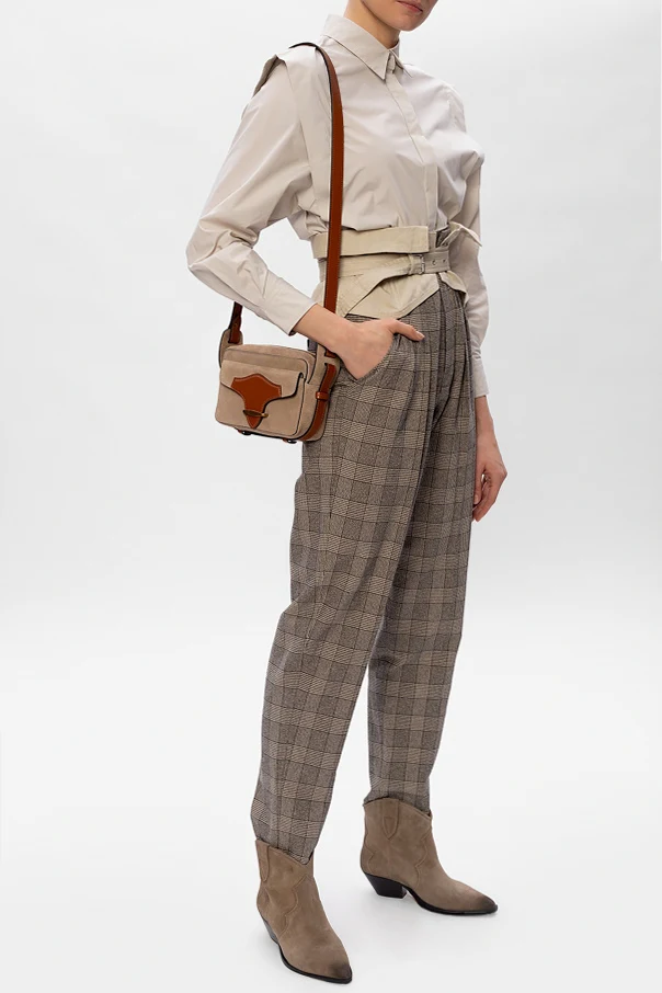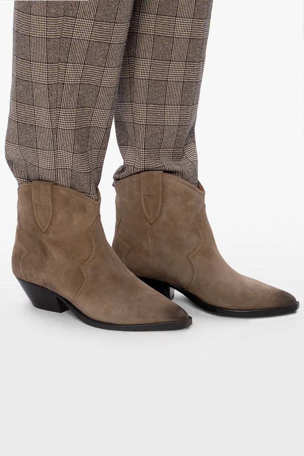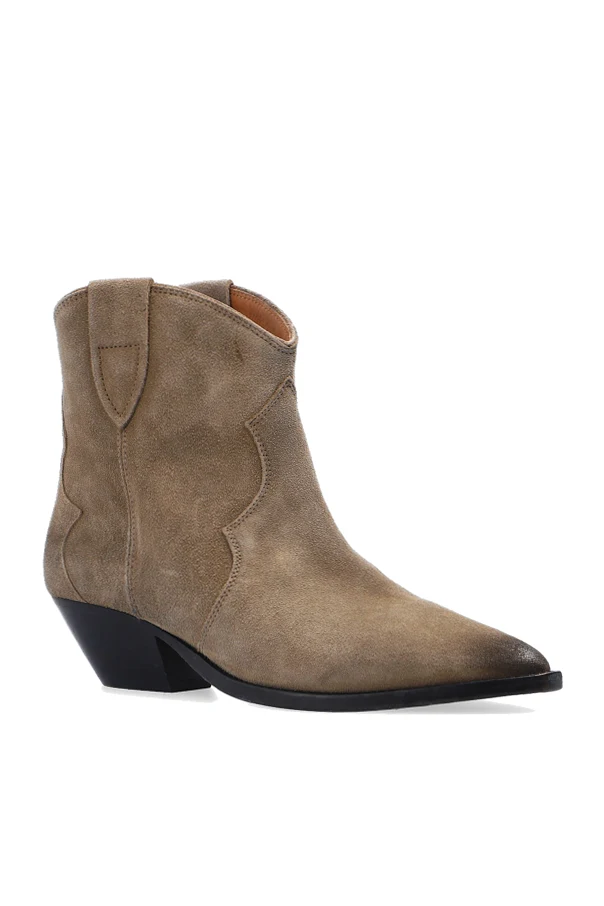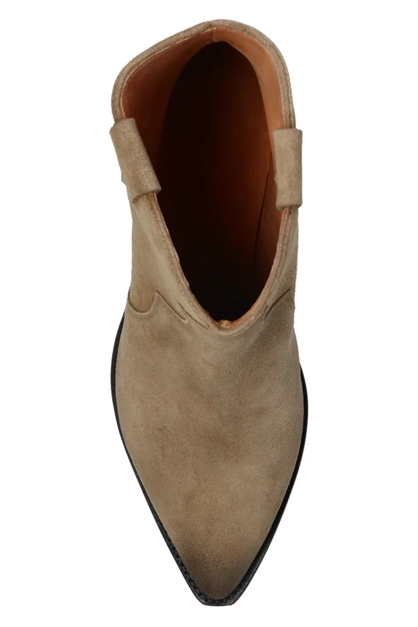 Beżowe, wsuwane botki, model ‘Washed Iconic’ Isabel Marant. Wykonane ze skóry. Ozdobione przeszyciami oraz efektem znoszenia. Nosek w szpic. Beżowo-czarna, skórzana podeszwa.