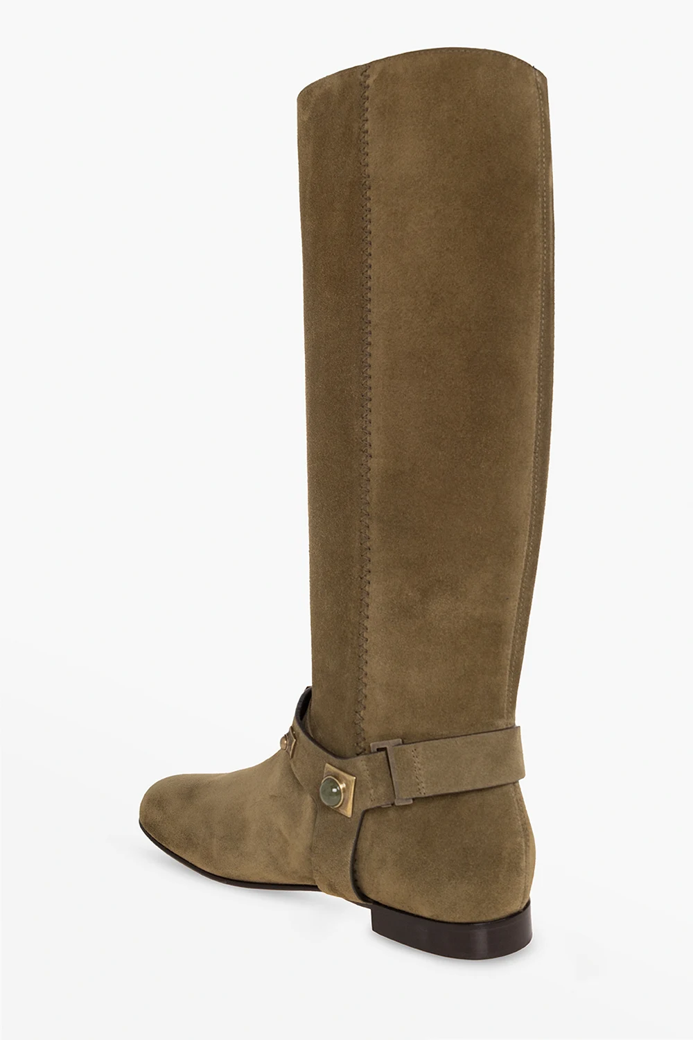Zielone, wsuwane kozaki o długości do kolana Etro. Wykonane z zamszu. Ozdobione dekoracyjną uprzężą z metalowymi aplikacjami wysadzanymi kamieniami kaboszonowymi. Beżowa, skórzana podeszwa wykończona gumą.