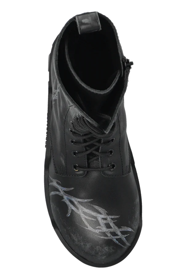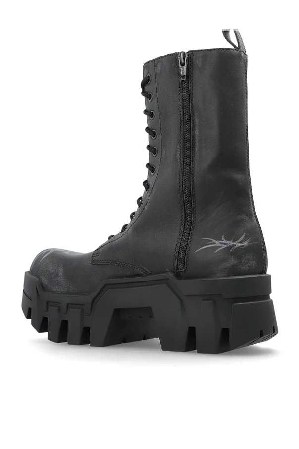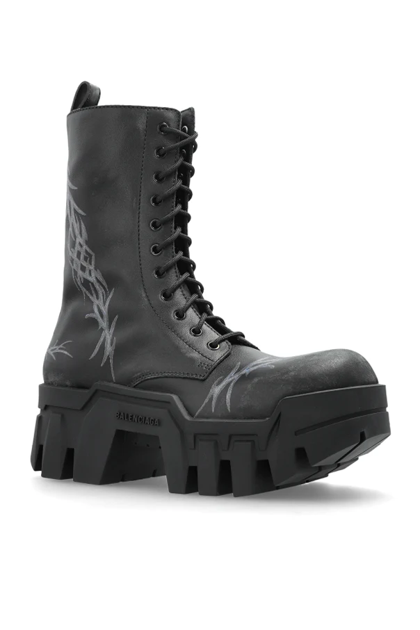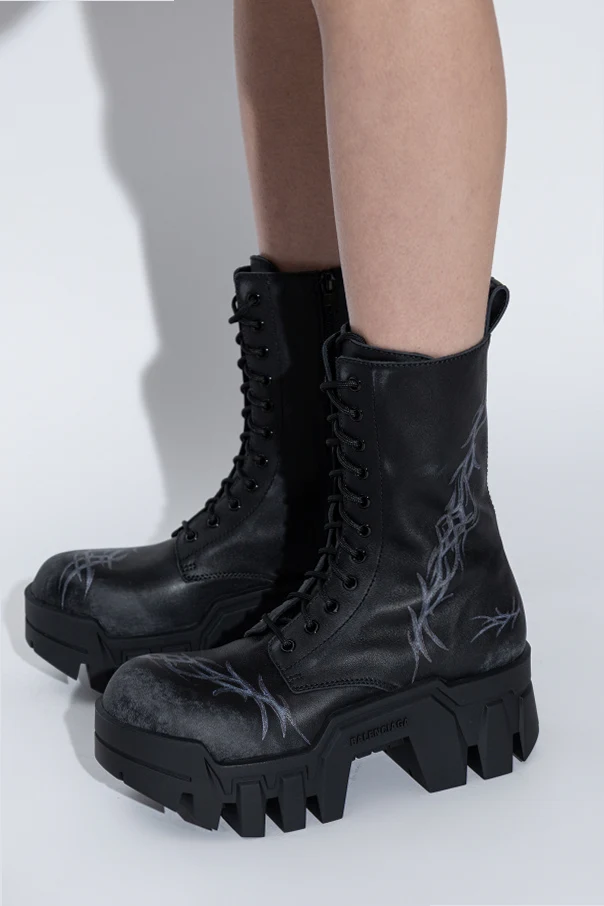 Botki na platformie ‘Bulldozer Lace Booti’ to propozycja marki Balenciaga, która urzeka wyrazistym obliczem miejskiej elegancji. Obuwie zwraca uwagę masywną konstrukcją , wysoką cholewką typu combat boots i wyraźnie zaznaczoną, mocno profilowaną platformą. Czarny kolor harmonizuje z nowoczesnym, industrialnym charakterem, a efektowne, jasnoszare wzory o motywie tribalowym subtelnie dopełniają całość, nadając unikatowości.