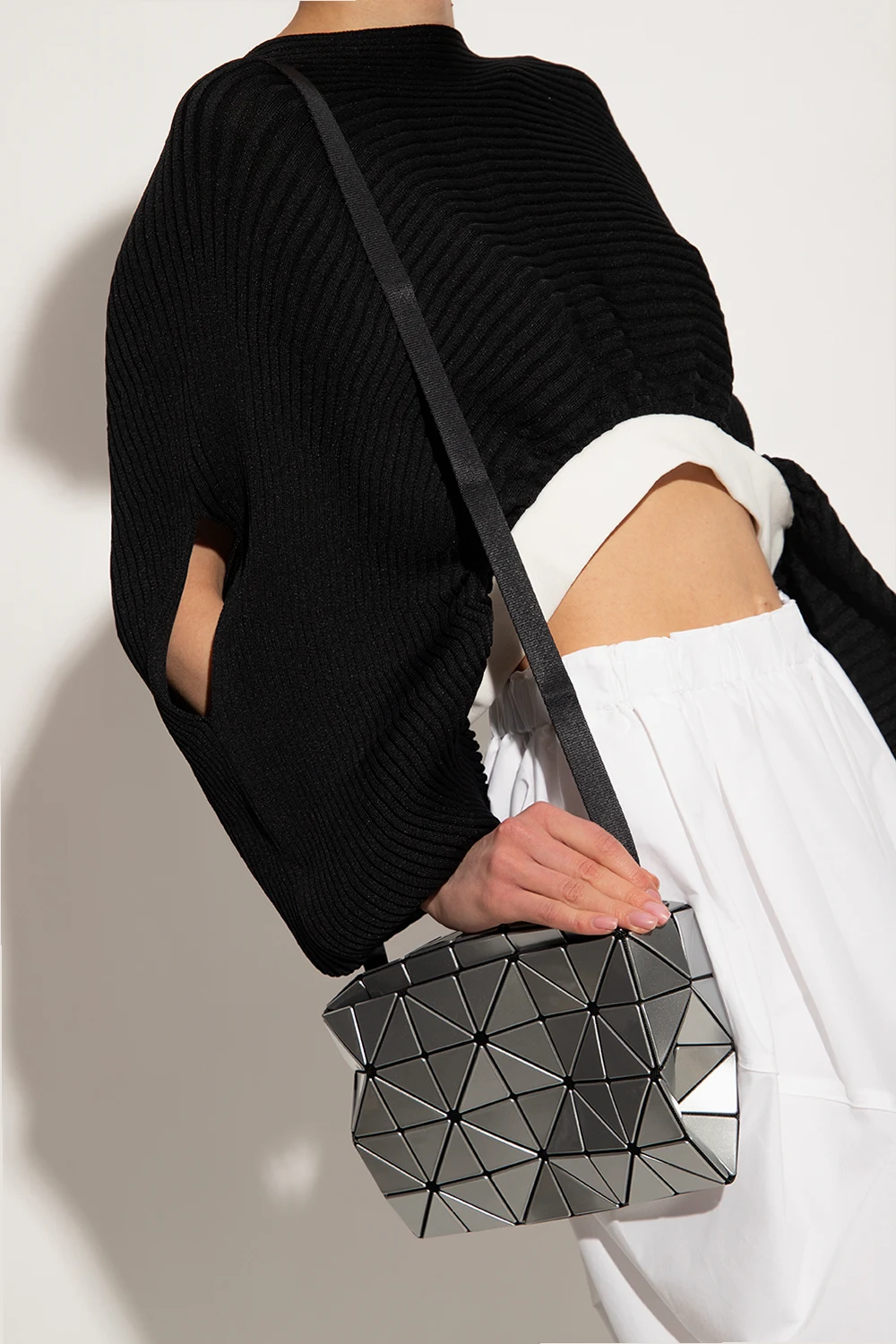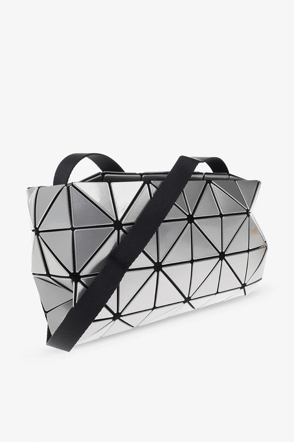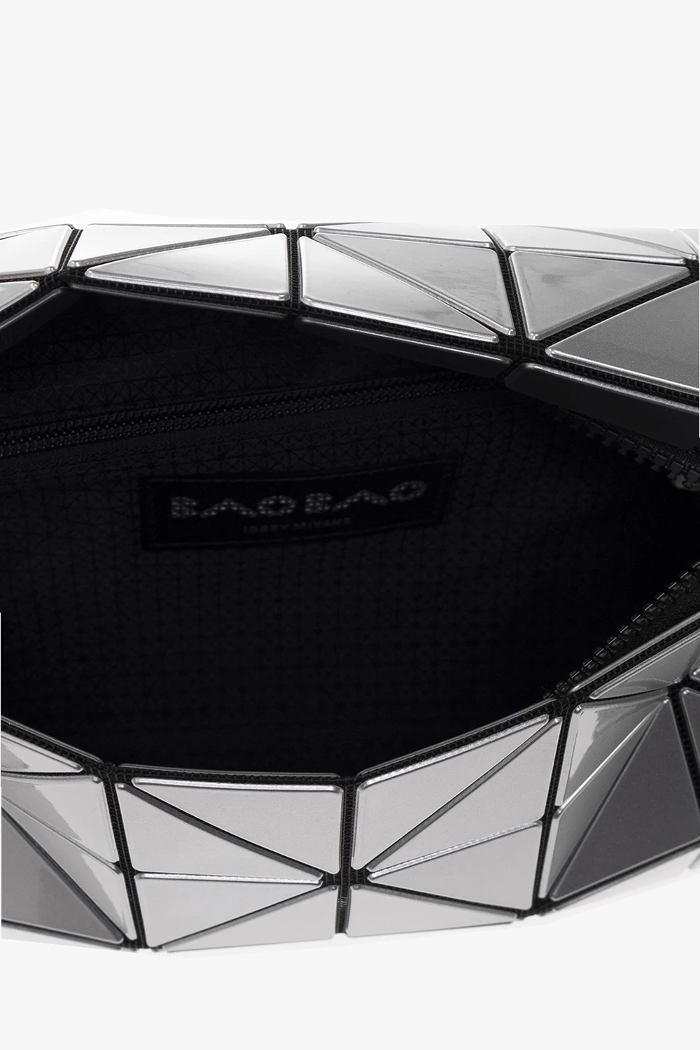 Torba na ramię w kolorze czarno-srebrnym, model ‘Carton’ Issey Miyake Bao Bao. Wykonana z siatki pokrytej pokrytego lakierowanymi aplikacjami tworzącymi geometryczny wzór. Zamykana na zamek. Regulowany pasek na ramię. Wewnątrz komora z kieszenią zamykaną na zamek. Metalowe wykończenie w kolorze ciemnego srebra.