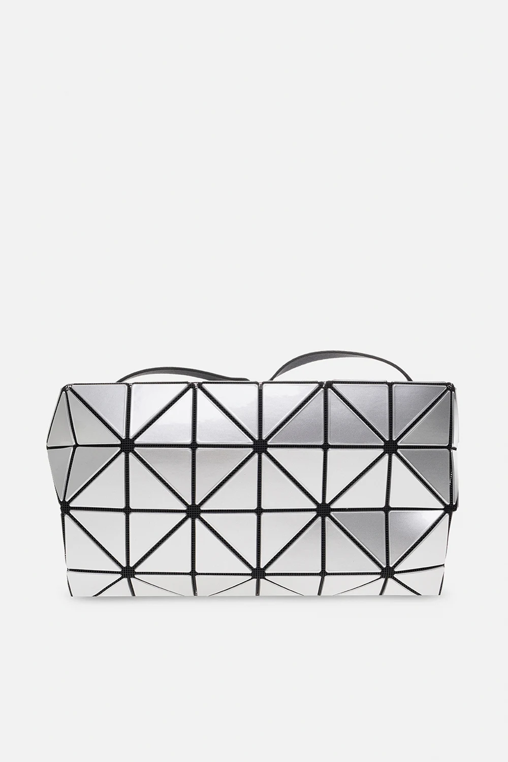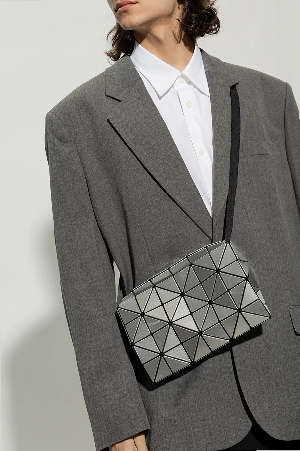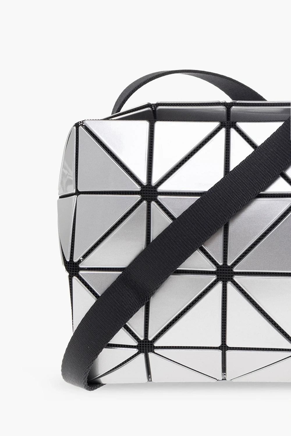 Torba na ramię w kolorze czarno-srebrnym, model ‘Carton’ Issey Miyake Bao Bao. Wykonana z siatki pokrytej pokrytego lakierowanymi aplikacjami tworzącymi geometryczny wzór. Zamykana na zamek. Regulowany pasek na ramię. Wewnątrz komora z kieszenią zamykaną na zamek. Metalowe wykończenie w kolorze ciemnego srebra.