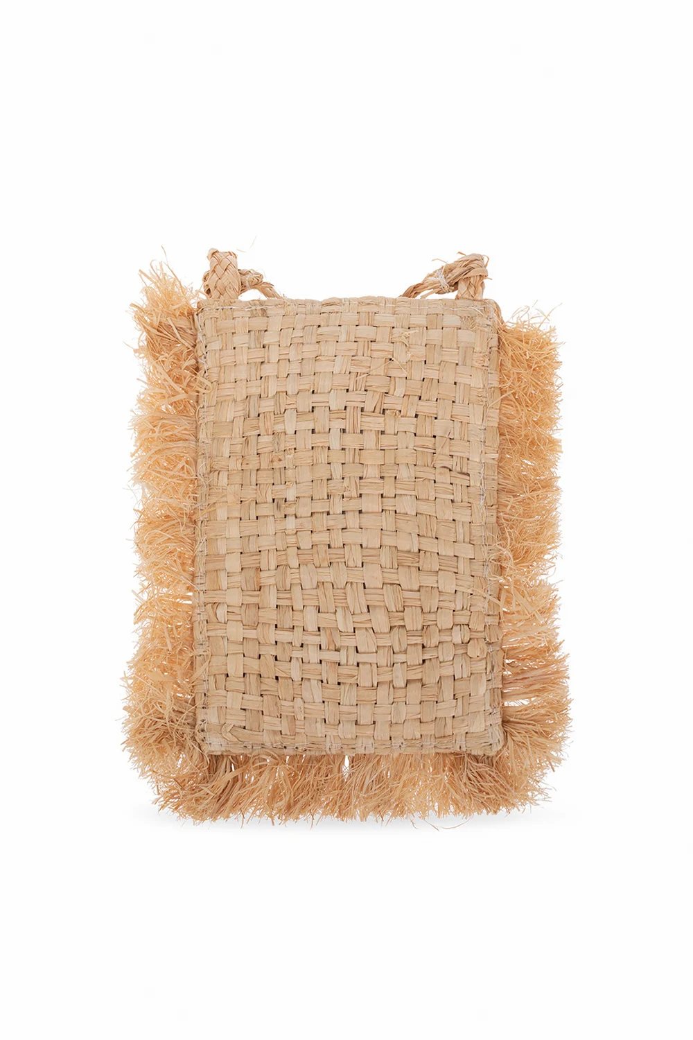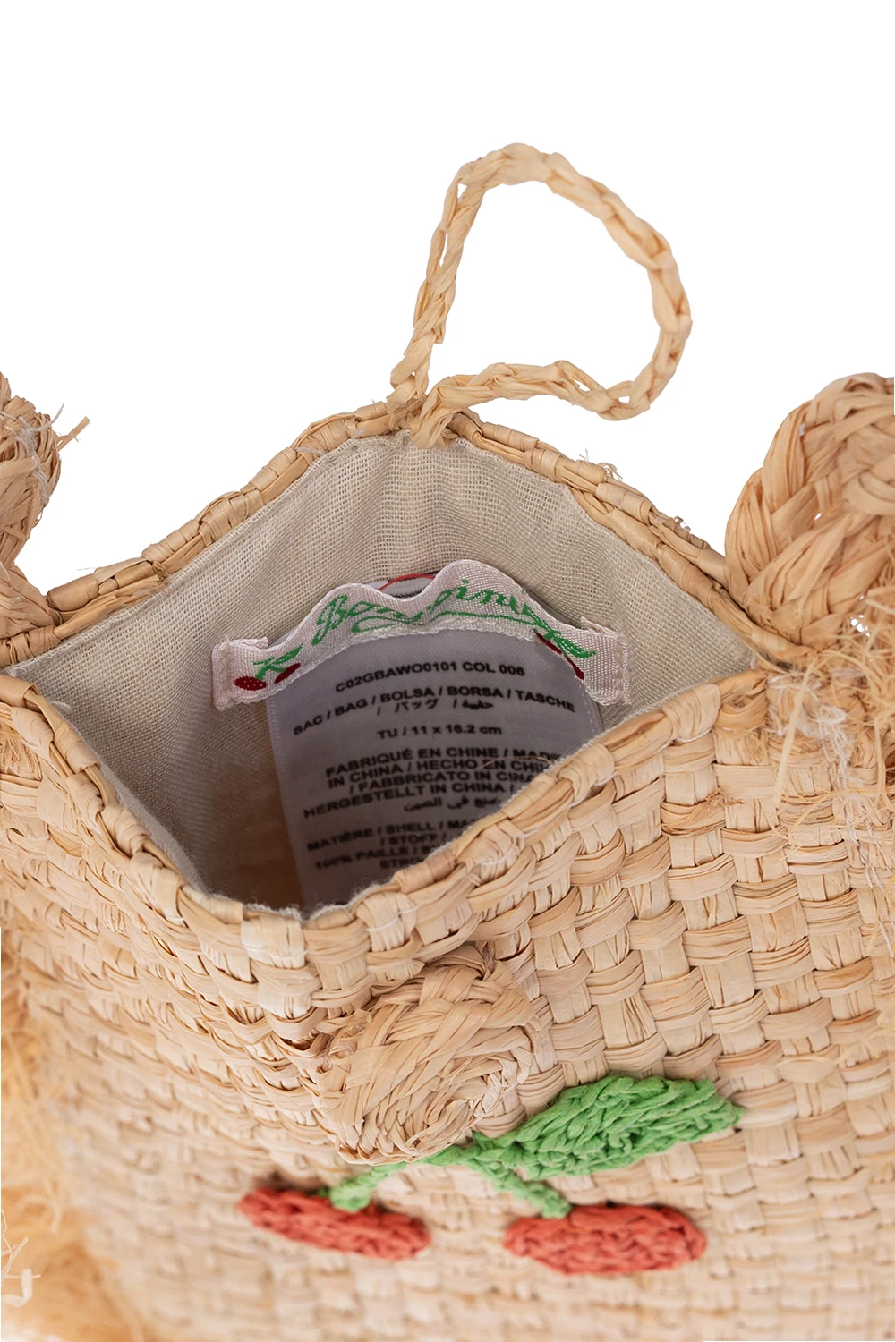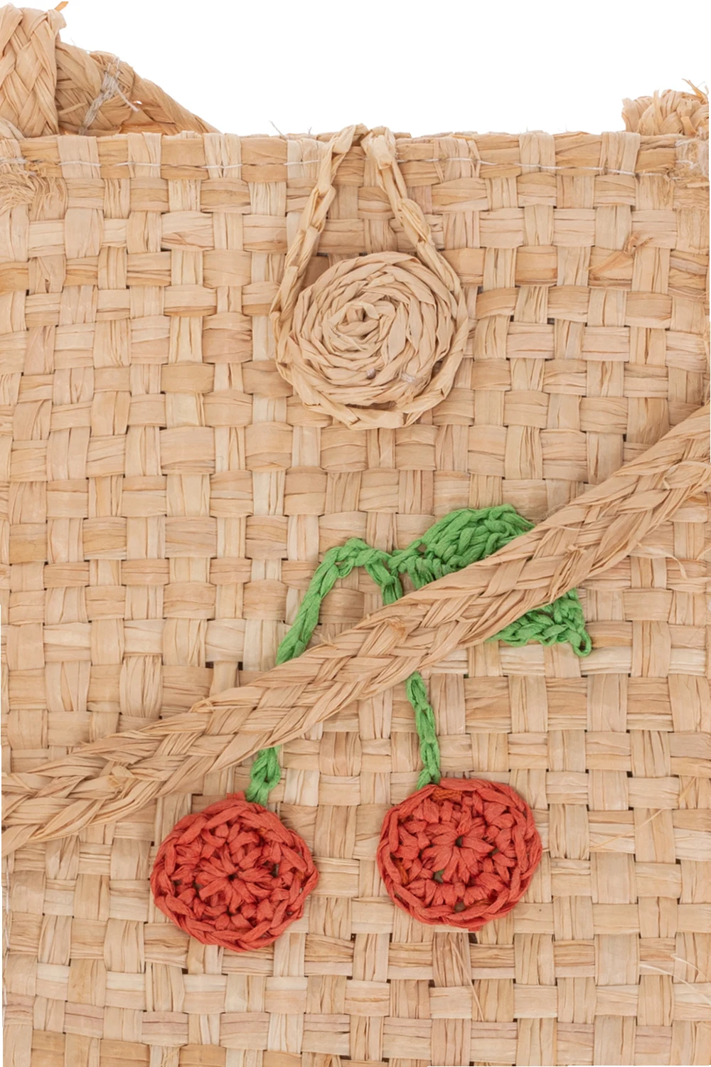 Beżowa, pleciona torba na ramię Bonpoint. Wykonana z plecionej słomy. Dekoracyjne zapięcie. Z przodu kolorowy, charakterystyczny motyw wiśni. Wykończona frędzlami. Długi pasek. Wewnątrz komora.