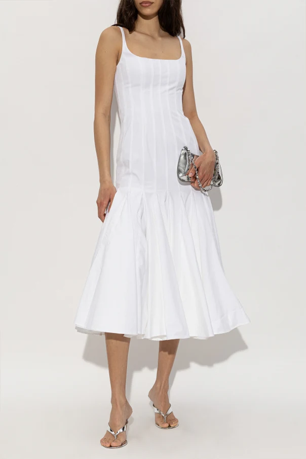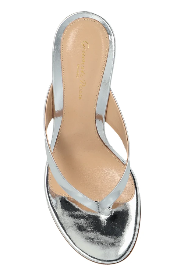 Kluczowym elementem jest smukły, średniej wysokości obcas oraz nieco wydłużony, kwadratowy nosek, które subtelnie wysmuklają sylwetkę. Szeroki pasek w formie litery V otula stopę, zapewniając nie tylko wyjątkowy komfort noszenia, lecz także harmonijną linię. Całość utrzymana jest w jednolitej, metalicznej stylistyce, bez zbędnych ozdób, co czyni ten projekt subtelnie luksusowym i uniwersalnym.
