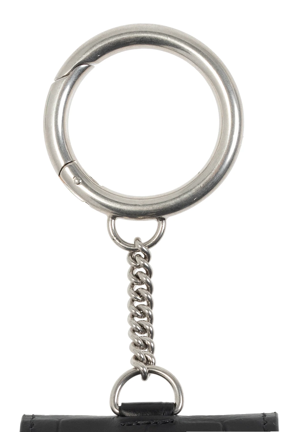 Czarne etui na słuchawki bezprzewodowe AirPods Balenciaga. Wykonane ze skóry cielęcej. Ozdobione nadrukowanym logo w kolorze białym. Metalowy karabińczyk w kolorze srebrnym.