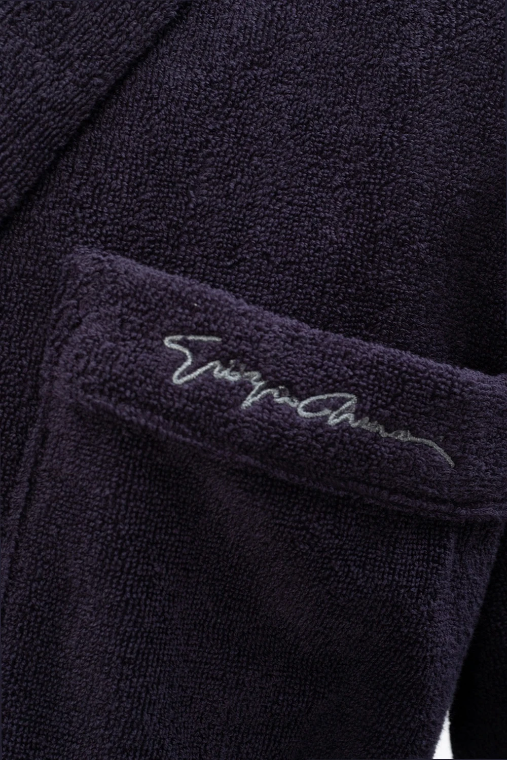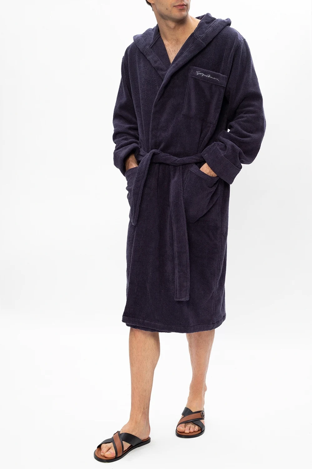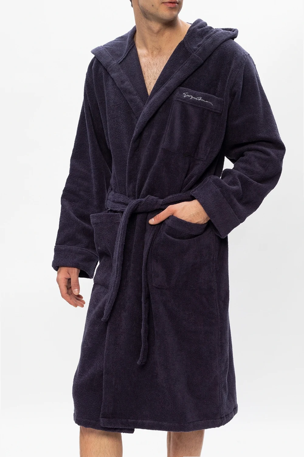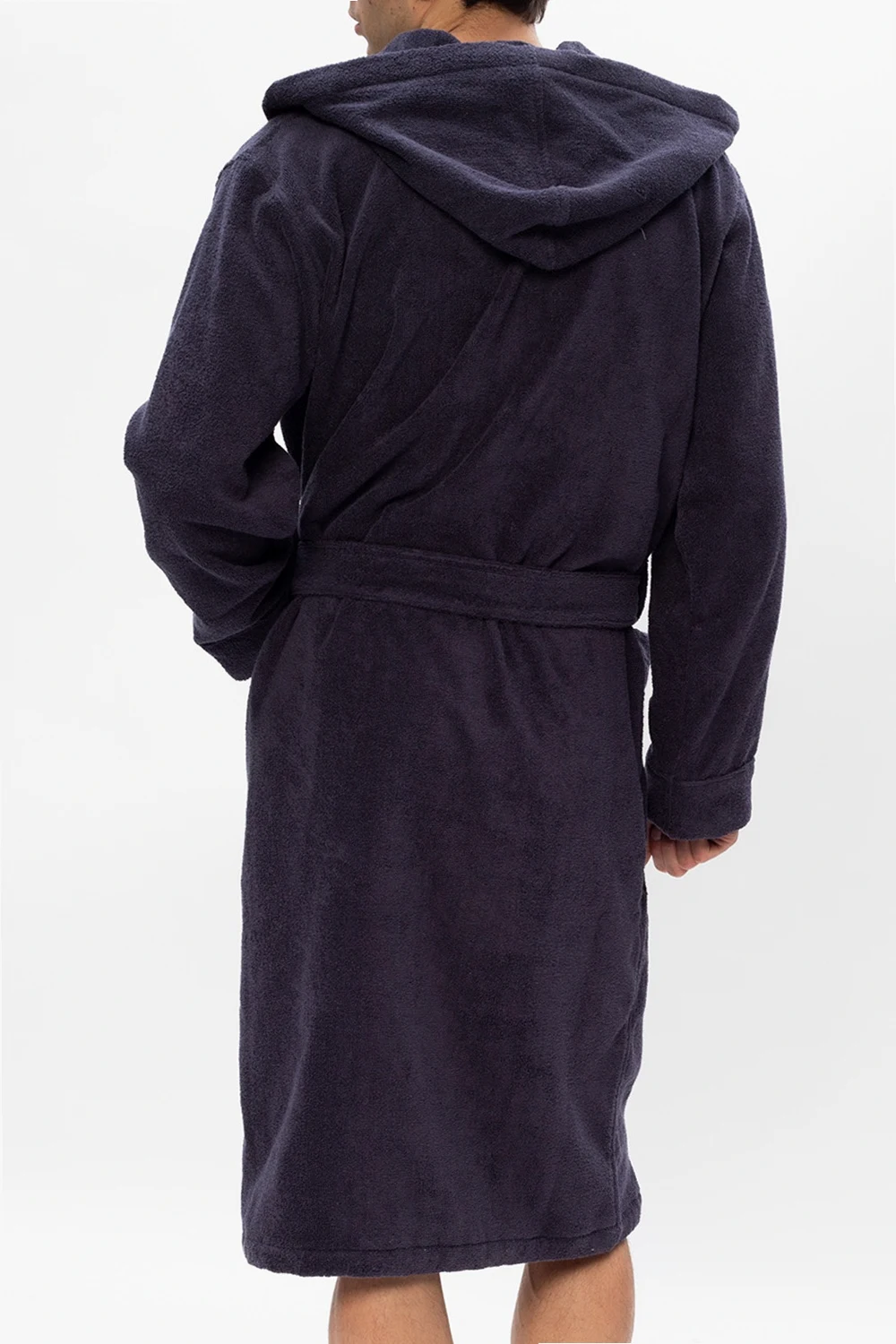 Granatowy, bawełniany szlafrok z kapturem Giorgio Armani. Wiązany w pasie. Z przodu dwie wsuwane kieszenie. Ozdobiony wyszytym logo w kolorze białym. Długie rękawy.