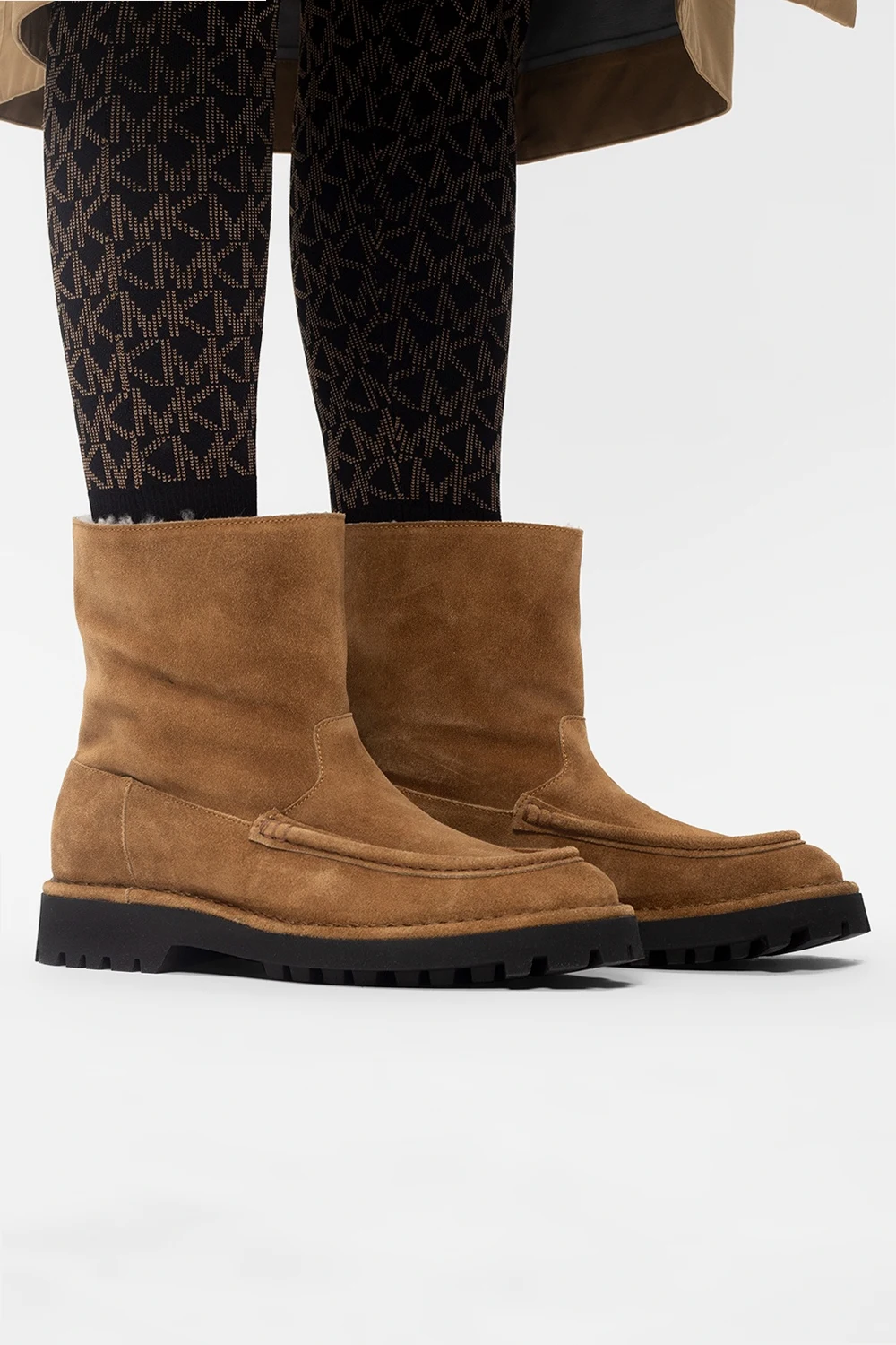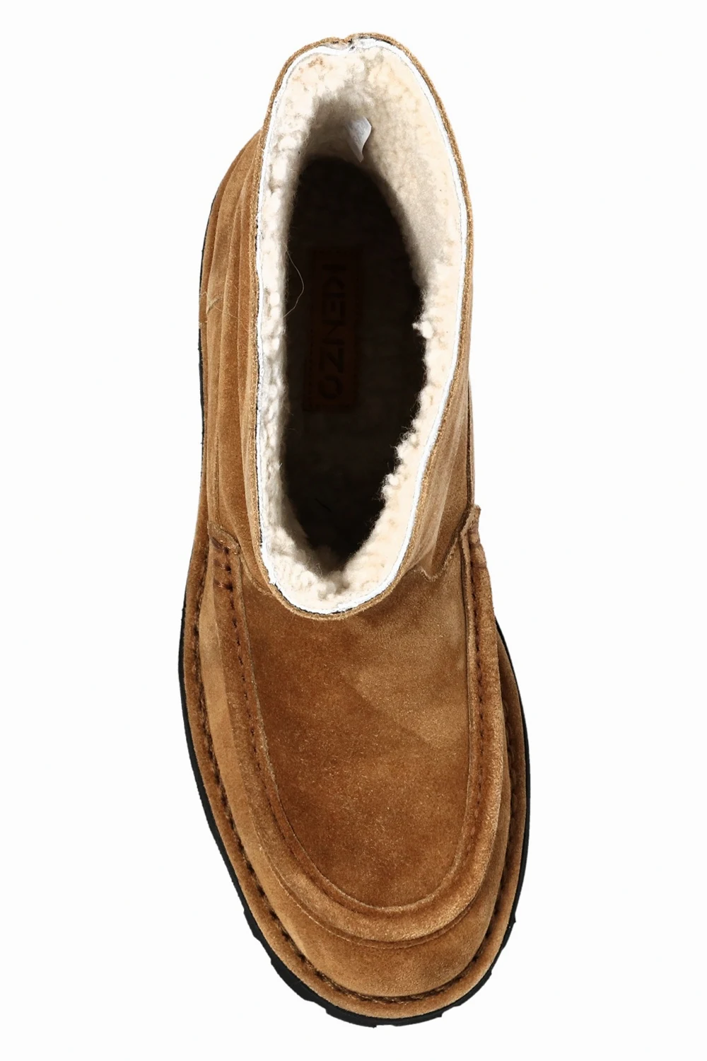 Beżowe botki, model ‘K-Mount’ Kenzo. Wykonane z zamszu. Warstwa wewnętrzna wykończona futrem owczym. Czarna, gumowa podeszwa.