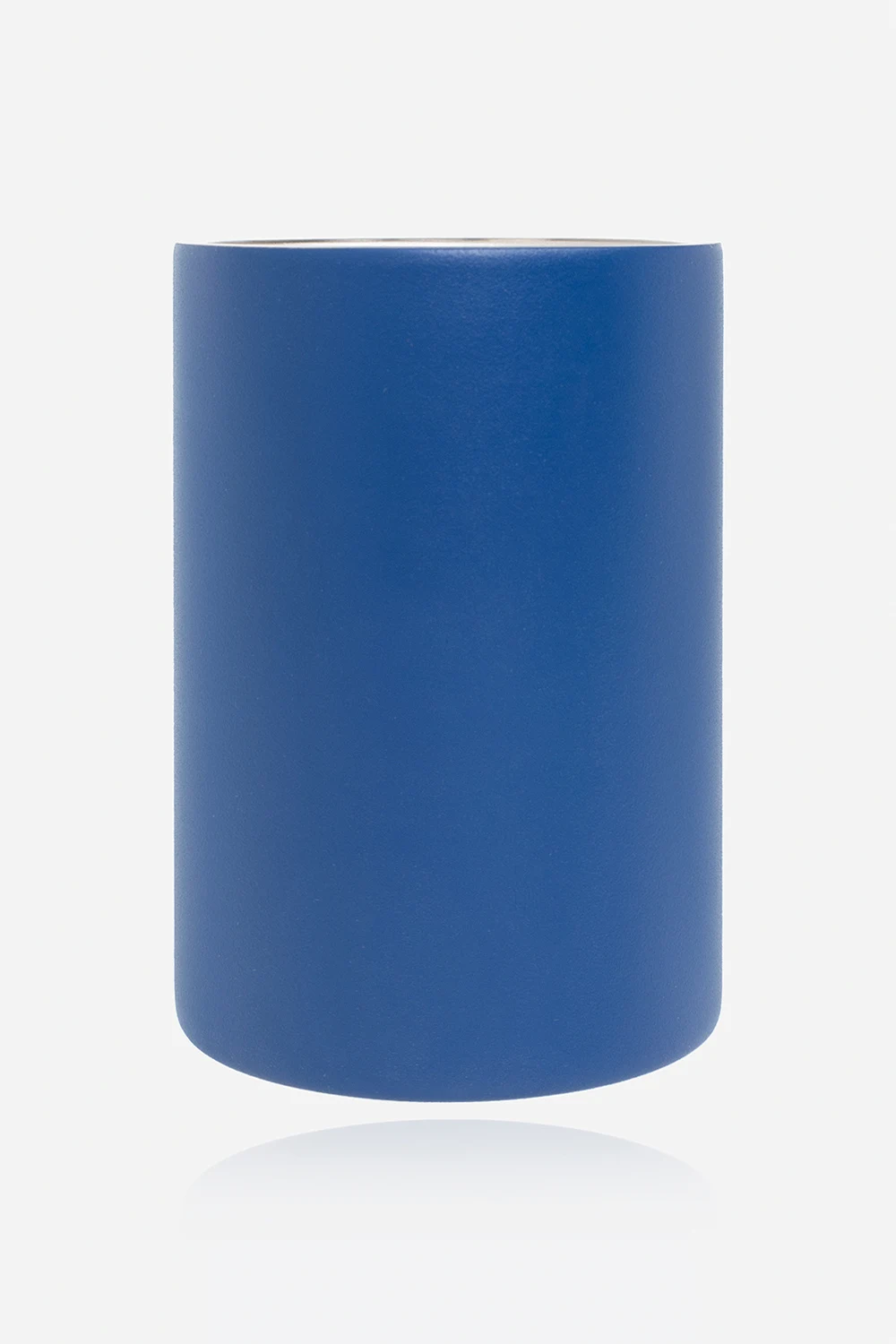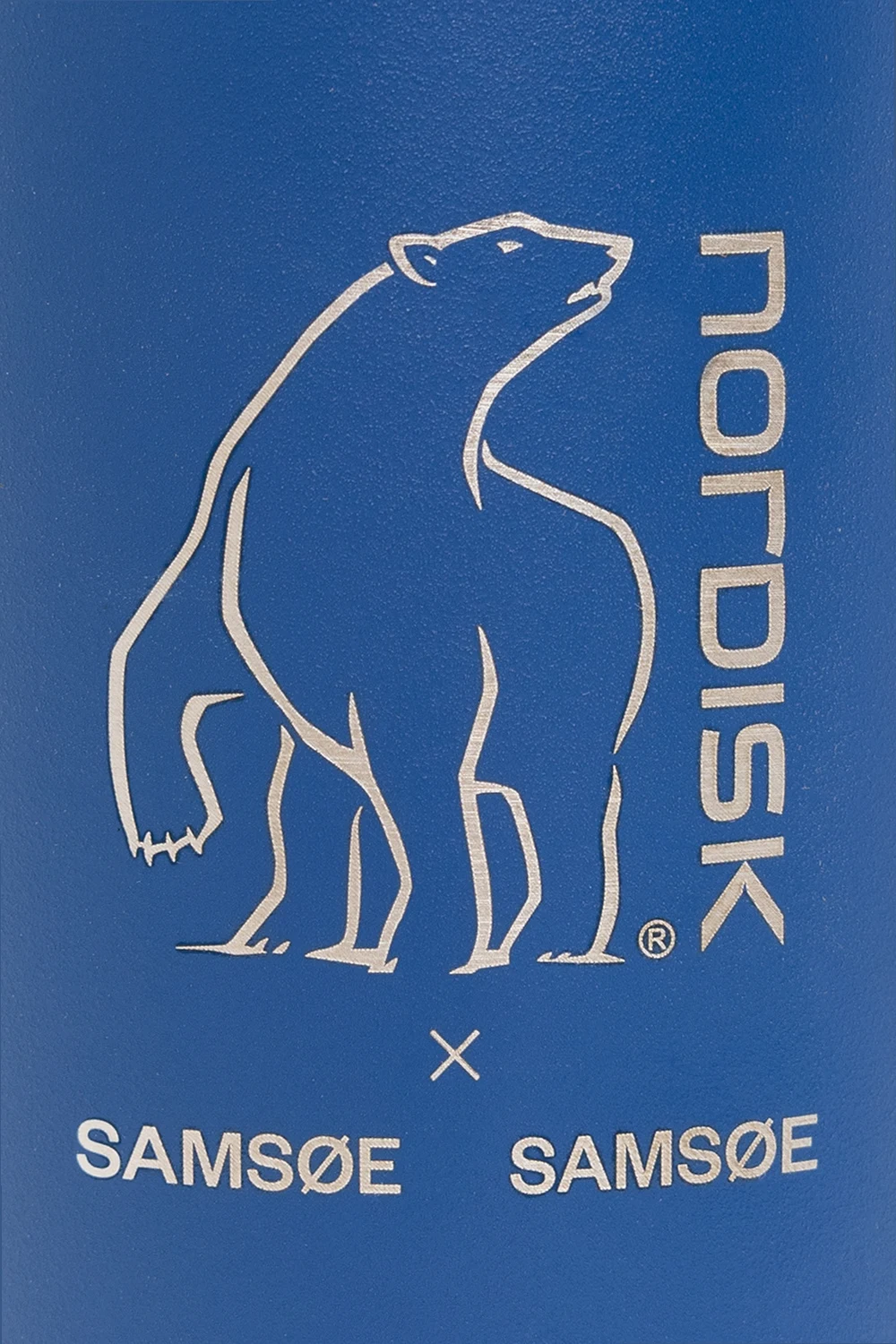 Granatowy kubek termiczny z podwójną ścianką Samsoe Samsoe x Nordisk. Wykonany ze stali nierdzewnej. Ozdobiony nadrukowanym logo w kolorze srebrnym oraz motywem niedźwiedzia polarnego. Można myć w zmywarce.