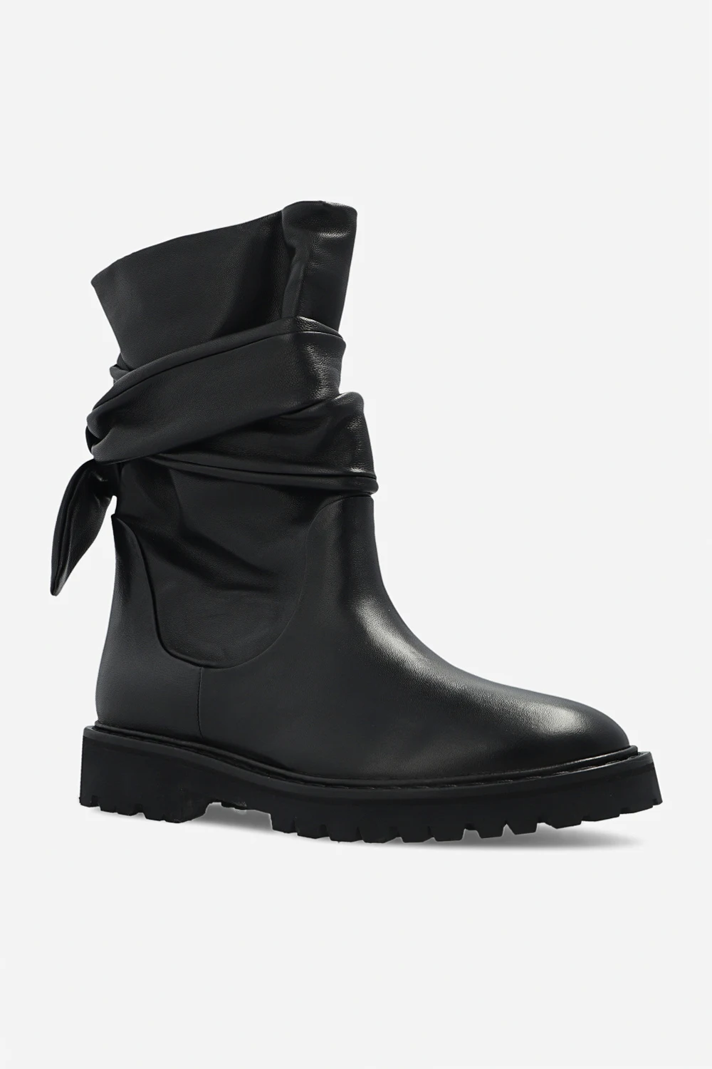 Czarne botki, model ‘Nori’ Iro. Wykonane ze skóry. Dekoracyjne wiązanie. Migdałowy nosek. Czarna, gumowa podeszwa.