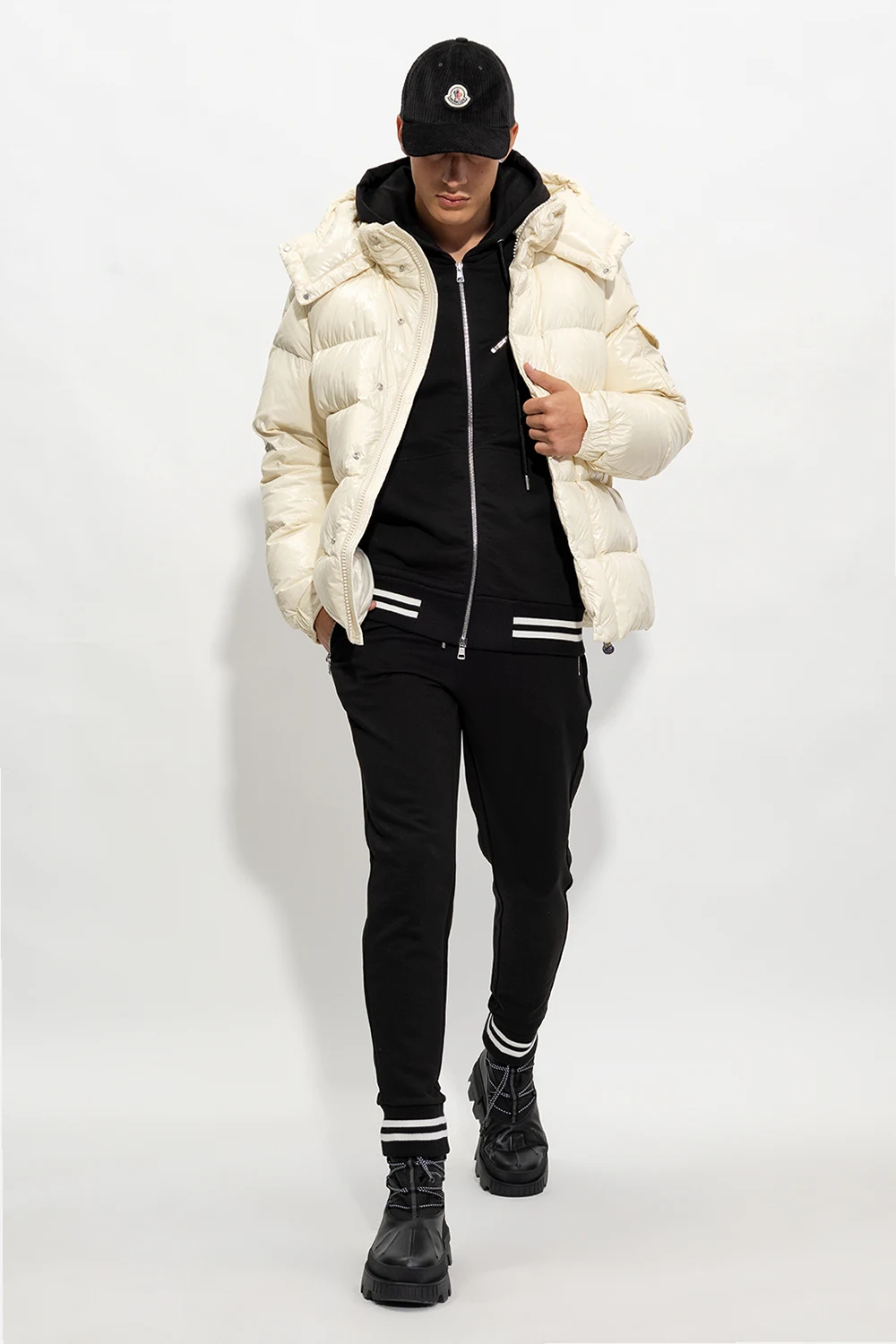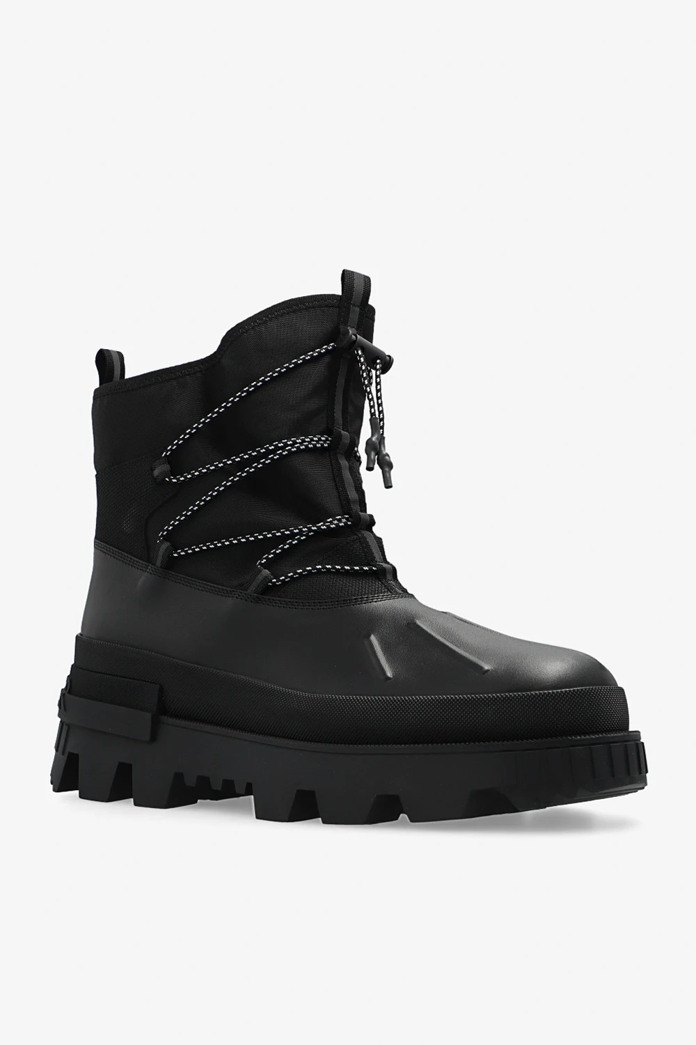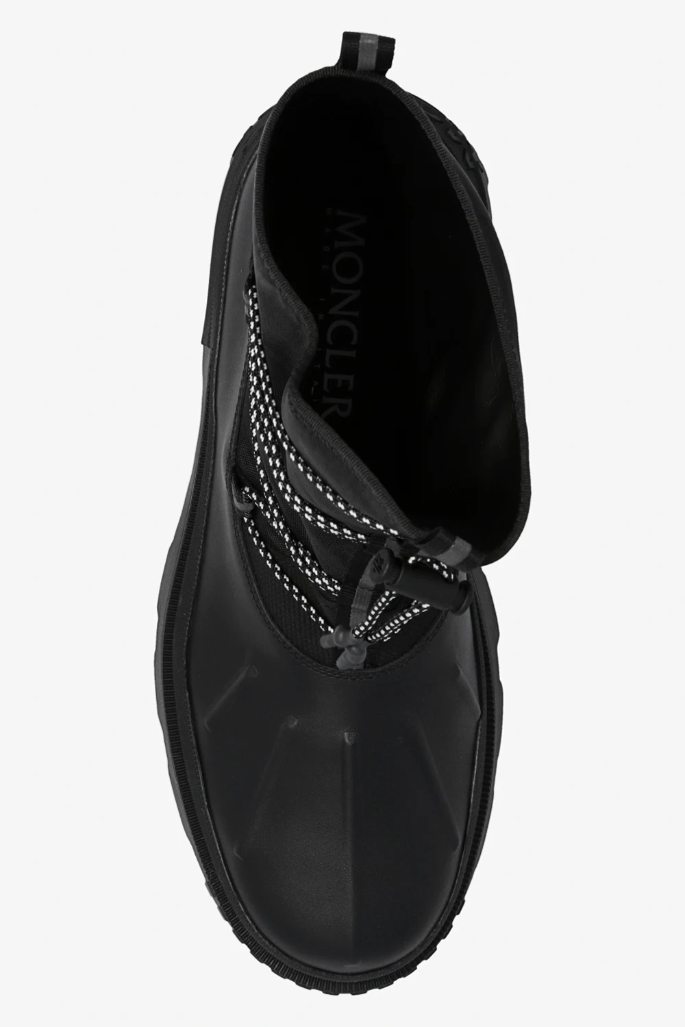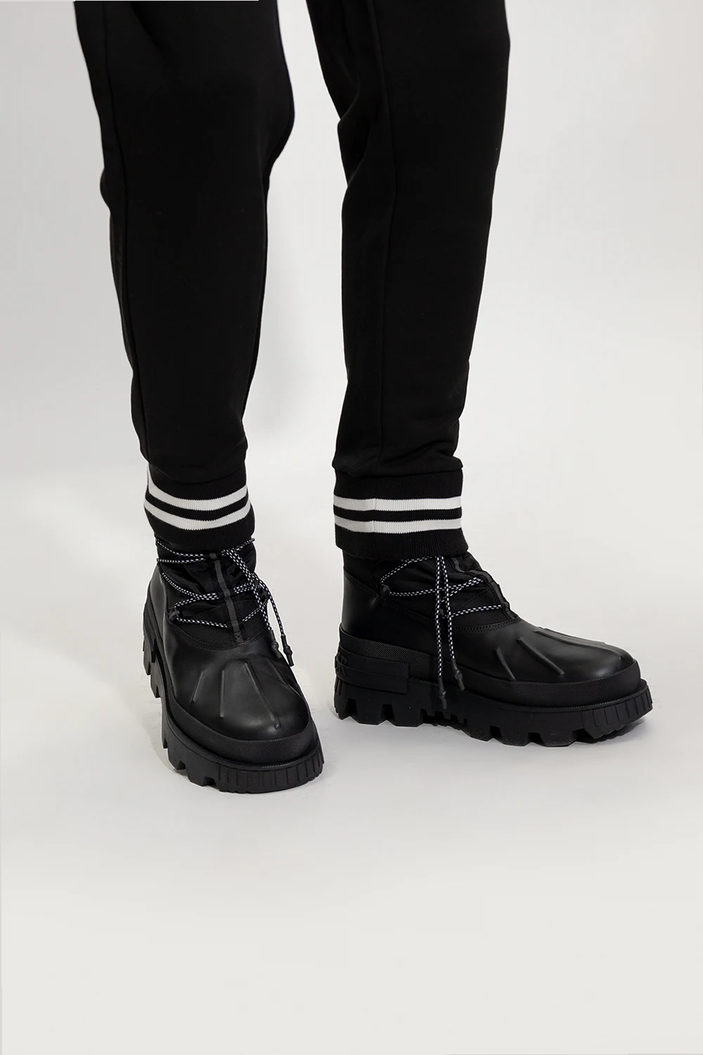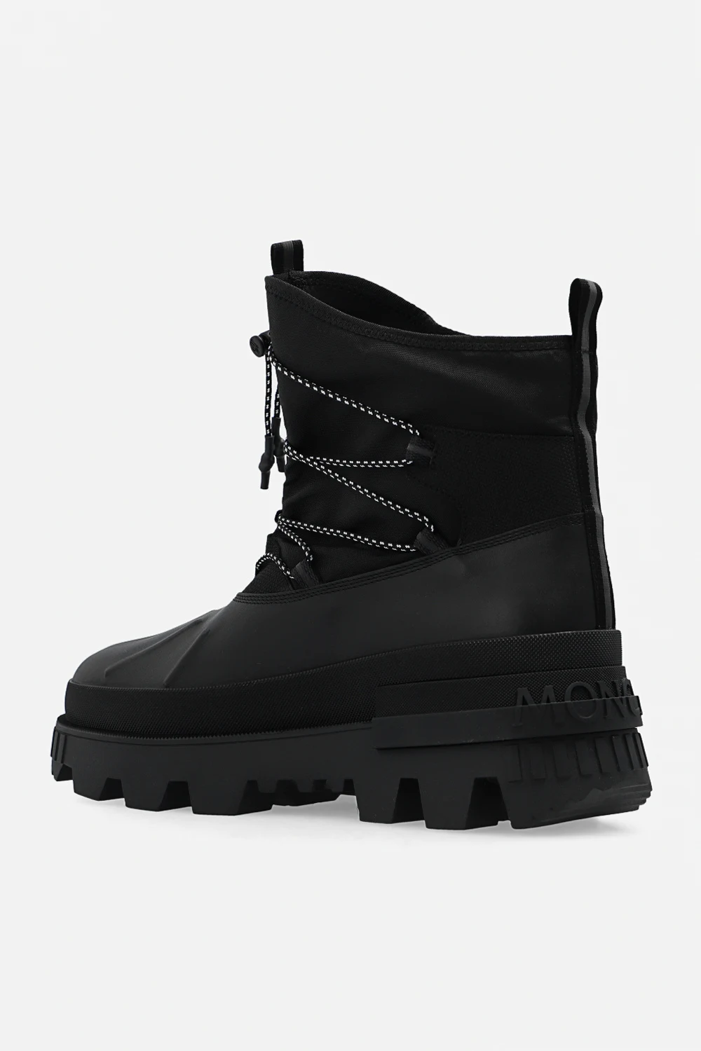 Czarne śniegowce, model ‘Mallard’ Moncler. Wykonane ze skóry i wykończone materiałem. Z przodu sznurowane i ściągane trokami. Dekoracyjne, odblaskowe nadruki. Czarna, masywna podeszwa wykonana z gumy i ozdobiona z tyłu logo.