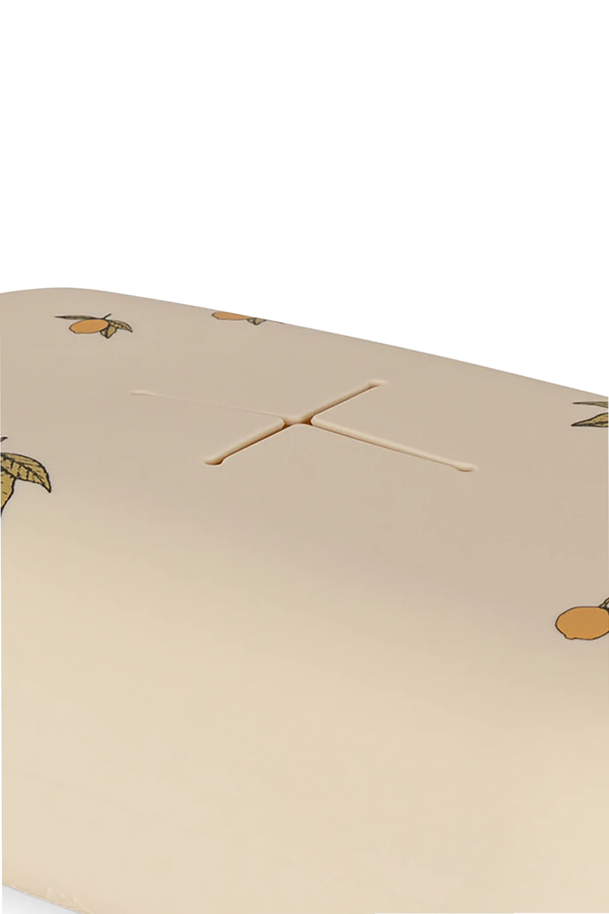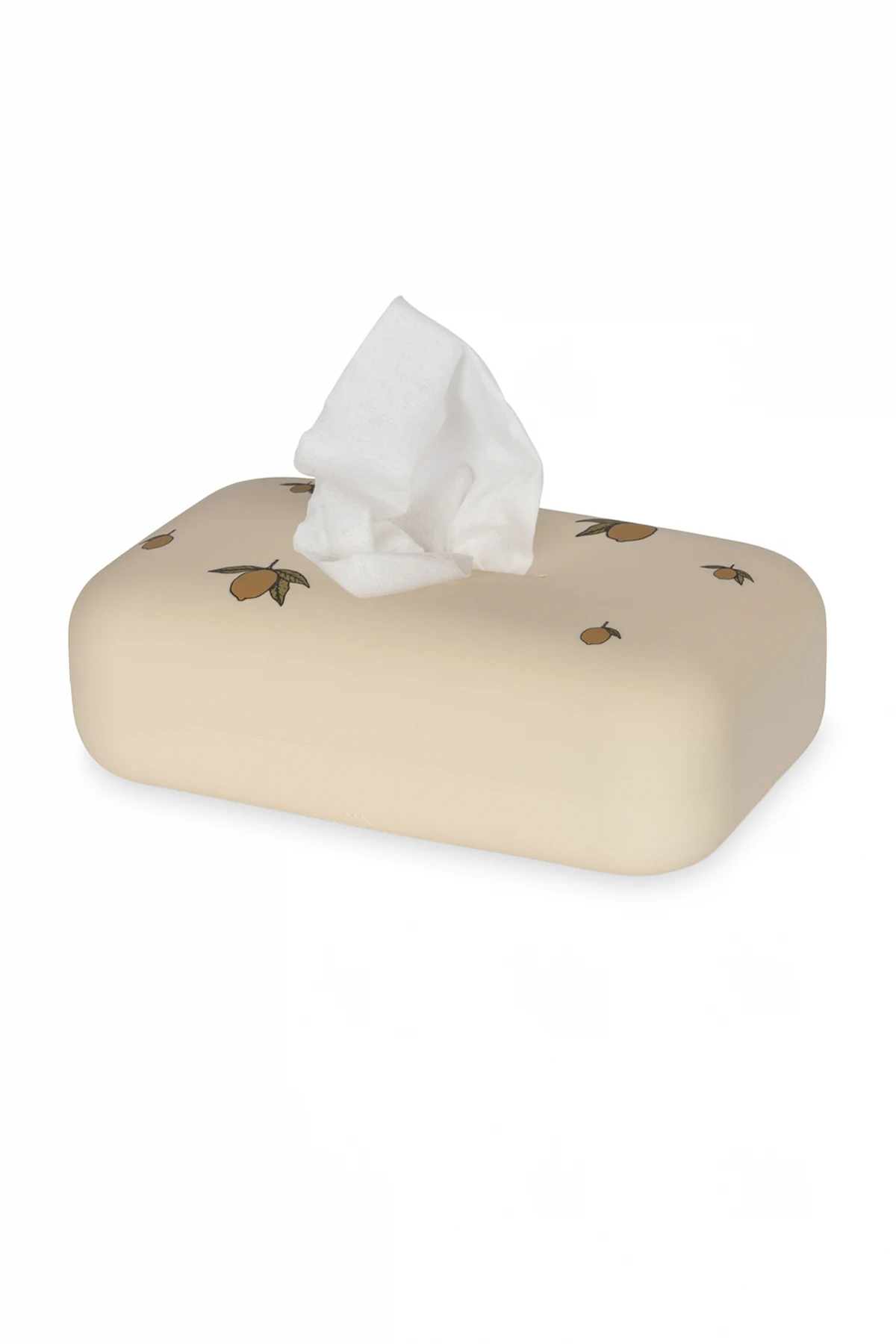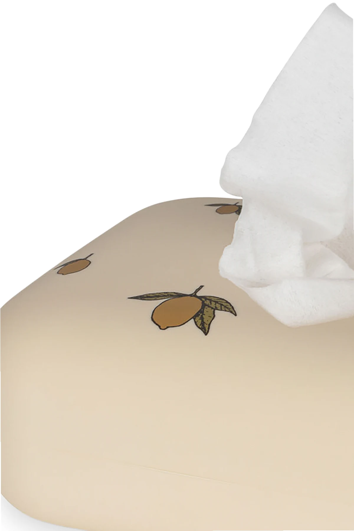 Kremowe, silikonowe etui na mokre chusteczki Konges Slojd. Ozdobione żółto-zielonym wzorem z motywem cytryn.