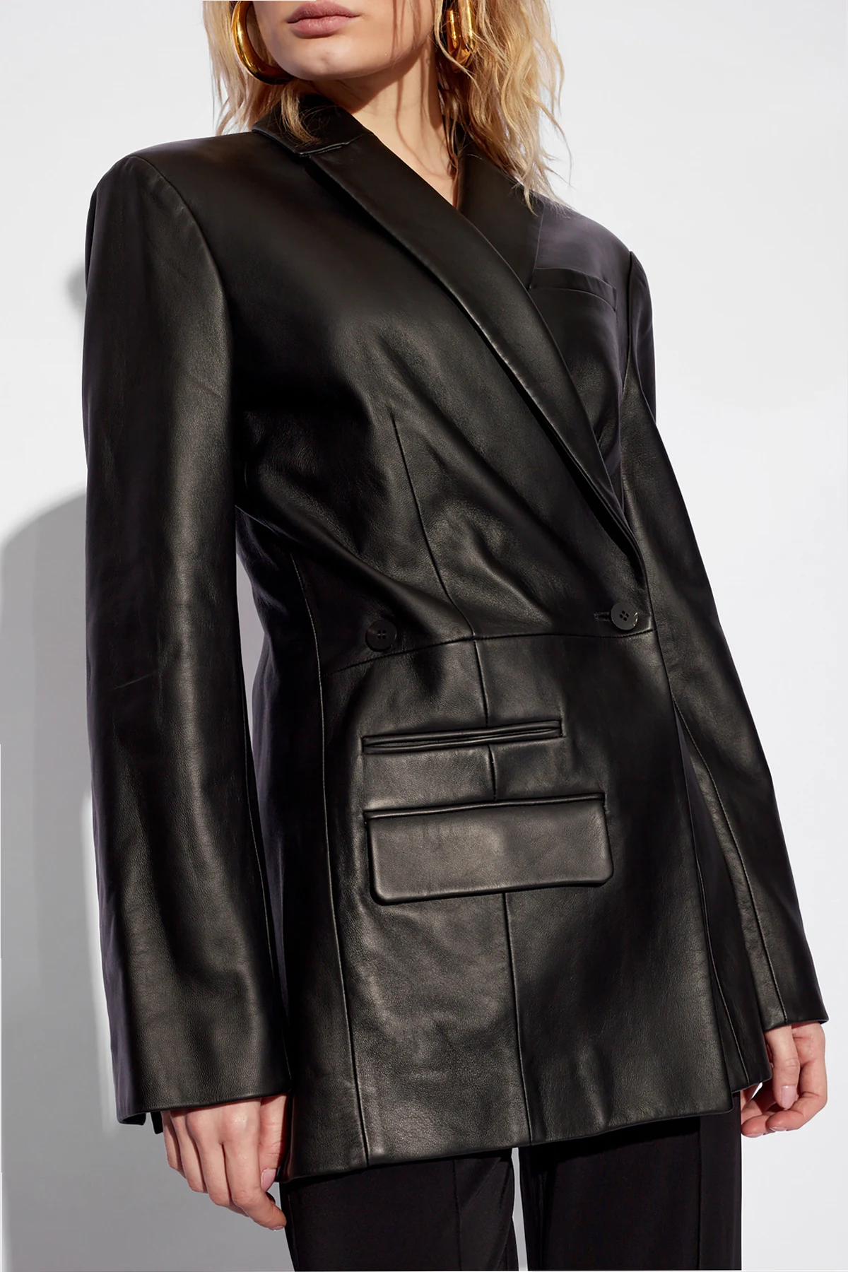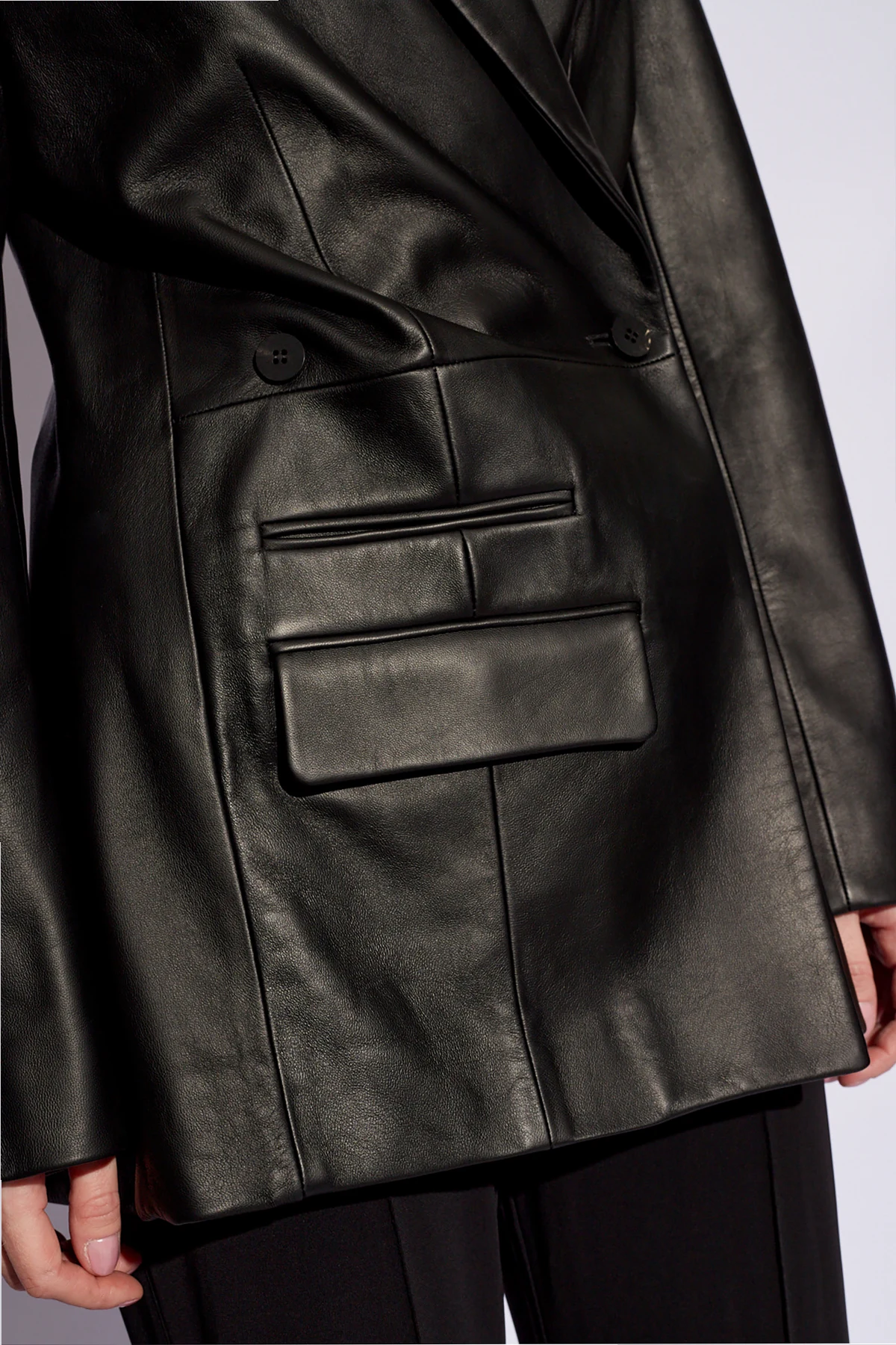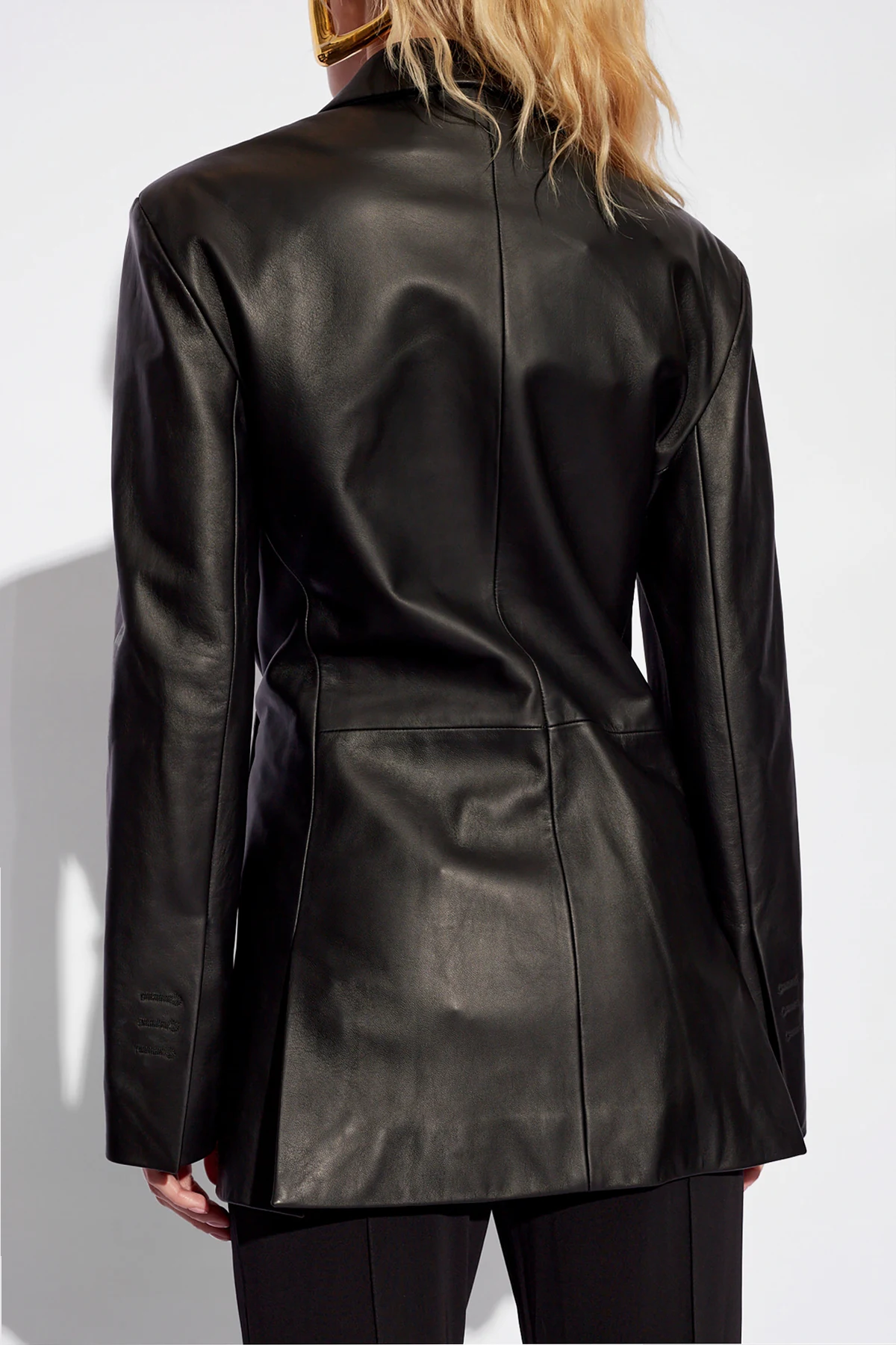 Ten wyjątkowy model wykonany z najwyższej jakości 100% skóry jagnięcej zachwyca swoją połyskliwą i gładką teksturą, co świadczy o niebywałej dbałości o detale. Precyzyjne szwy, rękawy o eleganckim kształcie oraz gładki tył marynarki podkreślają jej ekskluzywny charakter. Klasyczny krój z ostrymi kantami oraz szerokie klapy kołnierza nadają sylwetce wyjątkowej harmonii, zaś unikatowe zapięcie na jeden przycisk dodaje całości wyrafinowanego minimalizmu.