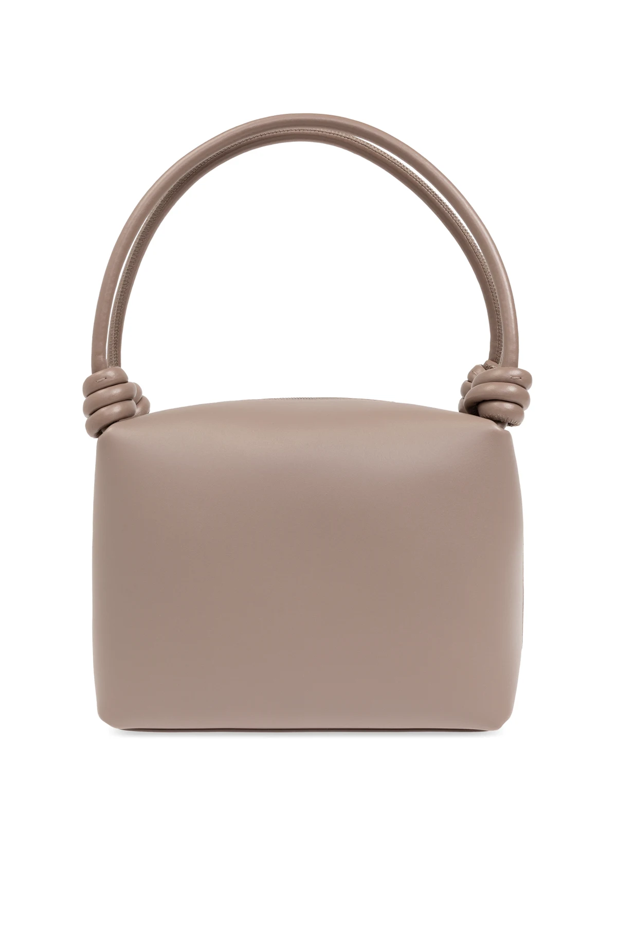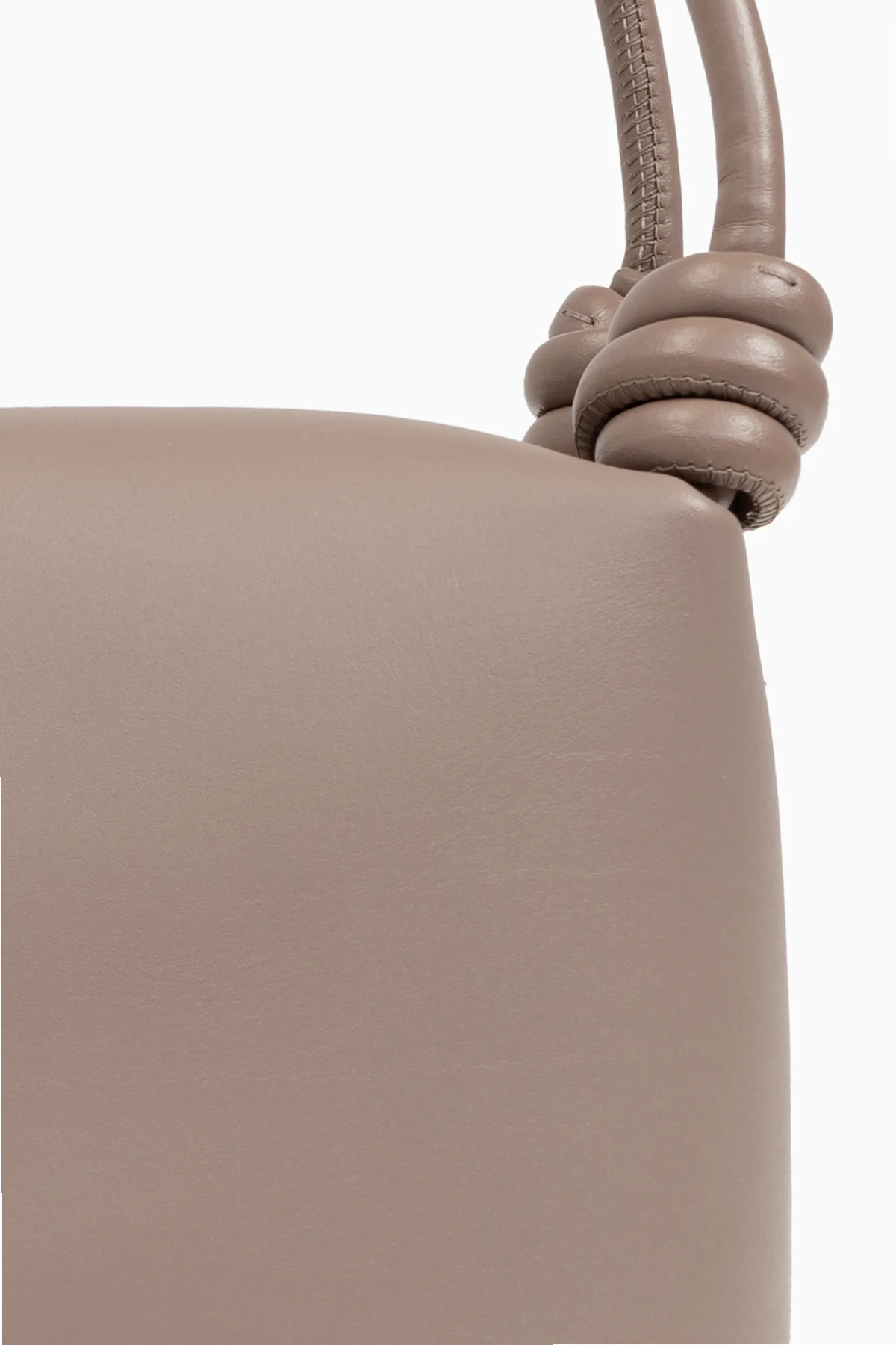 Wykonana z najwyższej jakości gładkiej skóry, prezentuje się w subtelnym, jasnobrązowym odcieniu taupe. Jej minimalistyczny design podkreśla brak wzorów, a subtelne srebrne logo projektanta na przodzie torby dodaje jej prestiżu.