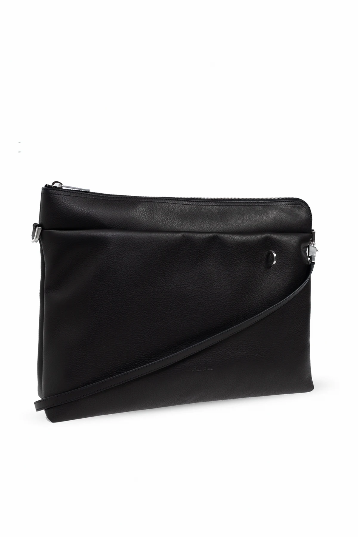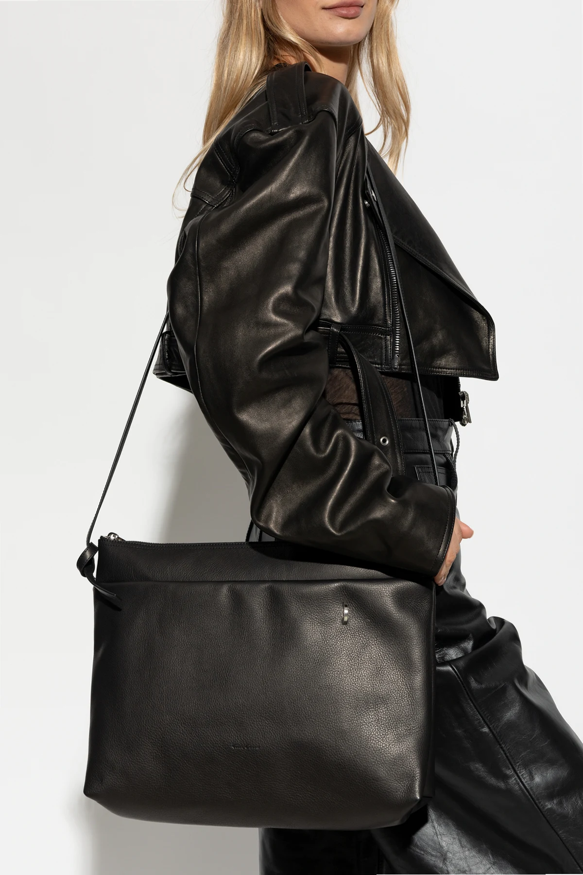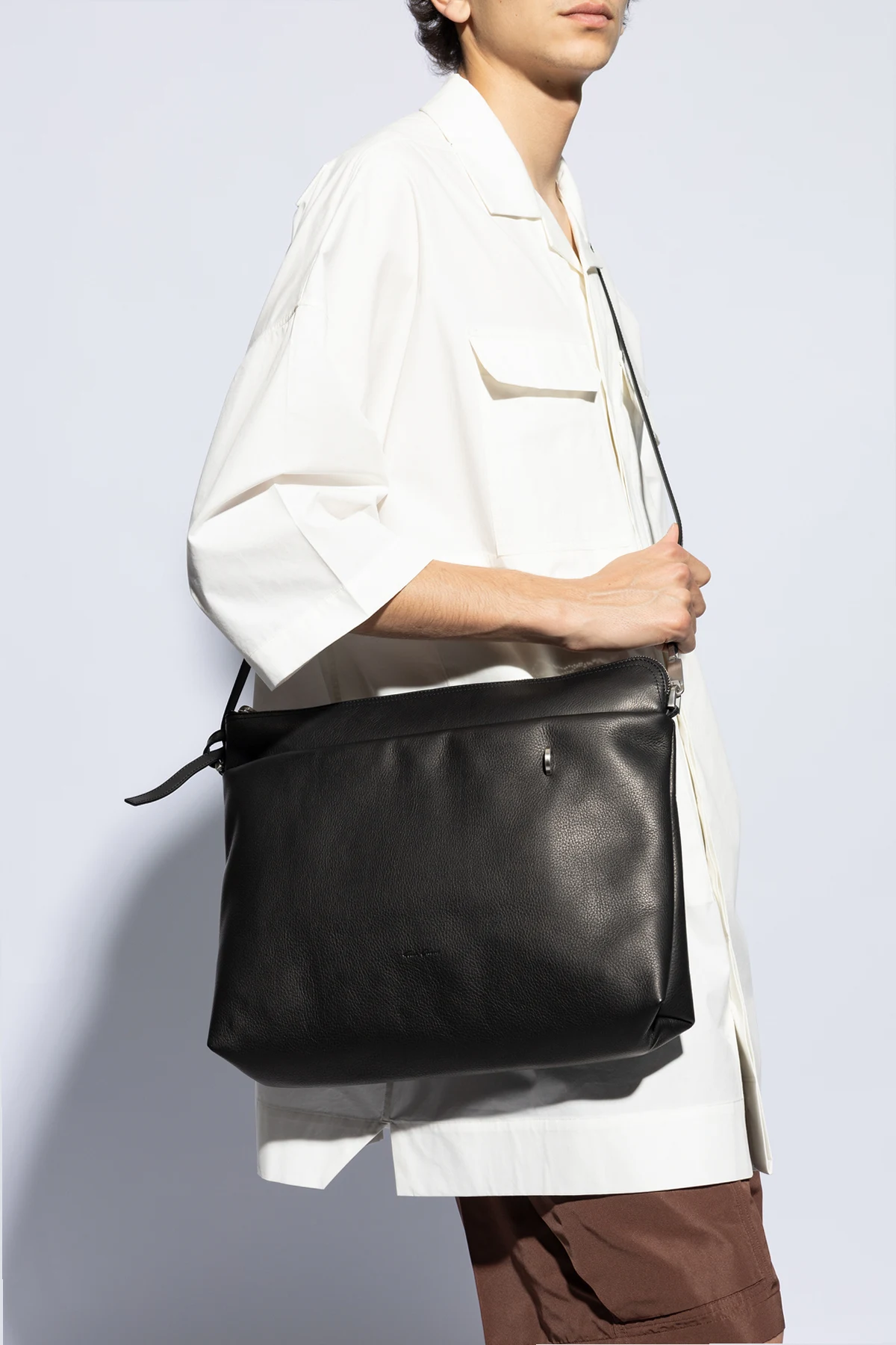 Ekskluzywna torba na ramię "Big Adri" , zaprojektowana przez uznawanego na arenie międzynarodowej Ricka Owensa , jest kwintesencją ponadczasowej elegancji i funkcjonalności. Wykonana z najwyższej jakości skóry naturalnej w kolorze głębokiej czerni, prezentuje się jako symbol trwałości i luksusu. Jej unikatowy kształt prostokąta z lekko zaokrąglonymi rogami, ozdobiony asymetryczną klapą, przyciąga wzrok, dodając charakteru i nowoczesności.