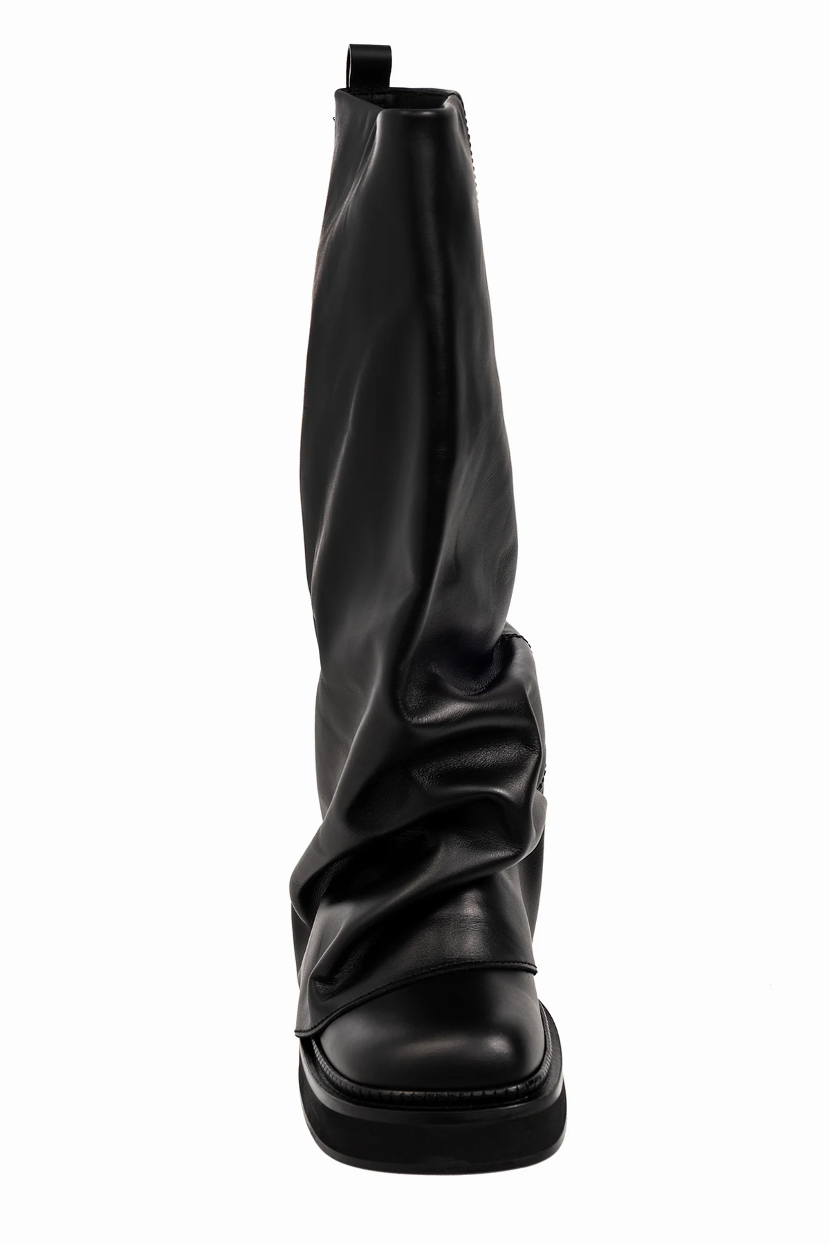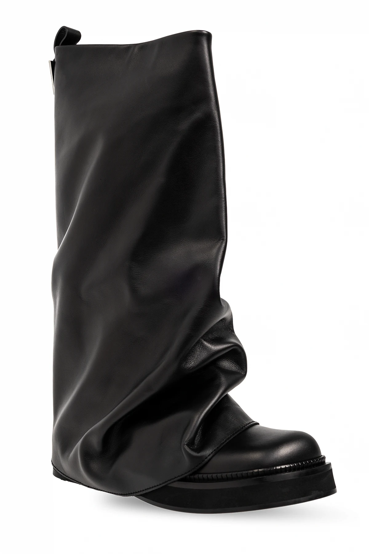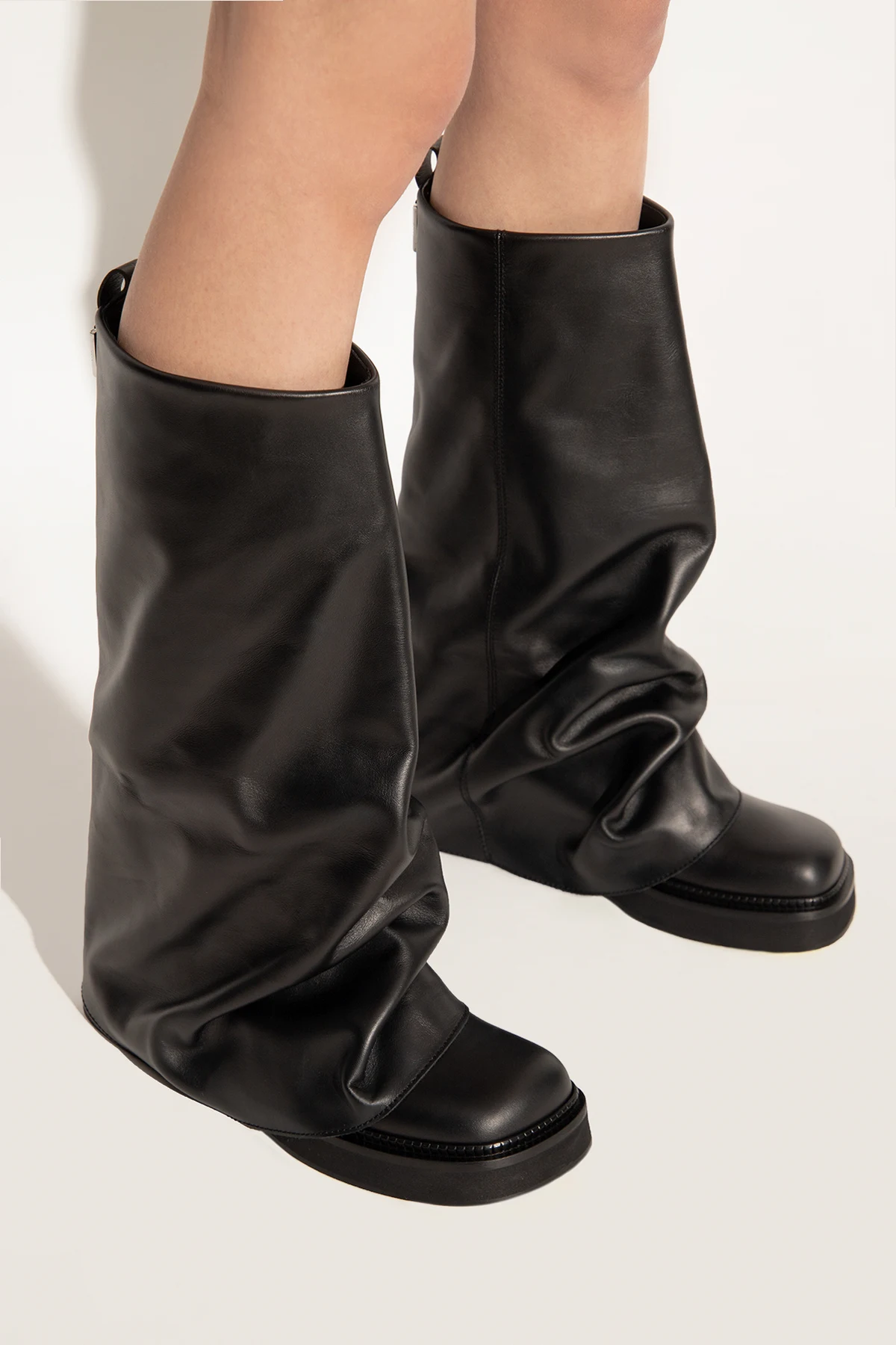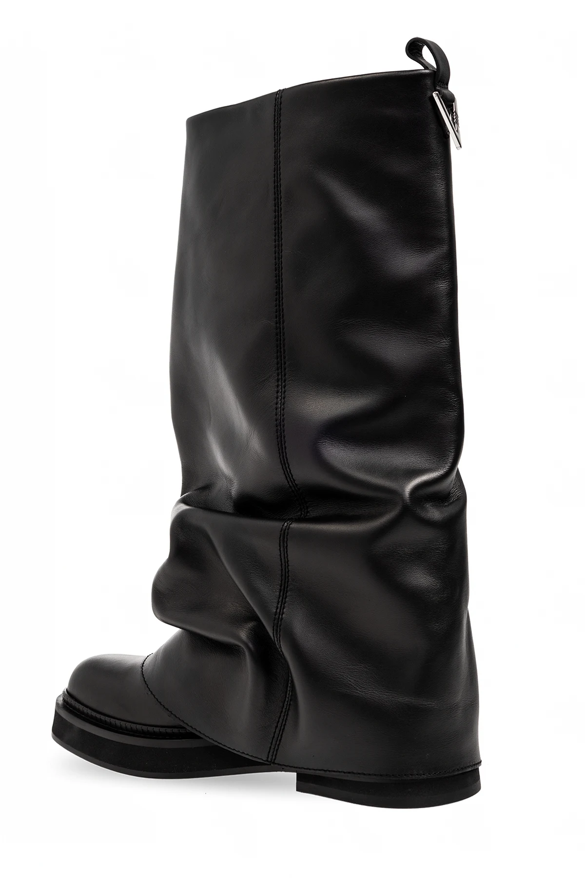 Czarne, wsuwane kozaki, model 'Robin’ The Attico. Wykonane z gładkiej skóry. Kwadratowy nosek. Z tyłu metalowa aplikacja w kształcie logo w kolorze srebrnym. Czarna, skórzana podeszwa wykończona gumą.