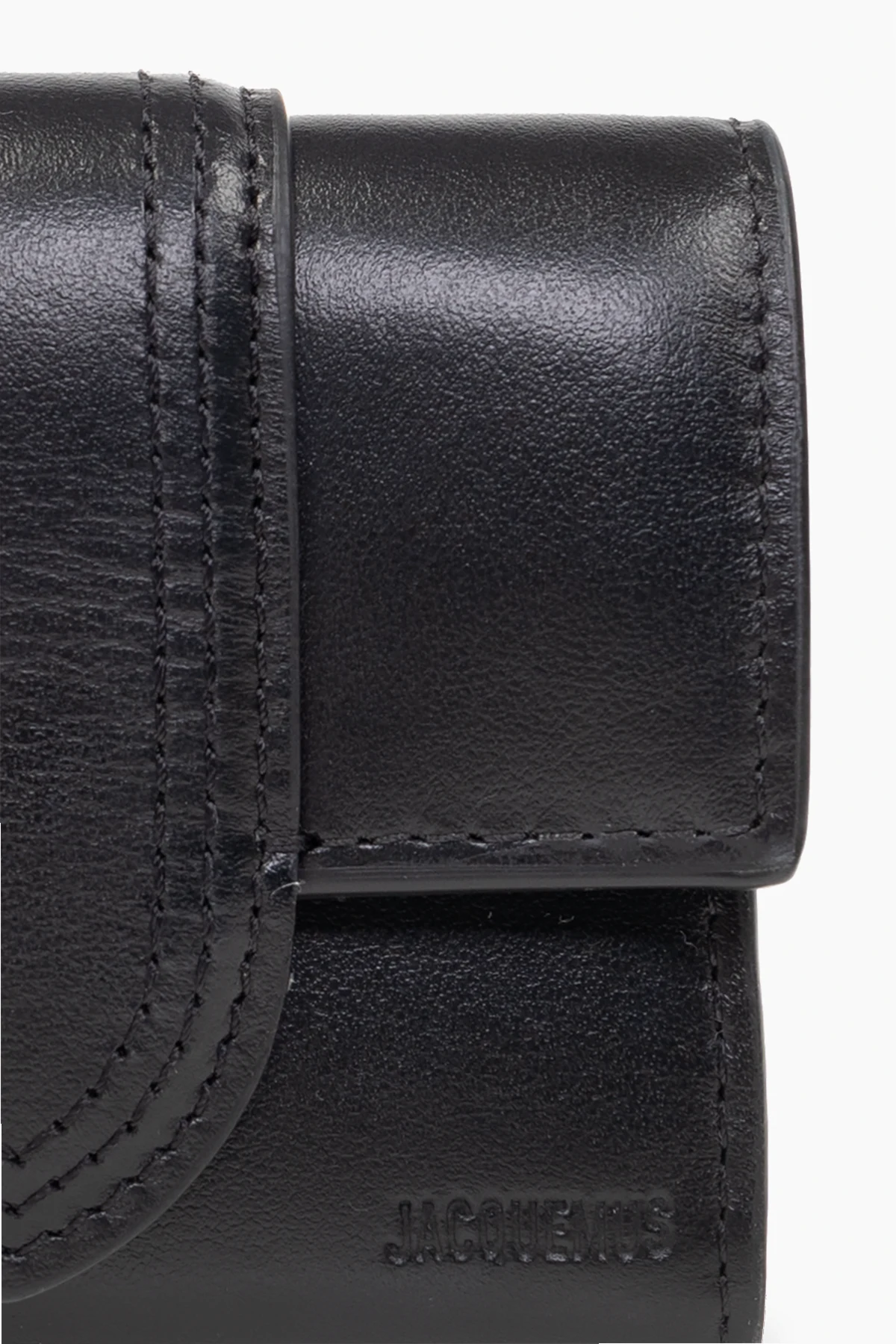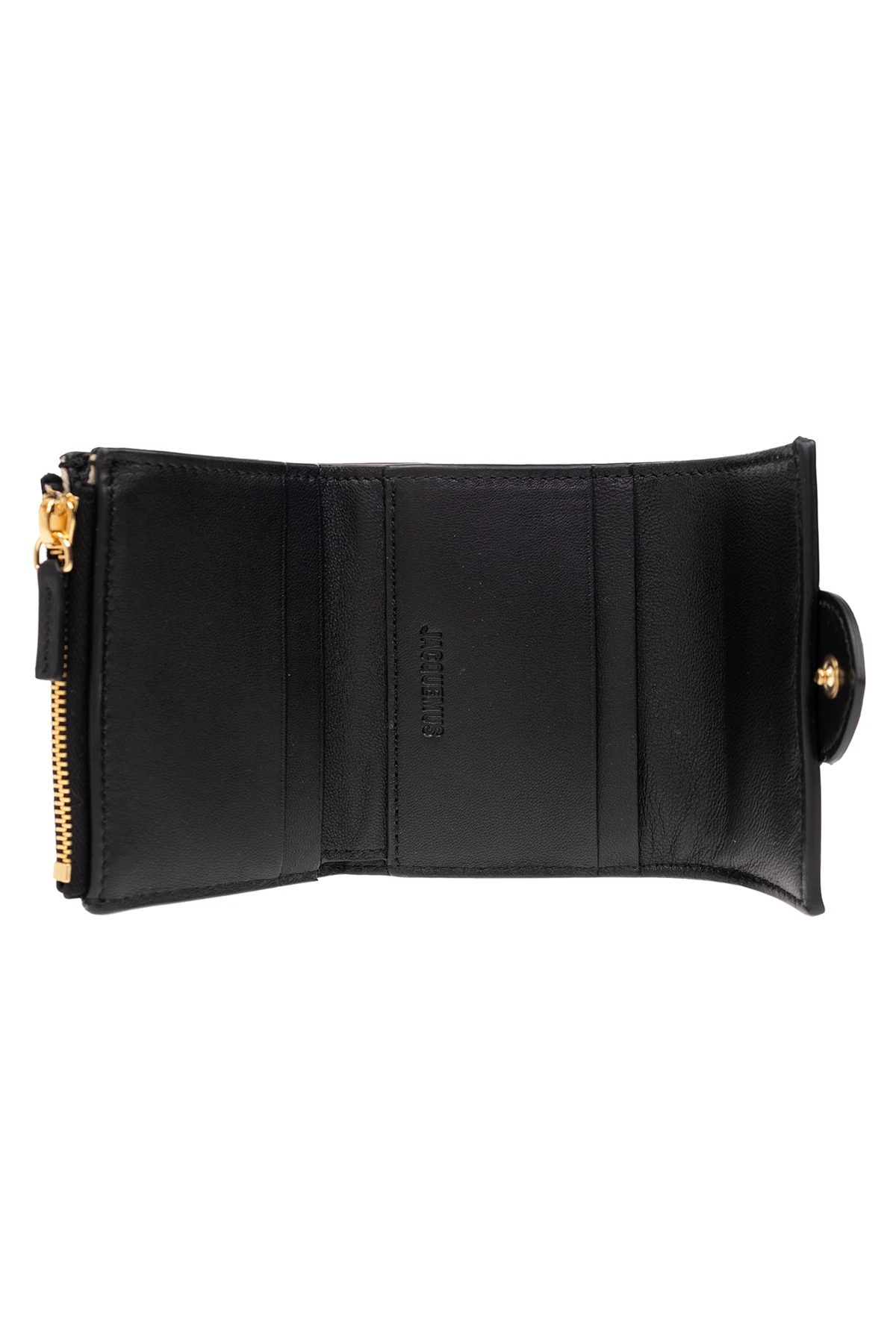 Czarny portfel, model 'Le Compact Bambino' Jacquemus. Wykonany ze skóry. Zamykany na zatrzask. Z przodu ozdobiony wytłoczonym logo. Z tyłu wsuwana kieszeń. Wewnątrz kieszeń na monety zamykana na zamek, przegroda na banknoty i cztery miejsca na karty.
